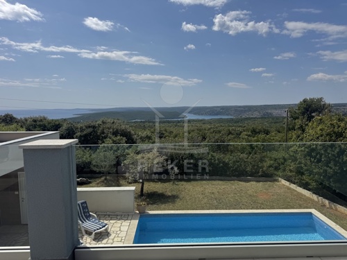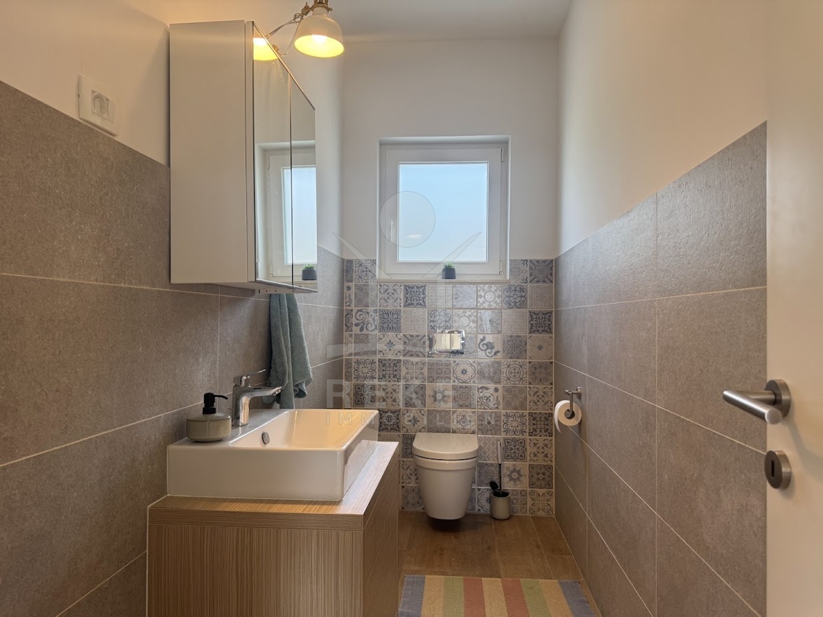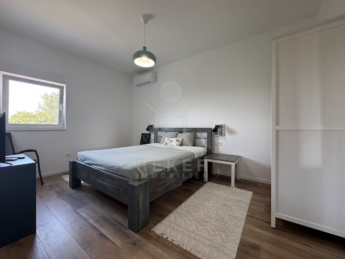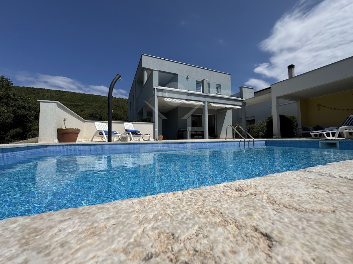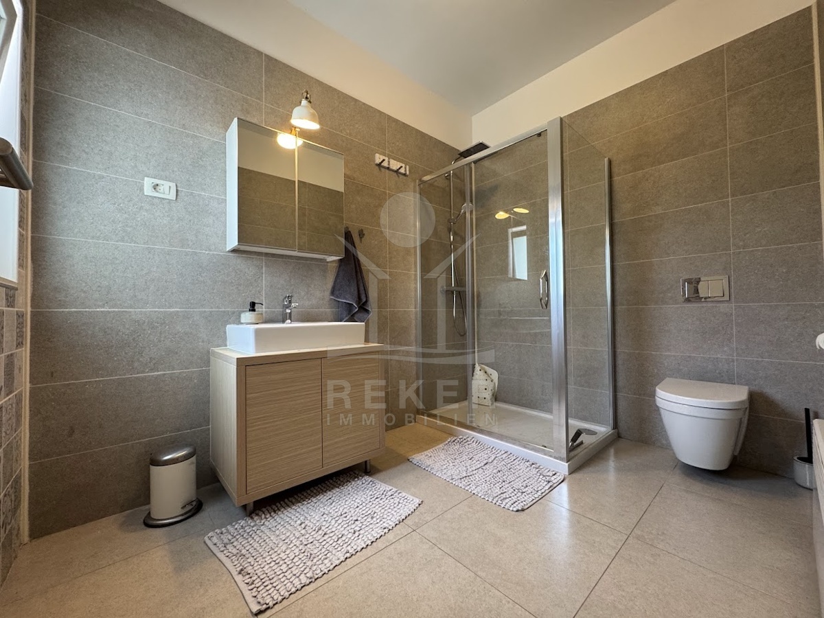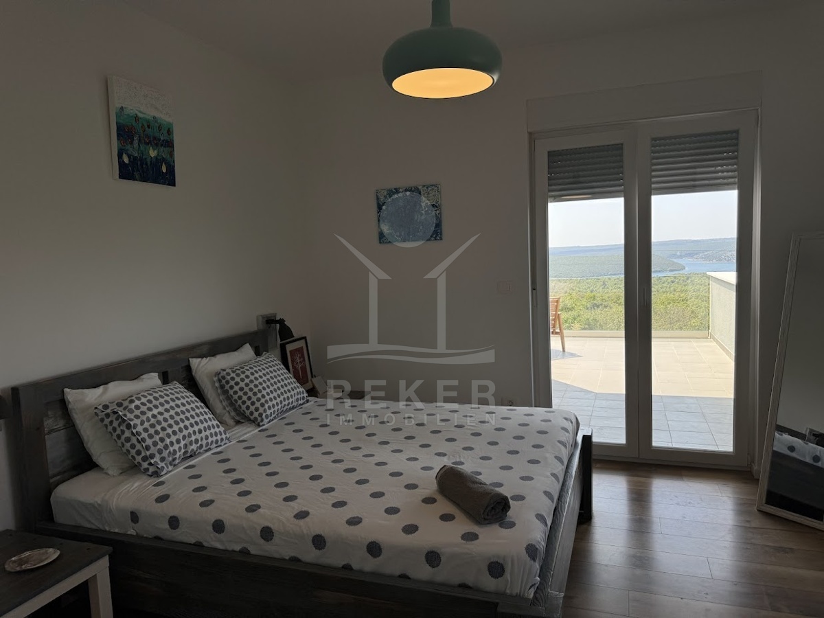 Im idyllischen Ort Viškovići in der Gemeinde Raša steht diese moderne Villa mit offenem Meerblick. Ruhig eingebettet in grüne Natur und nur rund 2 Kilometer von der Bucht Tunarica entfernt, verbindet sie Ruhe, Privatsphäre und Nähe zum Meer. Die Umgebung ist geprägt von Wäldern, mediterraner Vegetation und klarer Luft. Durch die Hanglage genießen Sie Sonne und Aussicht bis zum Horizont. Die Zufahrt ist bequem, das Umfeld gepflegt und nahezu frei von Verkehr.