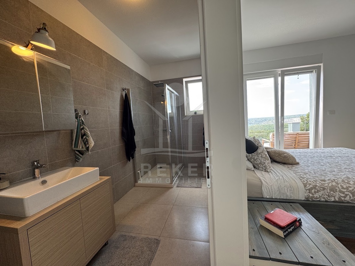 Die Villa verfügt über 188 m² Wohnfläche und wurde 2019 in moderner Architektur errichtet. Im Erdgeschoss befinden sich der offene Wohn- und Essbereich mit Küche, Holzofen, Speisekammer, Abstellraum und Gäste-WC. Schon von hier aus reicht der Blick über das Meer. Das Obergeschoss beherbergt drei Schlafzimmer mit Doppelbetten und TV, zwei Badezimmer sowie den Balkon mit Weitblick.