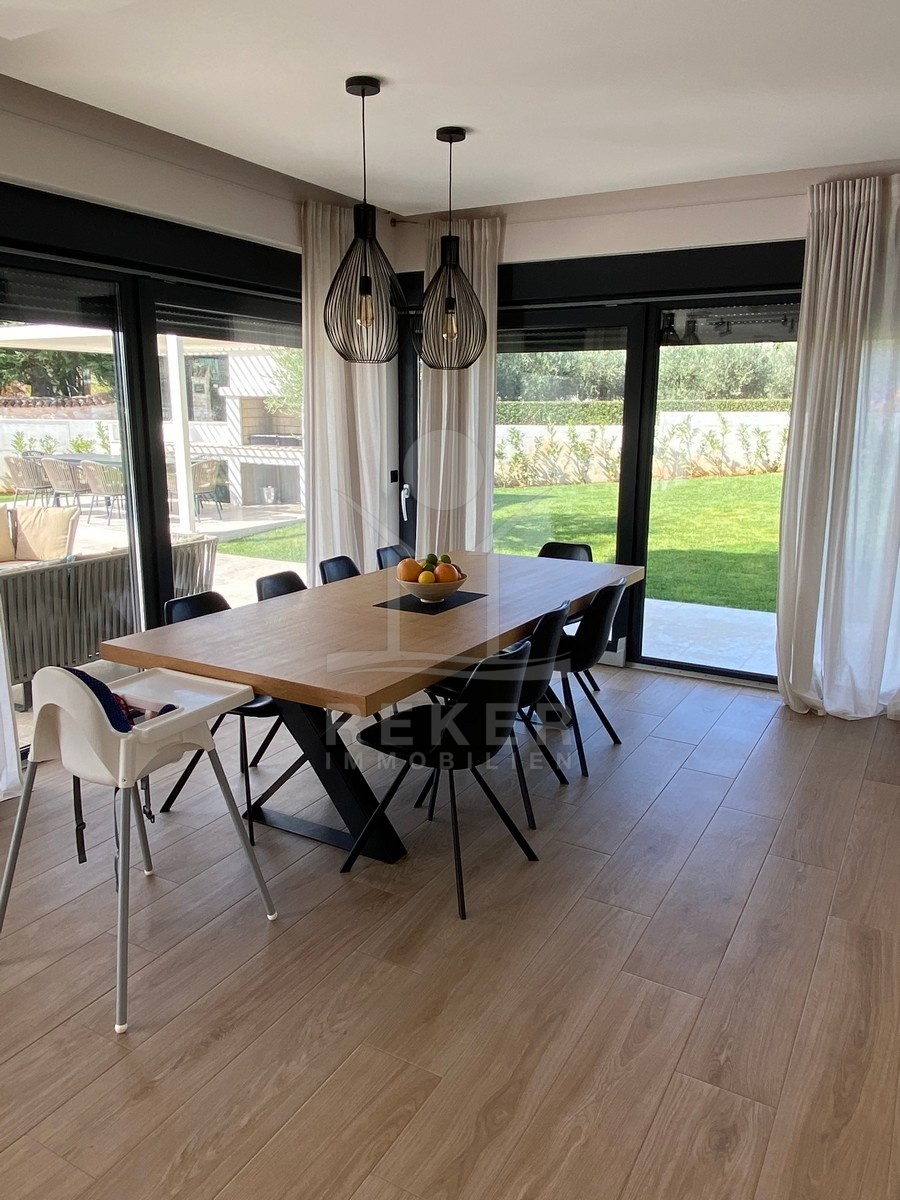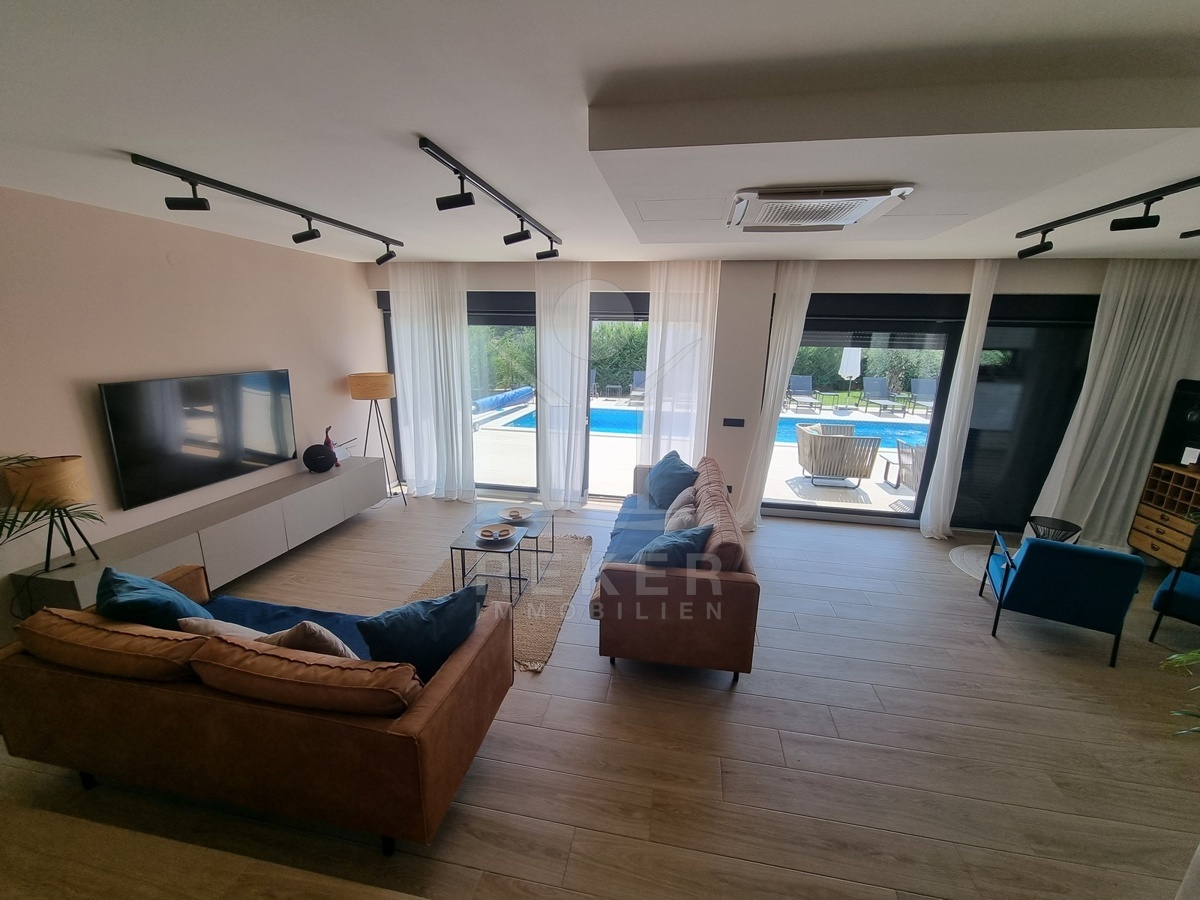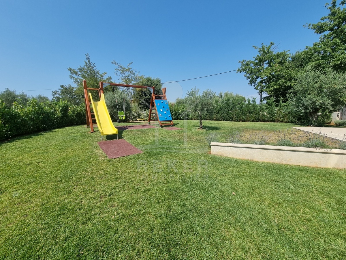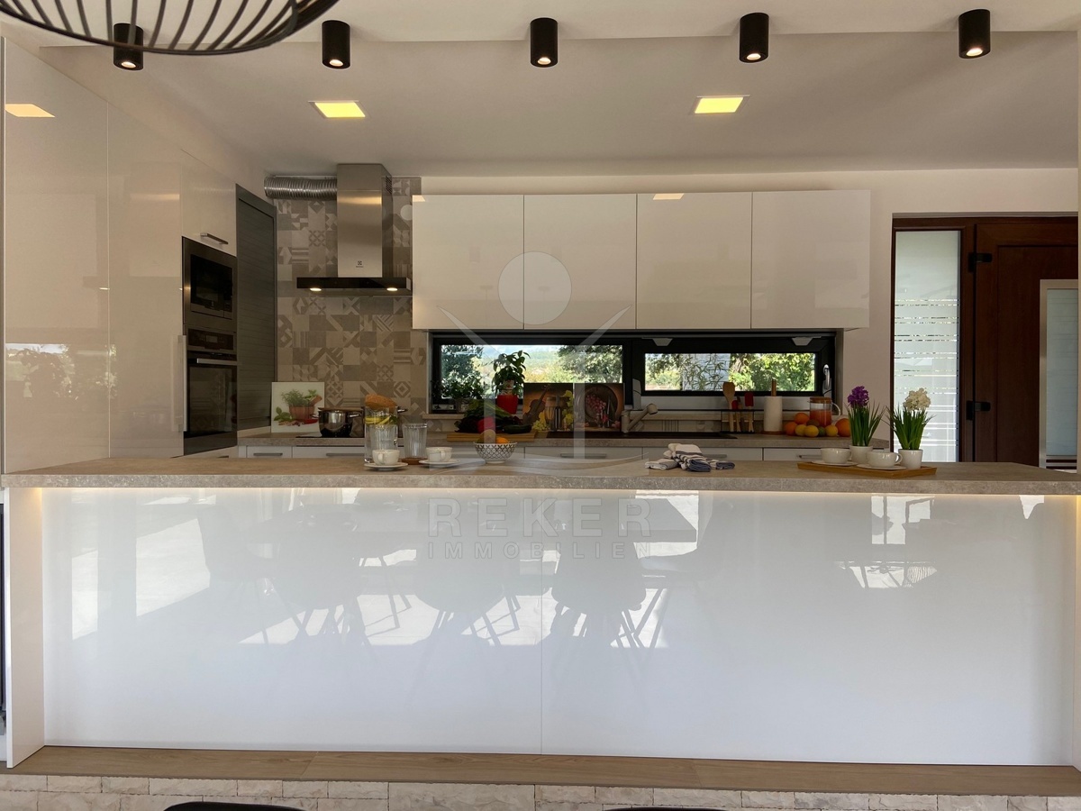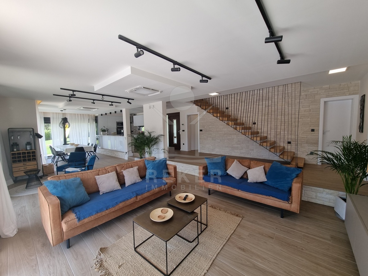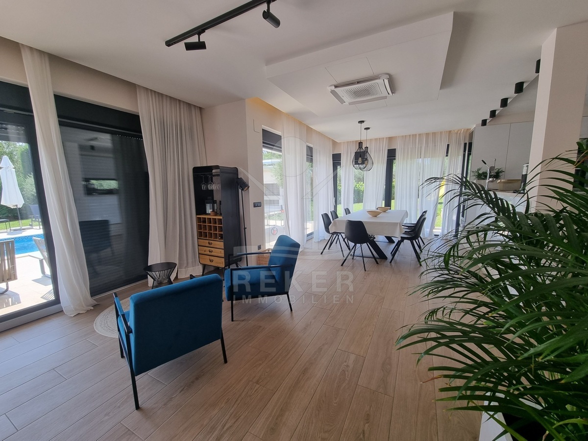 Zwischen Poreč und Višnjan liegt dieses moderne Haus in einer wunderbar ruhigen Umgebung. Hier gibt es kaum Nachbarn, dafür umso mehr Natur. Wiesen, Wälder und viel Grün schaffen ein Gefühl von Freiheit. Wer Rückzug und Entspannung sucht, ist hier genau richtig. Bis zur Küste sind es nur zehn Minuten mit dem Auto – ideal für Tagesausflüge ans Meer. Gleichzeitig ist man weit genug entfernt vom Trubel, um die Ruhe in vollen Zügen zu genießen.