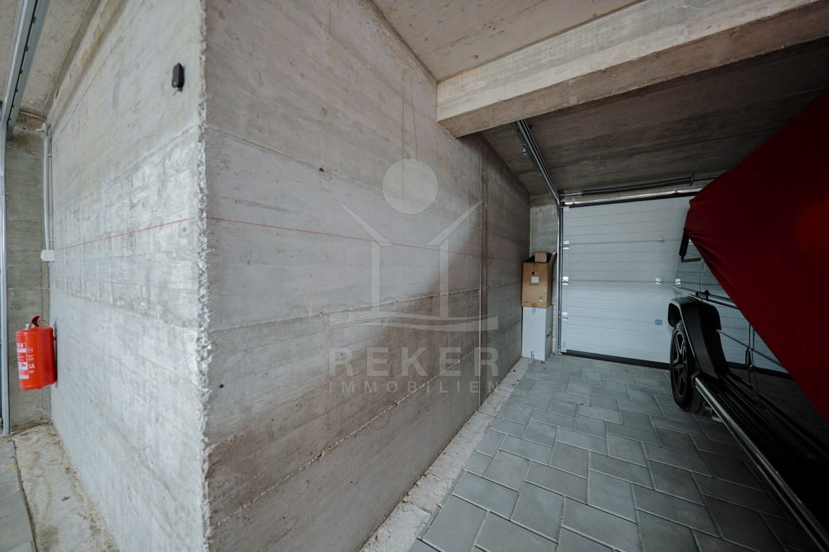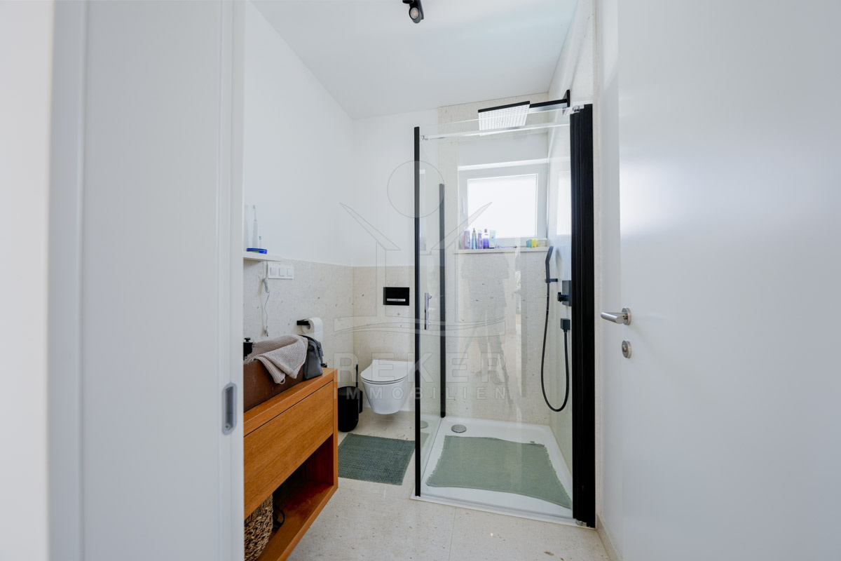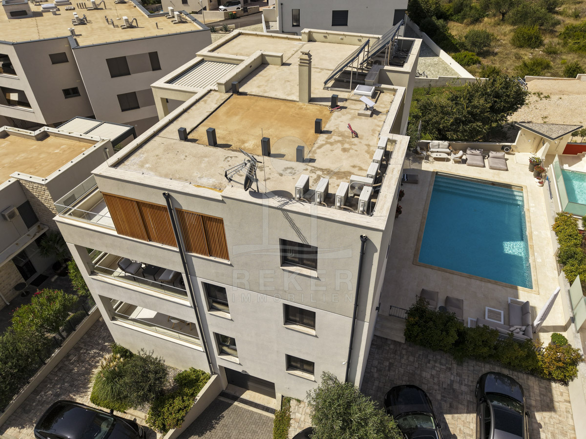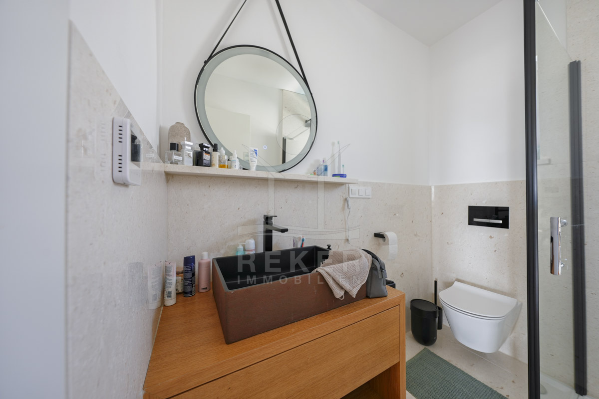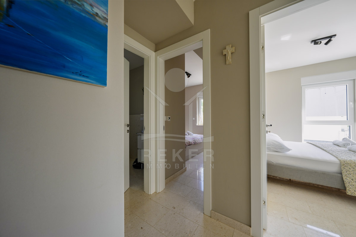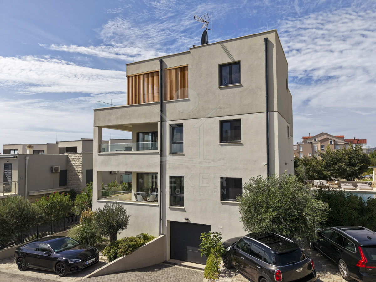 Die Neubauvilla aus dem Jahr 2023 befindet sich in einer ruhigen Wohngegend von Vodice, rund 500 Meter vom Meer entfernt. Sie wohnen abgeschirmt und dennoch nah an Strand und Zentrum. Aus den oberen Etagen reicht der Blick bis zum Meer. Sechs Stellplätze stehen zur Verfügung, zwei in der Garage, vier vor dem Haus. Praktisch bei mehreren Nutzern.