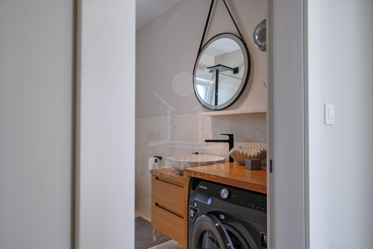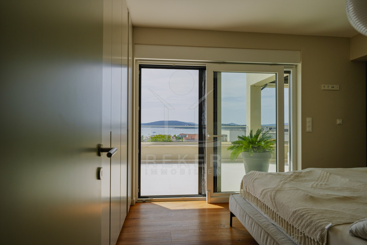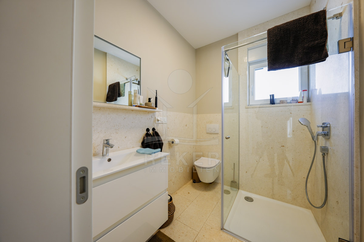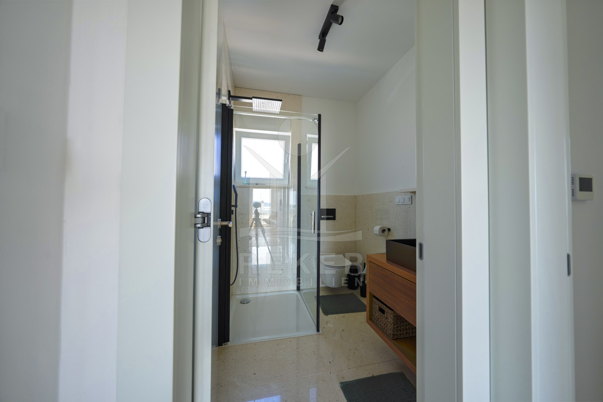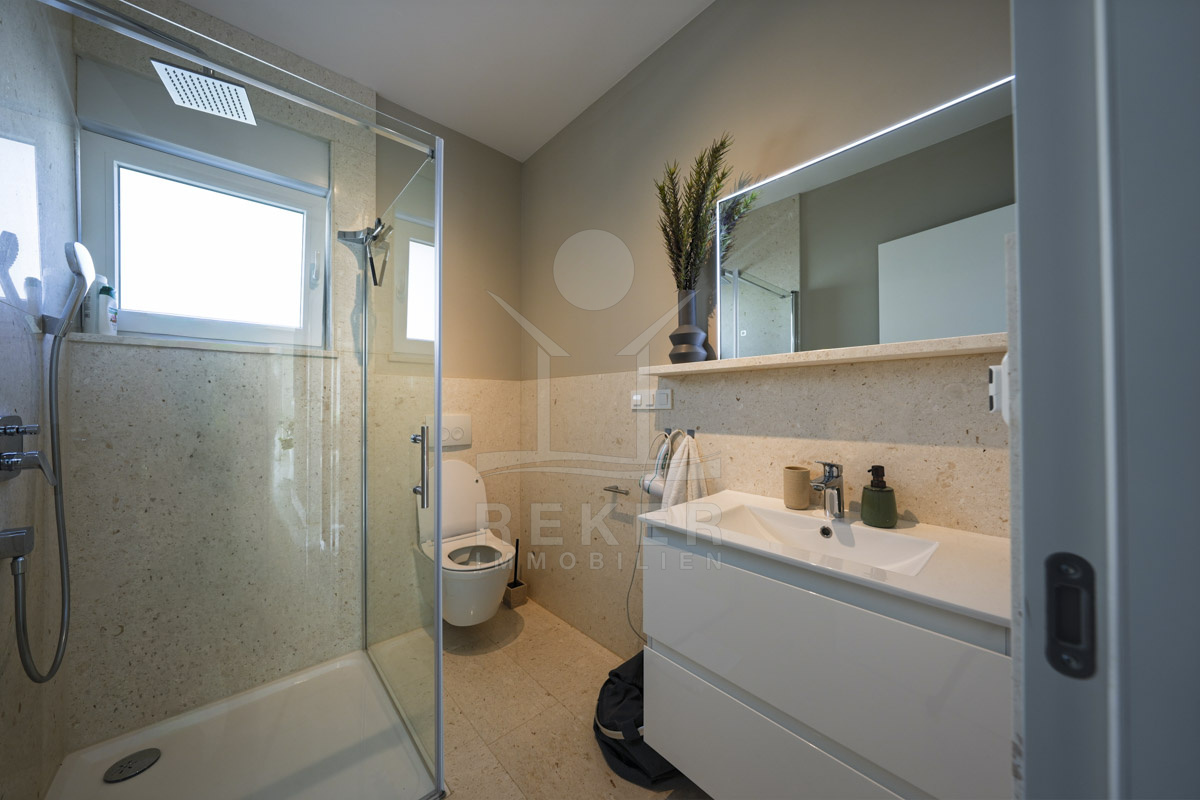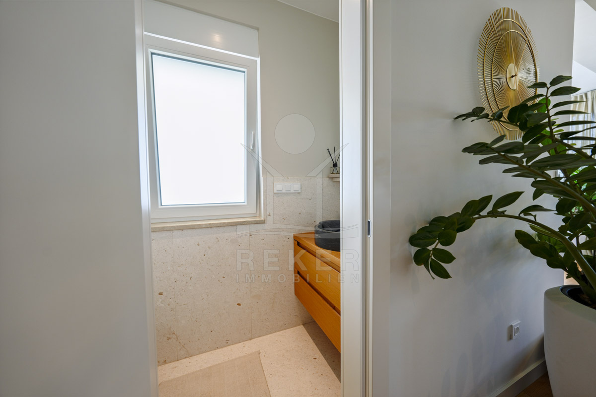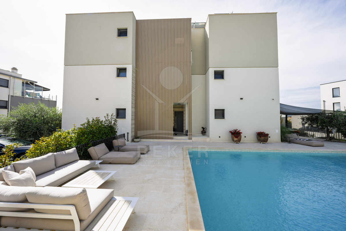 Die Neubauvilla aus dem Jahr 2023 befindet sich in einer ruhigen Wohngegend von Vodice, rund 500 Meter vom Meer entfernt. Sie wohnen abgeschirmt und dennoch nah an Strand und Zentrum. Aus den oberen Etagen reicht der Blick bis zum Meer. Sechs Stellplätze stehen zur Verfügung, zwei in der Garage, vier vor dem Haus. Praktisch bei mehreren Nutzern.