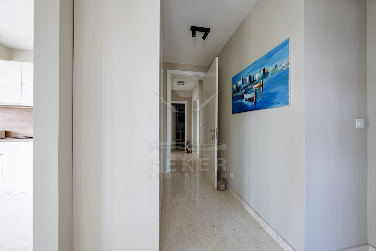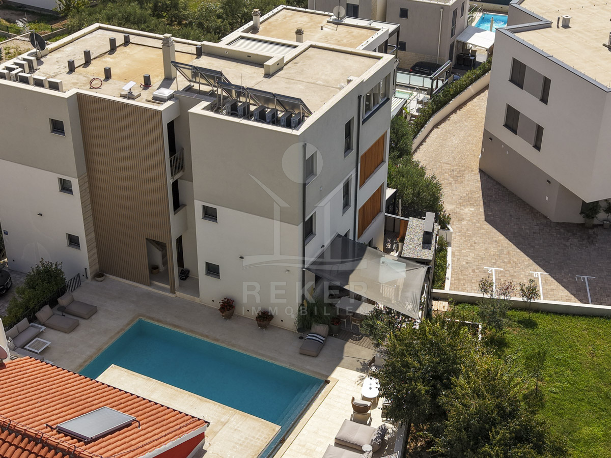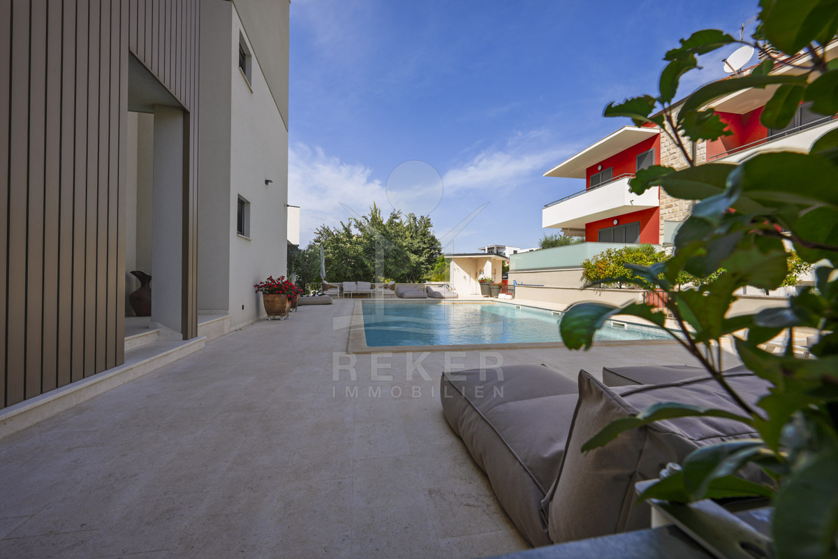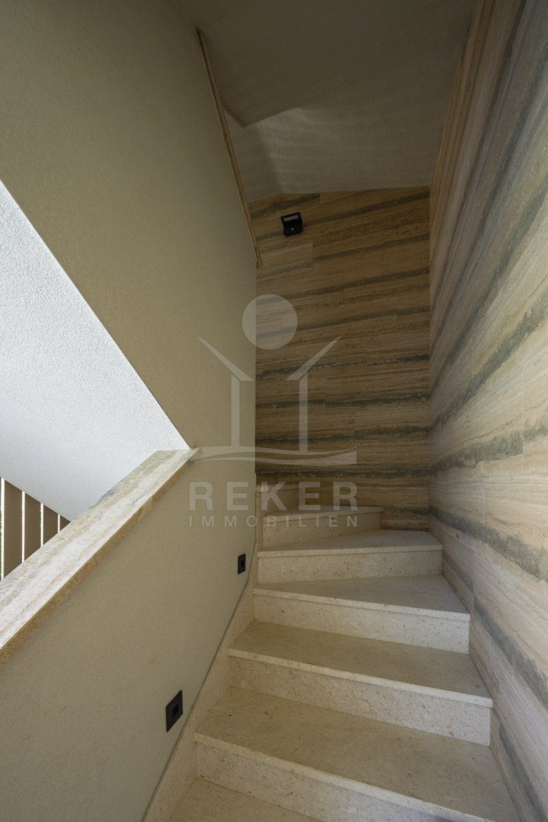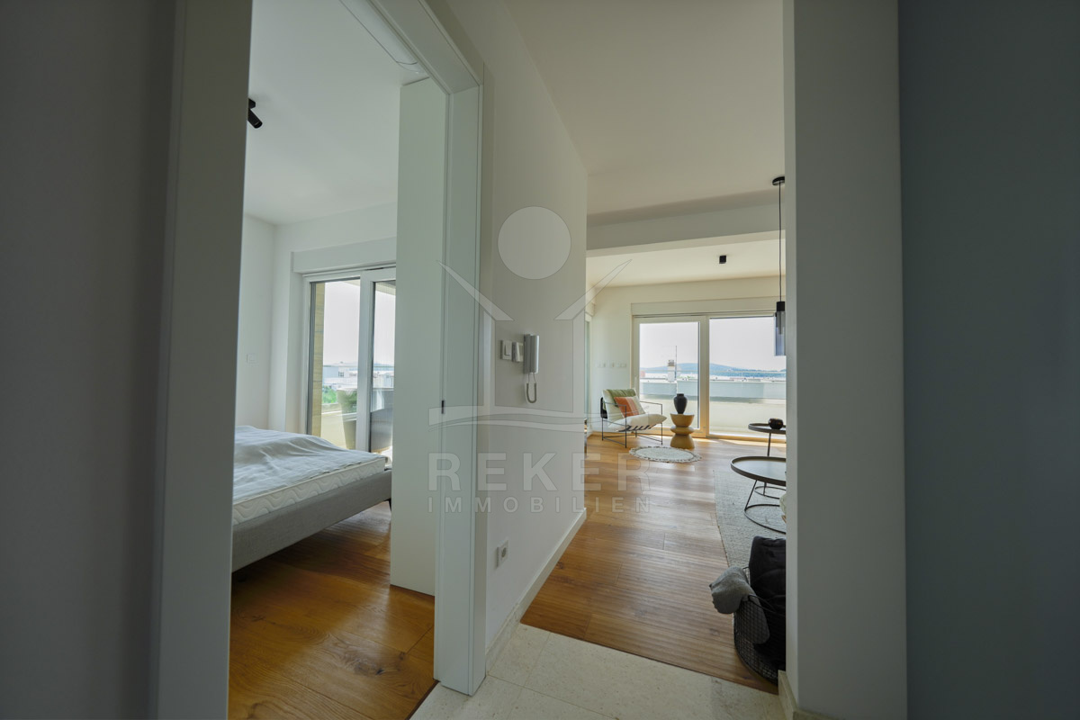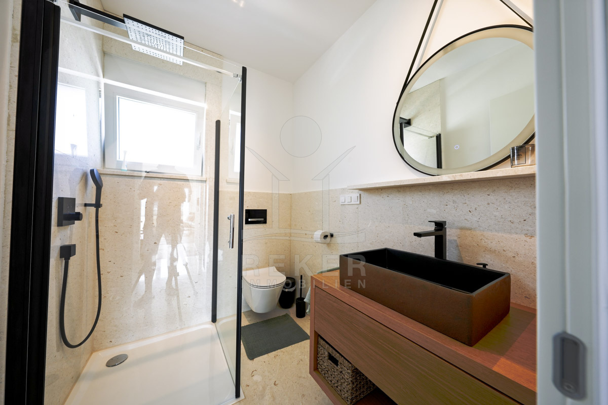 Die Neubauvilla aus dem Jahr 2023 befindet sich in einer ruhigen Wohngegend von Vodice, rund 500 Meter vom Meer entfernt. Sie wohnen abgeschirmt und dennoch nah an Strand und Zentrum. Aus den oberen Etagen reicht der Blick bis zum Meer. Sechs Stellplätze stehen zur Verfügung, zwei in der Garage, vier vor dem Haus. Praktisch bei mehreren Nutzern.