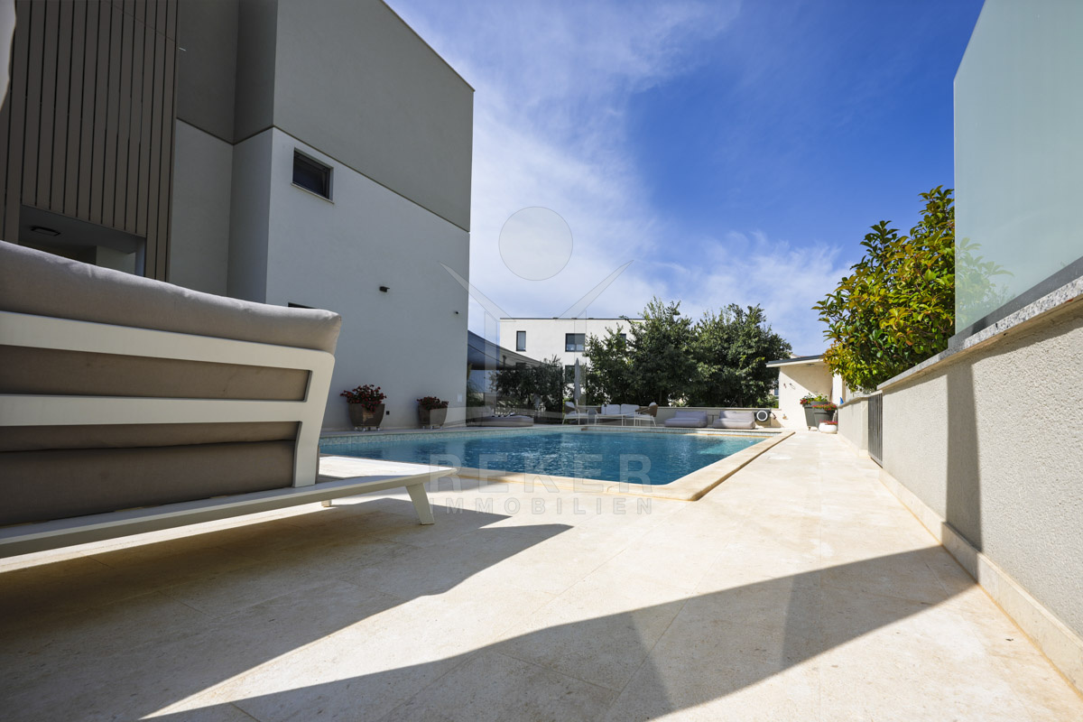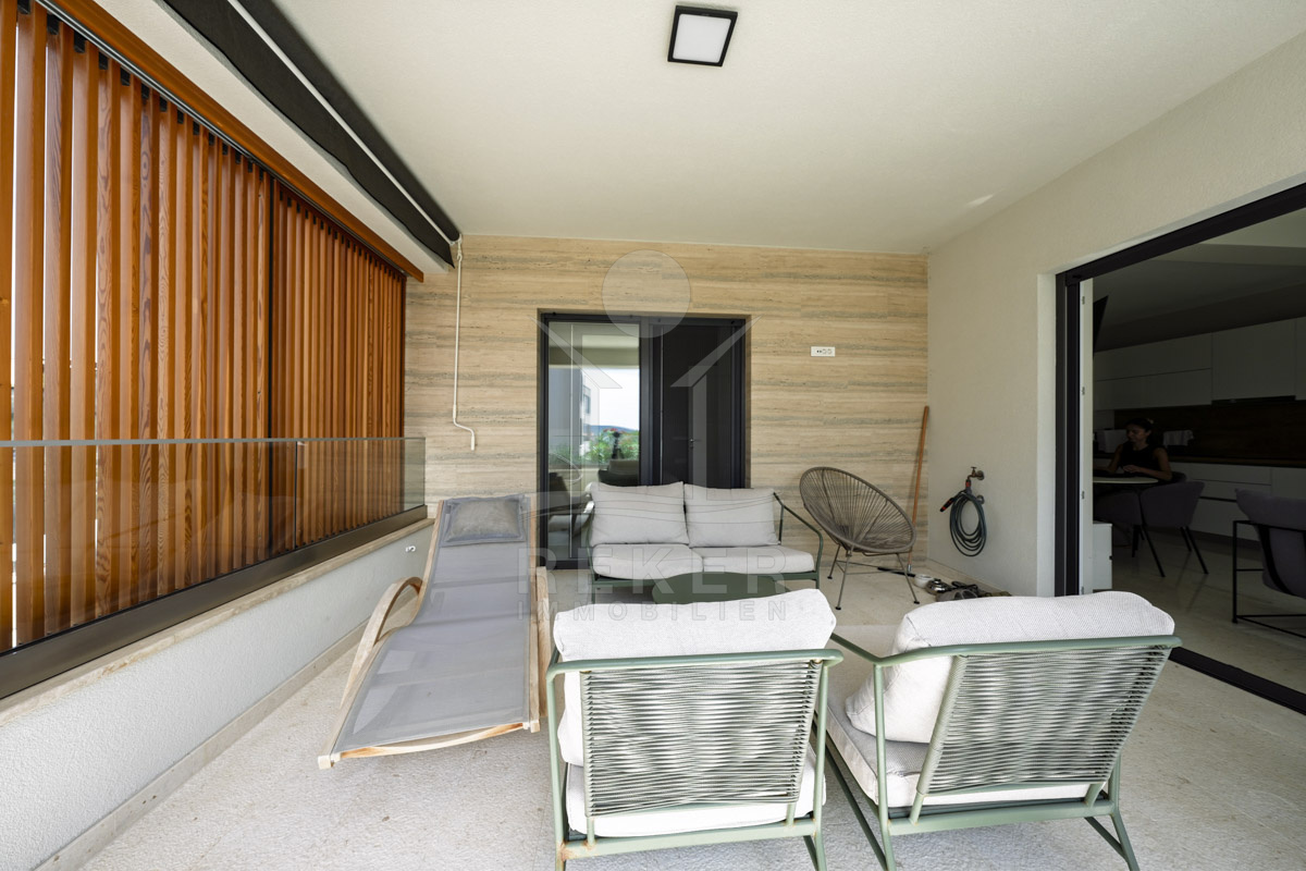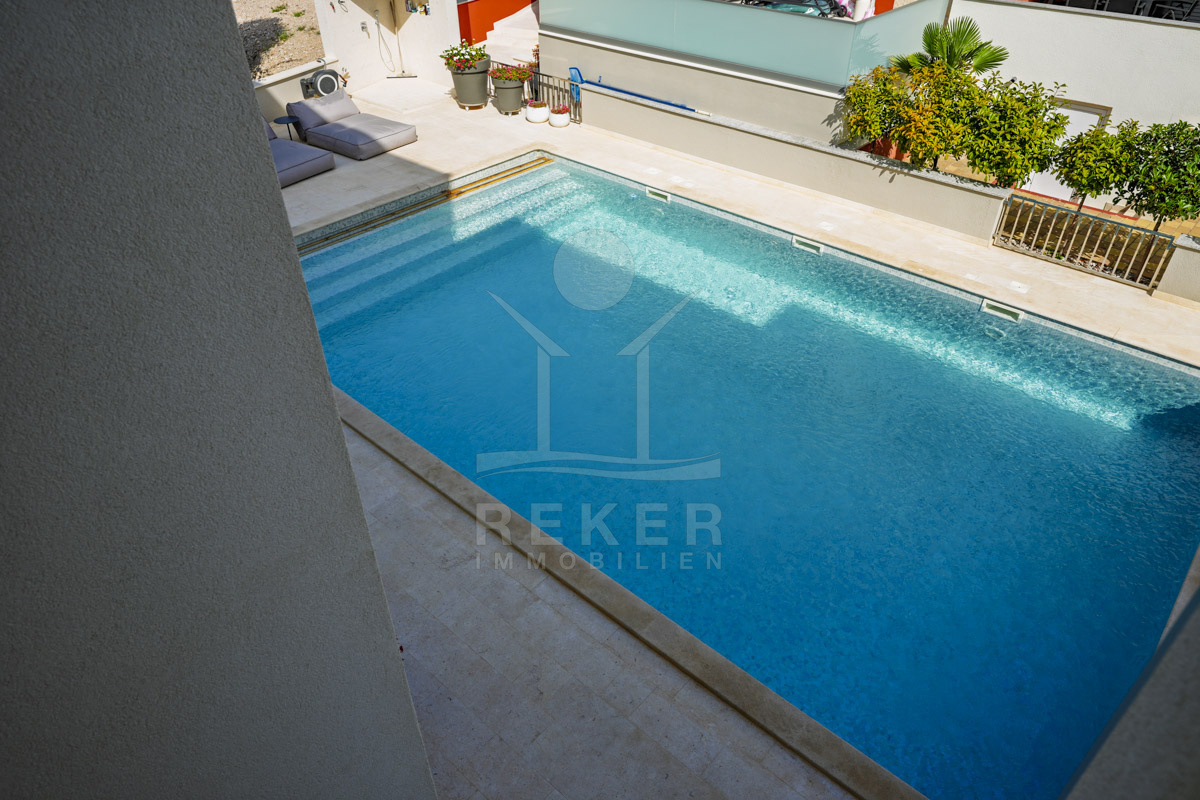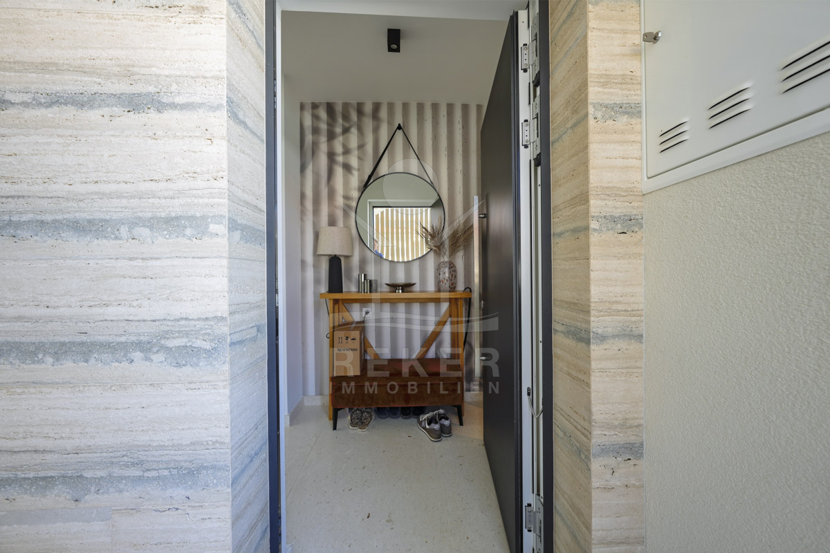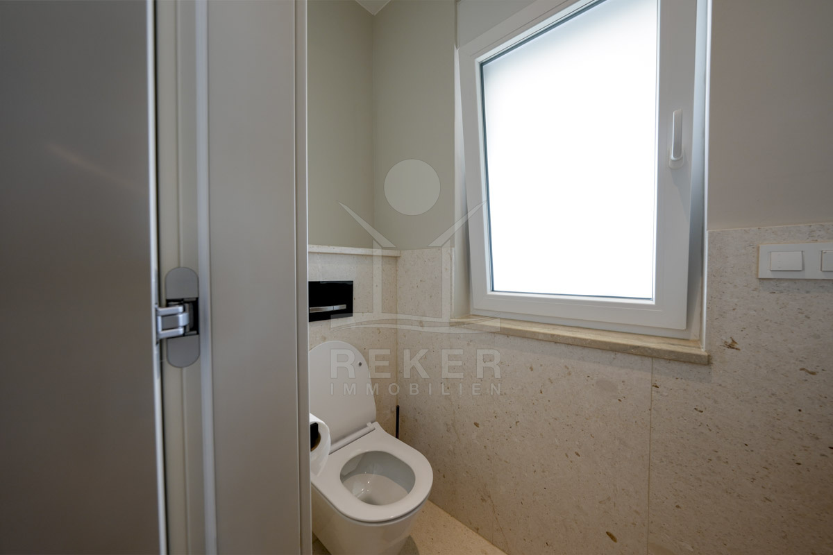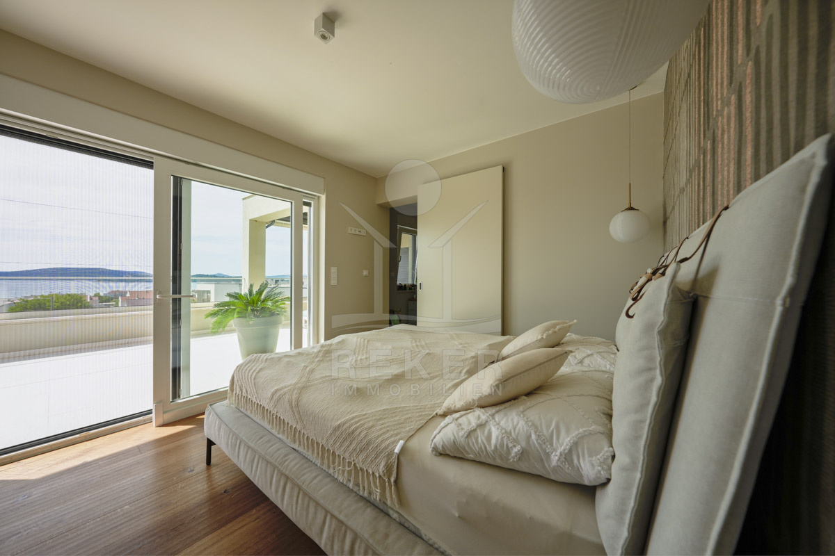 Die Neubauvilla aus dem Jahr 2023 befindet sich in einer ruhigen Wohngegend von Vodice, rund 500 Meter vom Meer entfernt. Sie wohnen abgeschirmt und dennoch nah an Strand und Zentrum. Aus den oberen Etagen reicht der Blick bis zum Meer. Sechs Stellplätze stehen zur Verfügung, zwei in der Garage, vier vor dem Haus. Praktisch bei mehreren Nutzern.