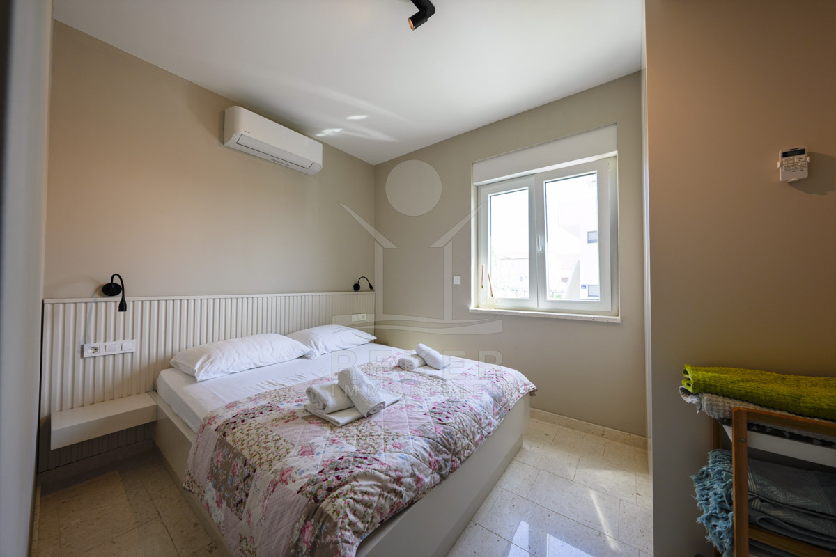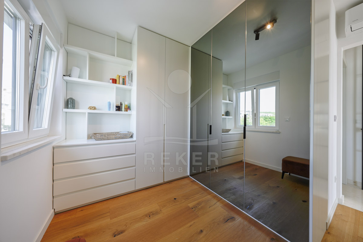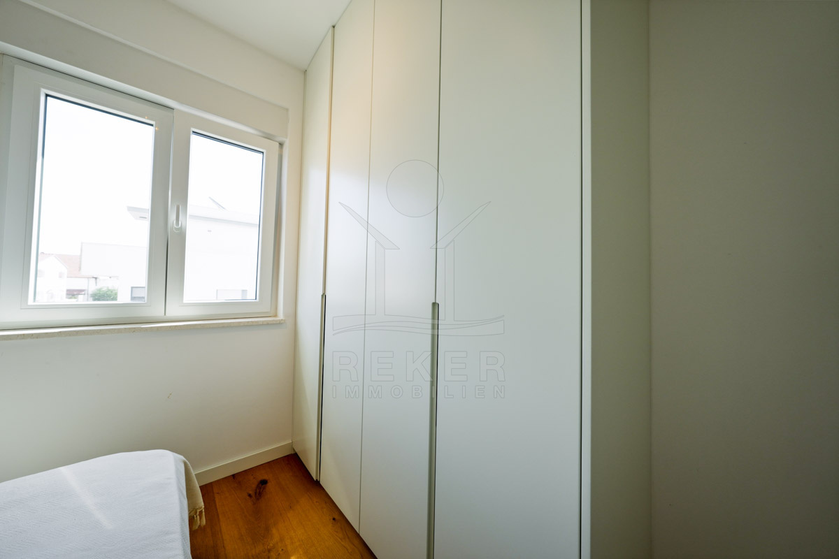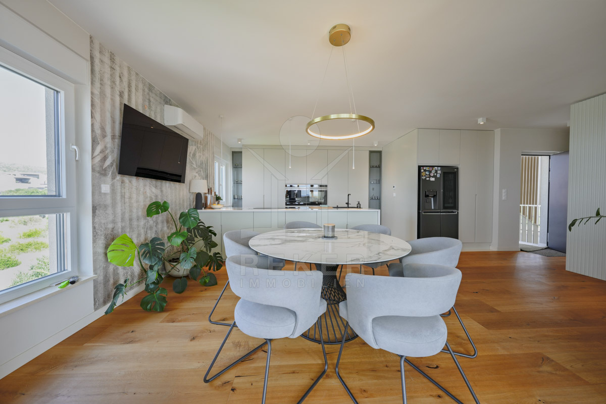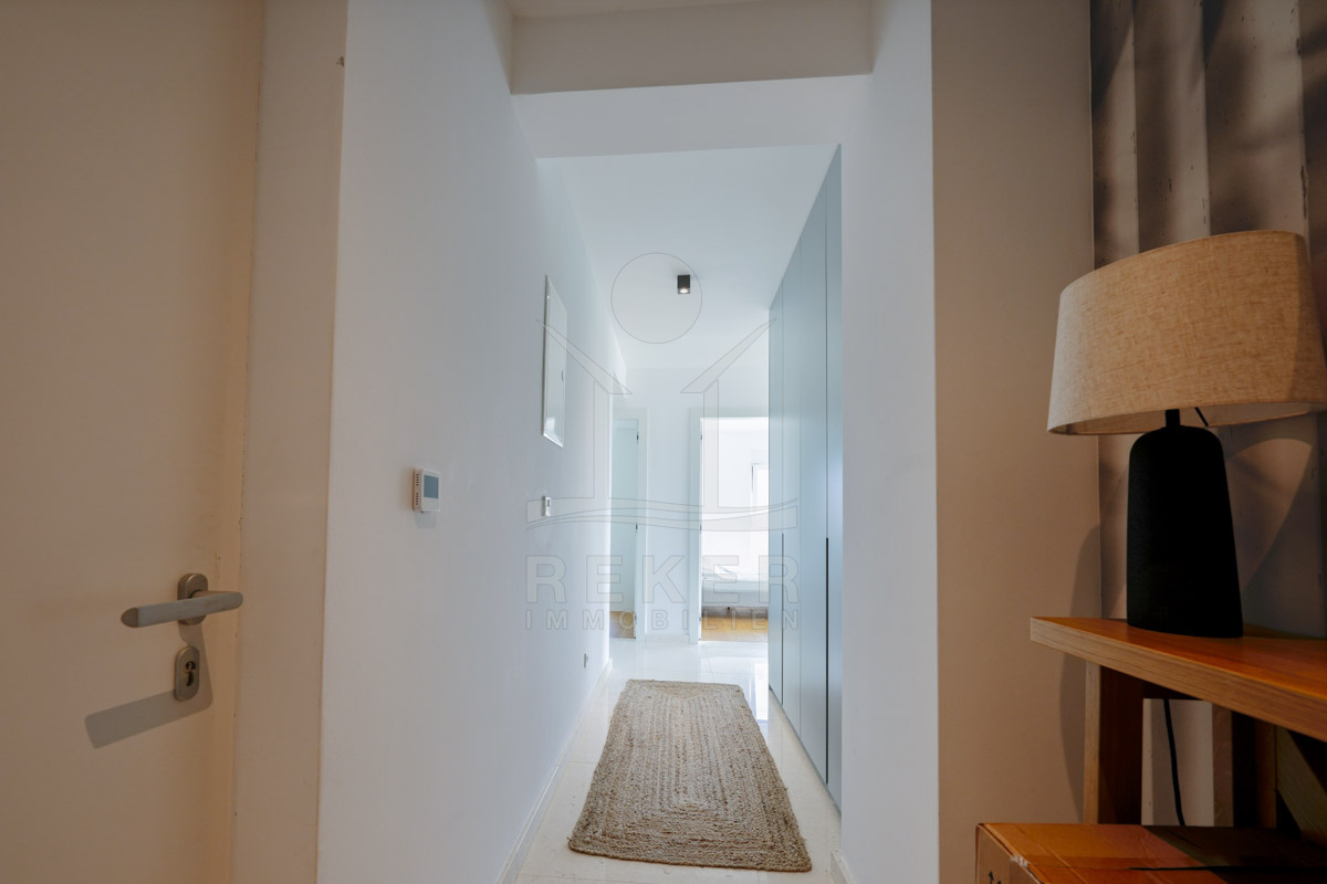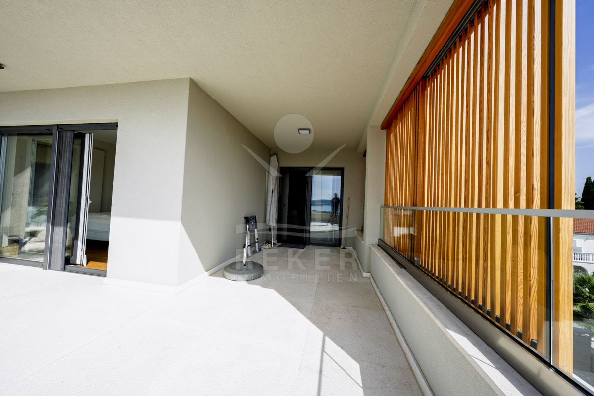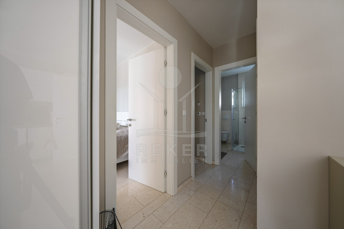 Die Neubauvilla aus dem Jahr 2023 befindet sich in einer ruhigen Wohngegend von Vodice, rund 500 Meter vom Meer entfernt. Sie wohnen abgeschirmt und dennoch nah an Strand und Zentrum. Aus den oberen Etagen reicht der Blick bis zum Meer. Sechs Stellplätze stehen zur Verfügung, zwei in der Garage, vier vor dem Haus. Praktisch bei mehreren Nutzern.
