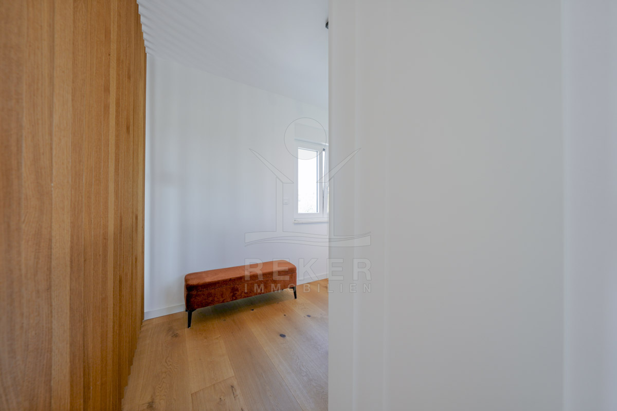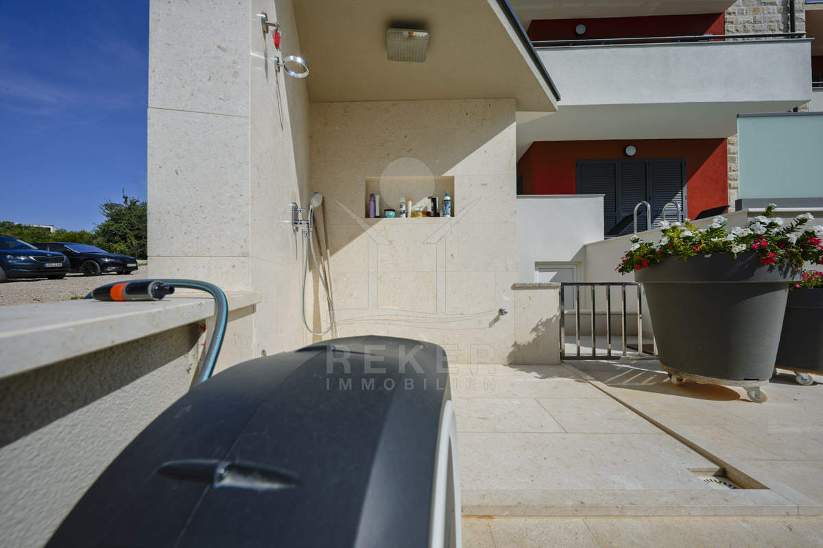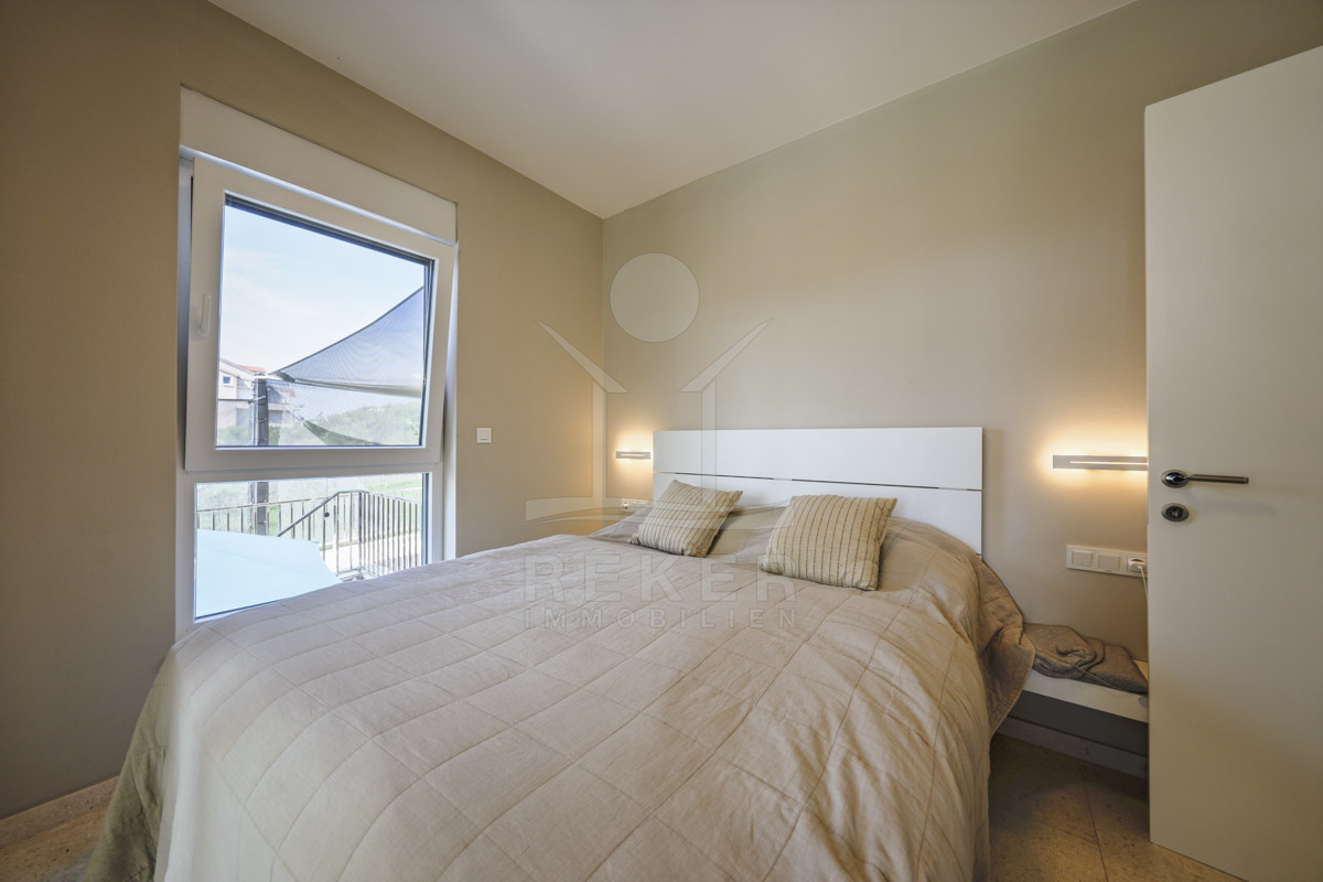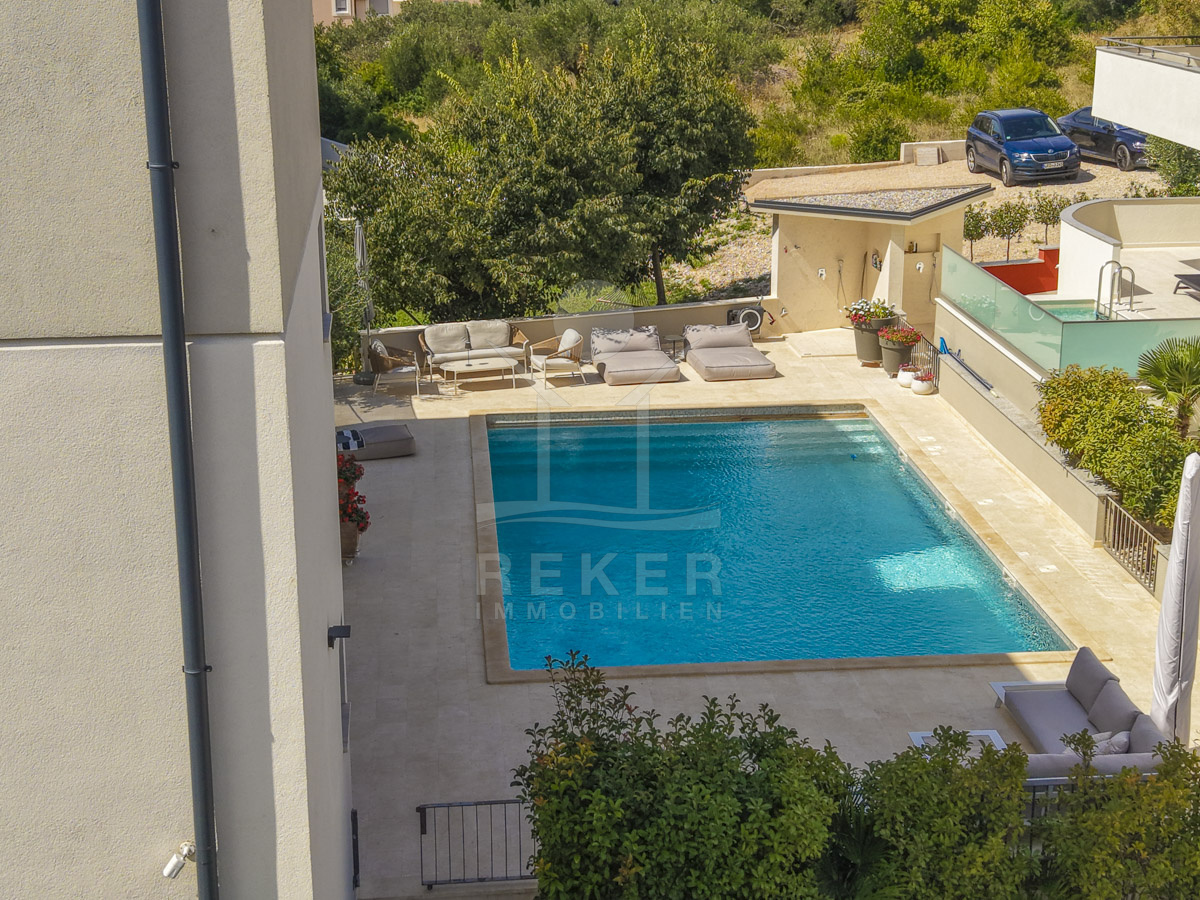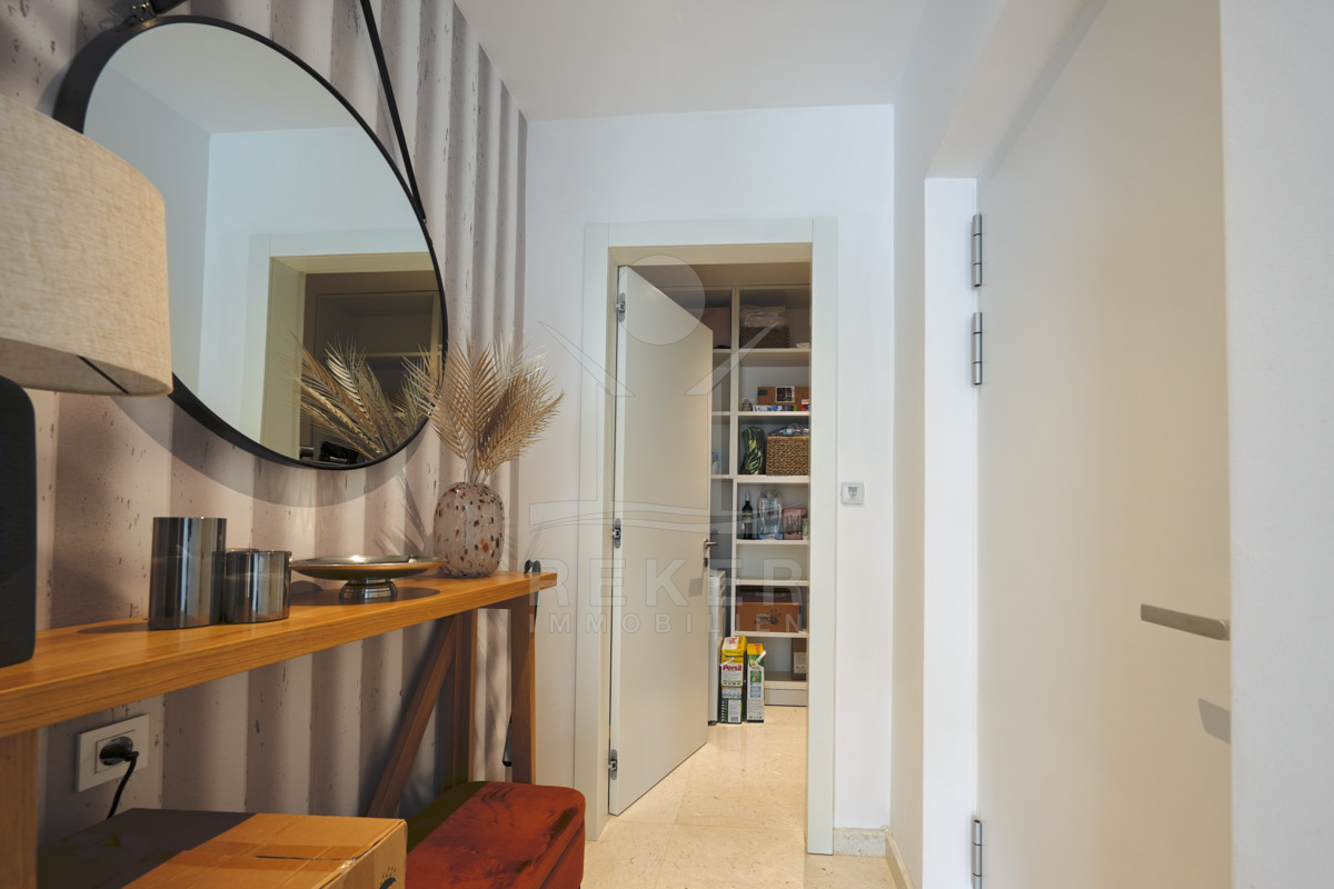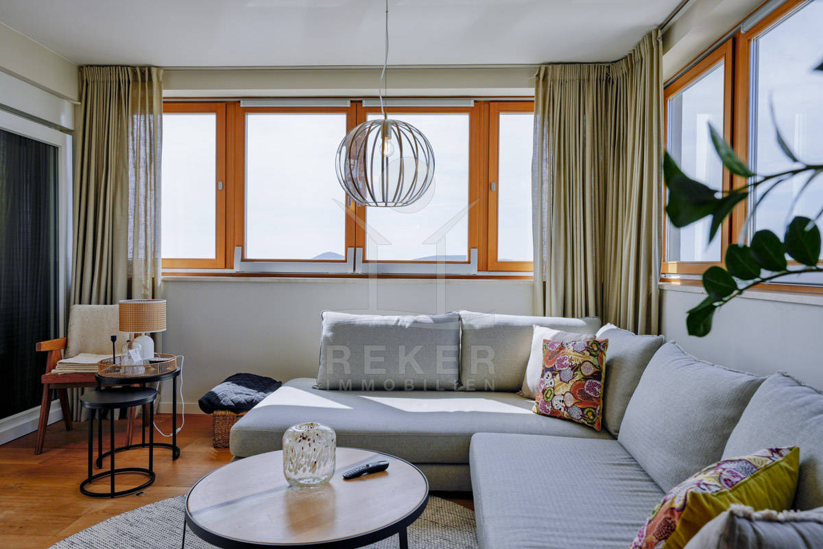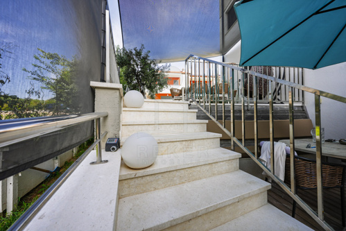 Die Neubauvilla aus dem Jahr 2023 befindet sich in einer ruhigen Wohngegend von Vodice, rund 500 Meter vom Meer entfernt. Sie wohnen abgeschirmt und dennoch nah an Strand und Zentrum. Aus den oberen Etagen reicht der Blick bis zum Meer. Sechs Stellplätze stehen zur Verfügung, zwei in der Garage, vier vor dem Haus. Praktisch bei mehreren Nutzern.