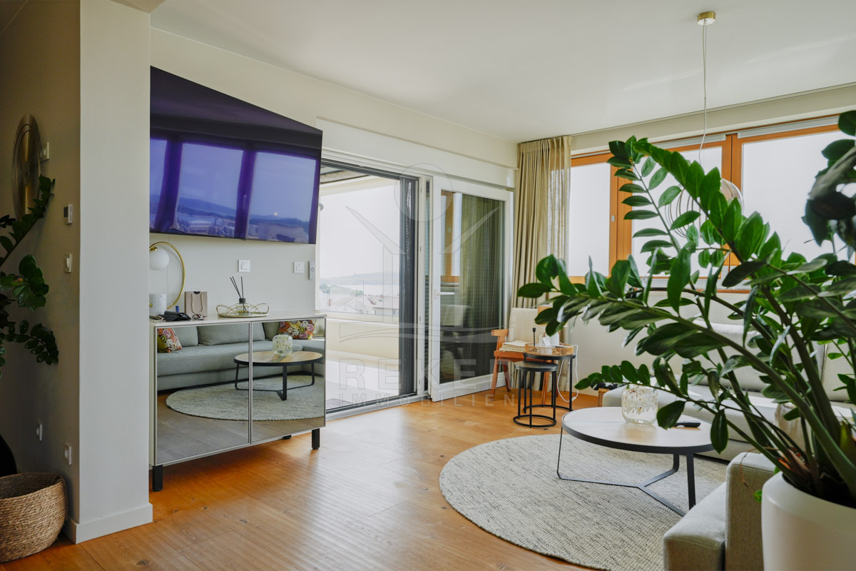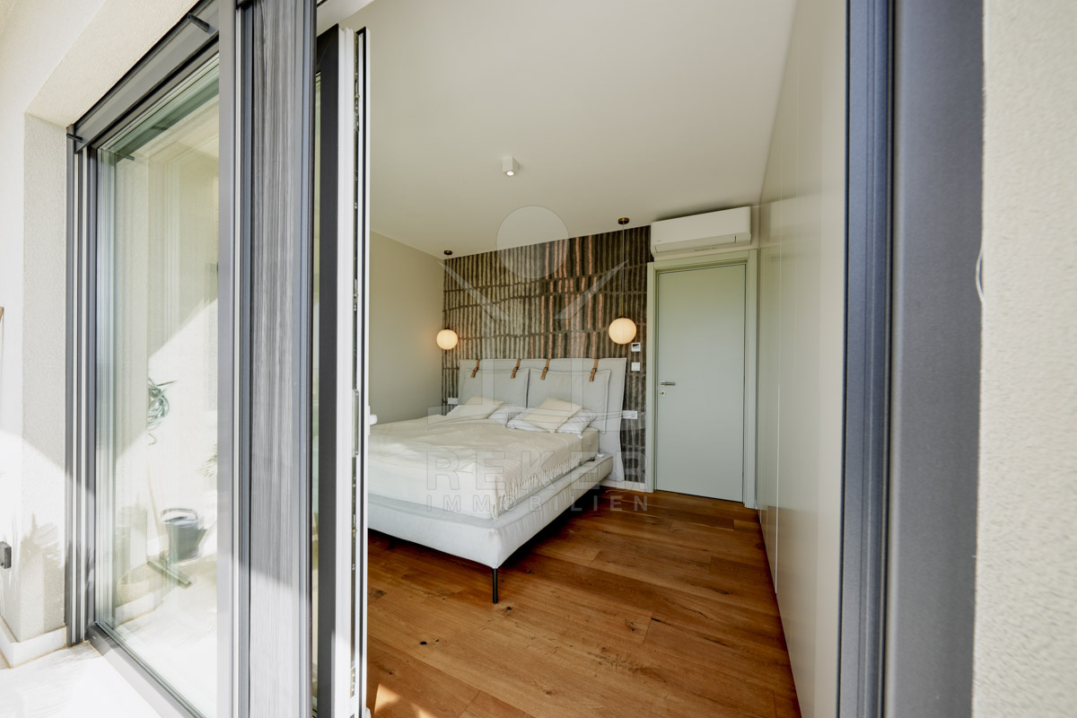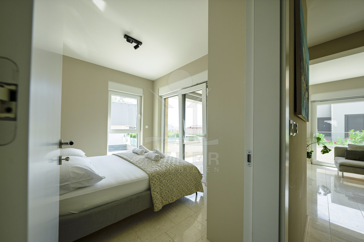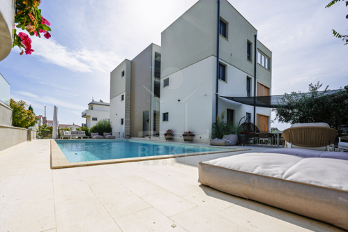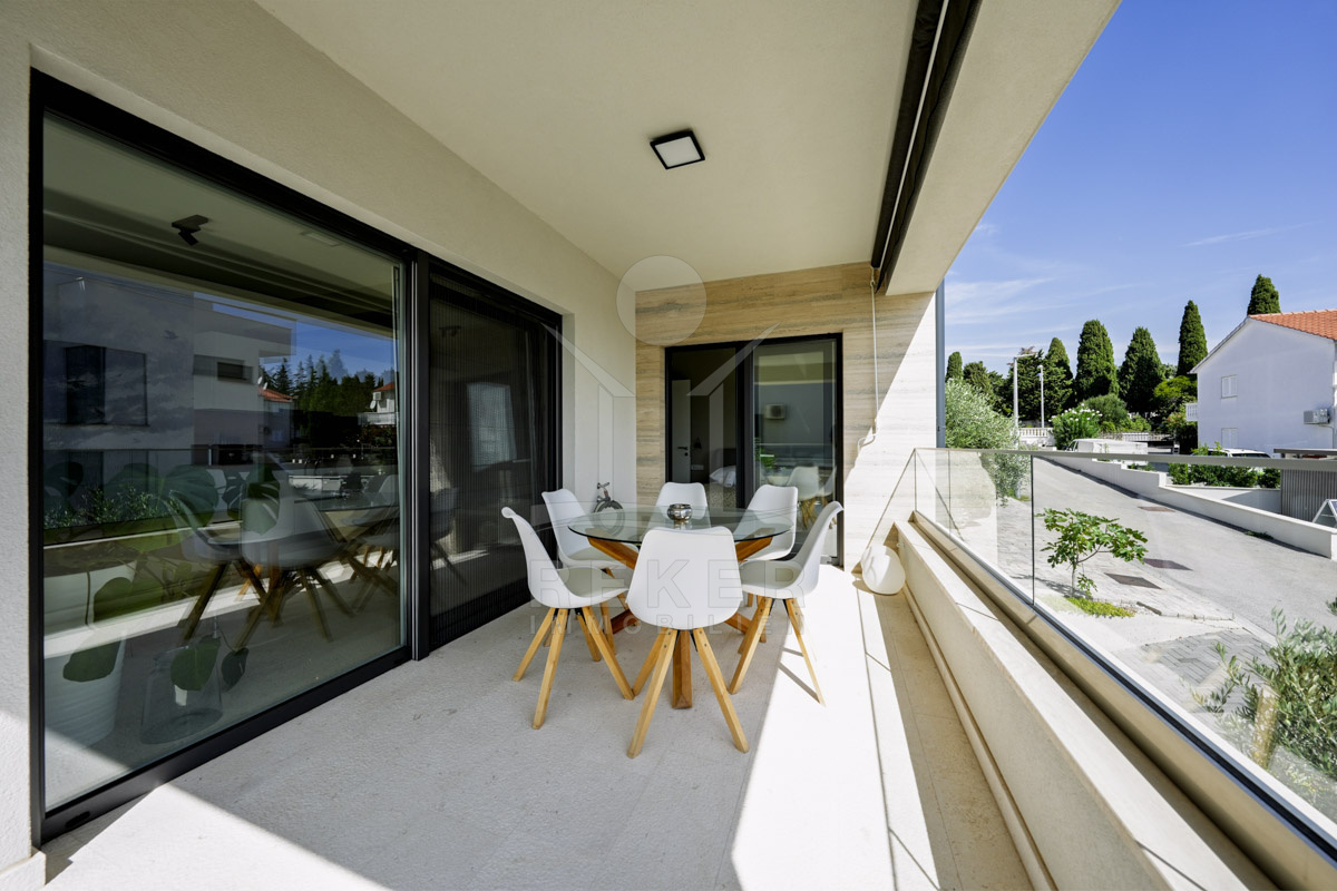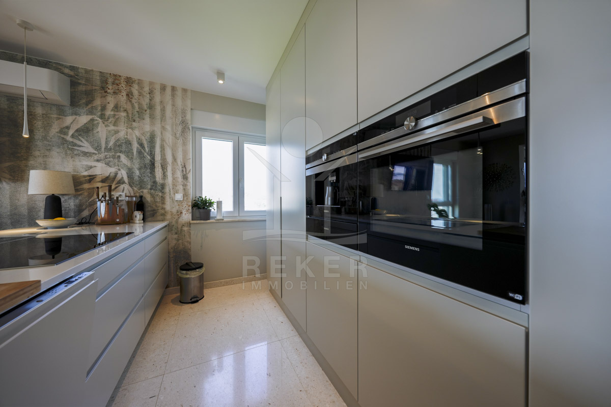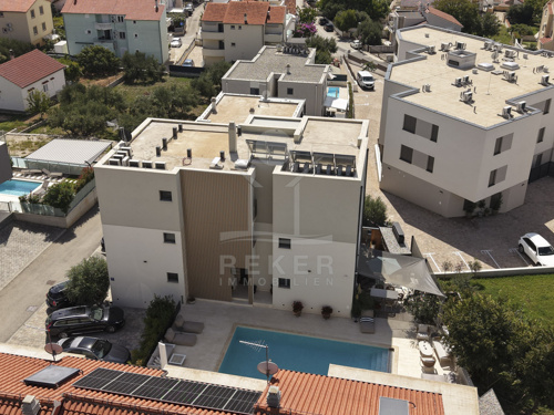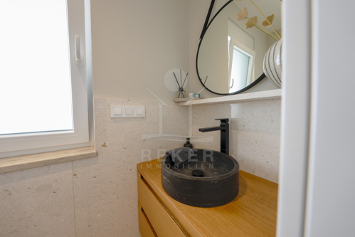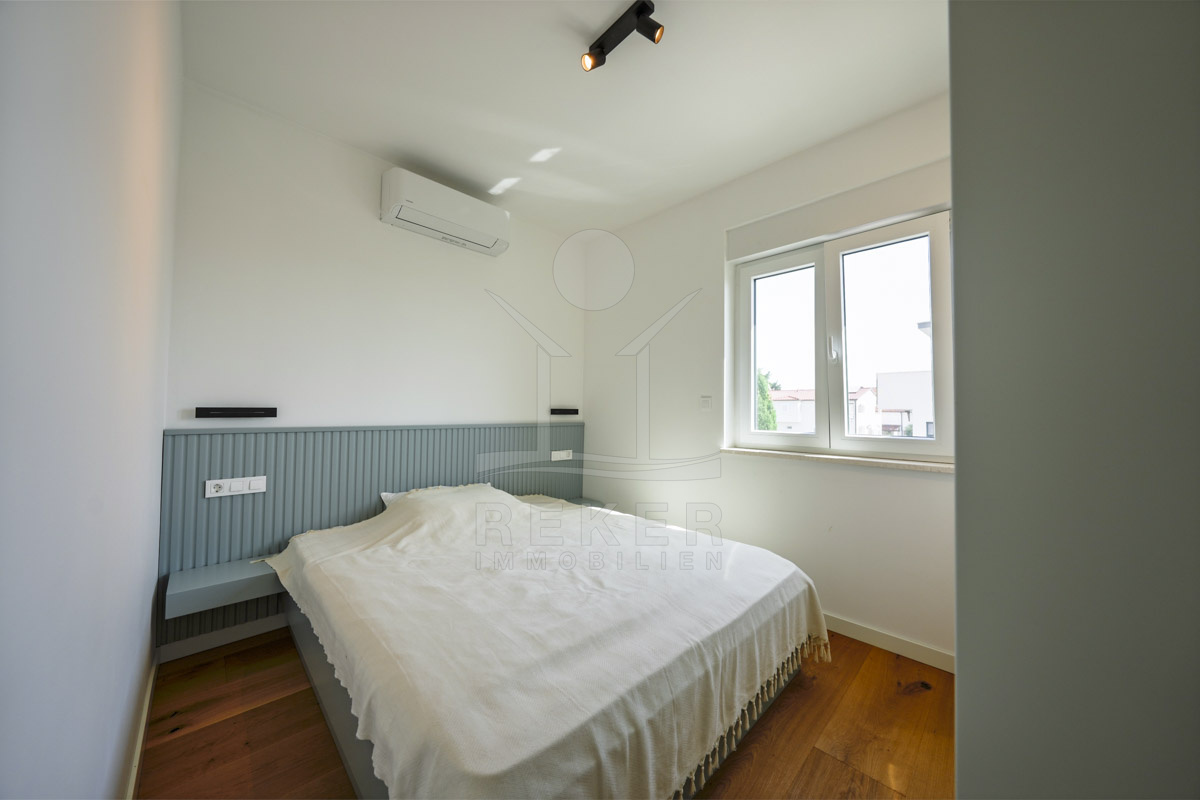 Die Neubauvilla aus dem Jahr 2023 befindet sich in einer ruhigen Wohngegend von Vodice, rund 500 Meter vom Meer entfernt. Sie wohnen abgeschirmt und dennoch nah an Strand und Zentrum. Aus den oberen Etagen reicht der Blick bis zum Meer. Sechs Stellplätze stehen zur Verfügung, zwei in der Garage, vier vor dem Haus. Praktisch bei mehreren Nutzern.
