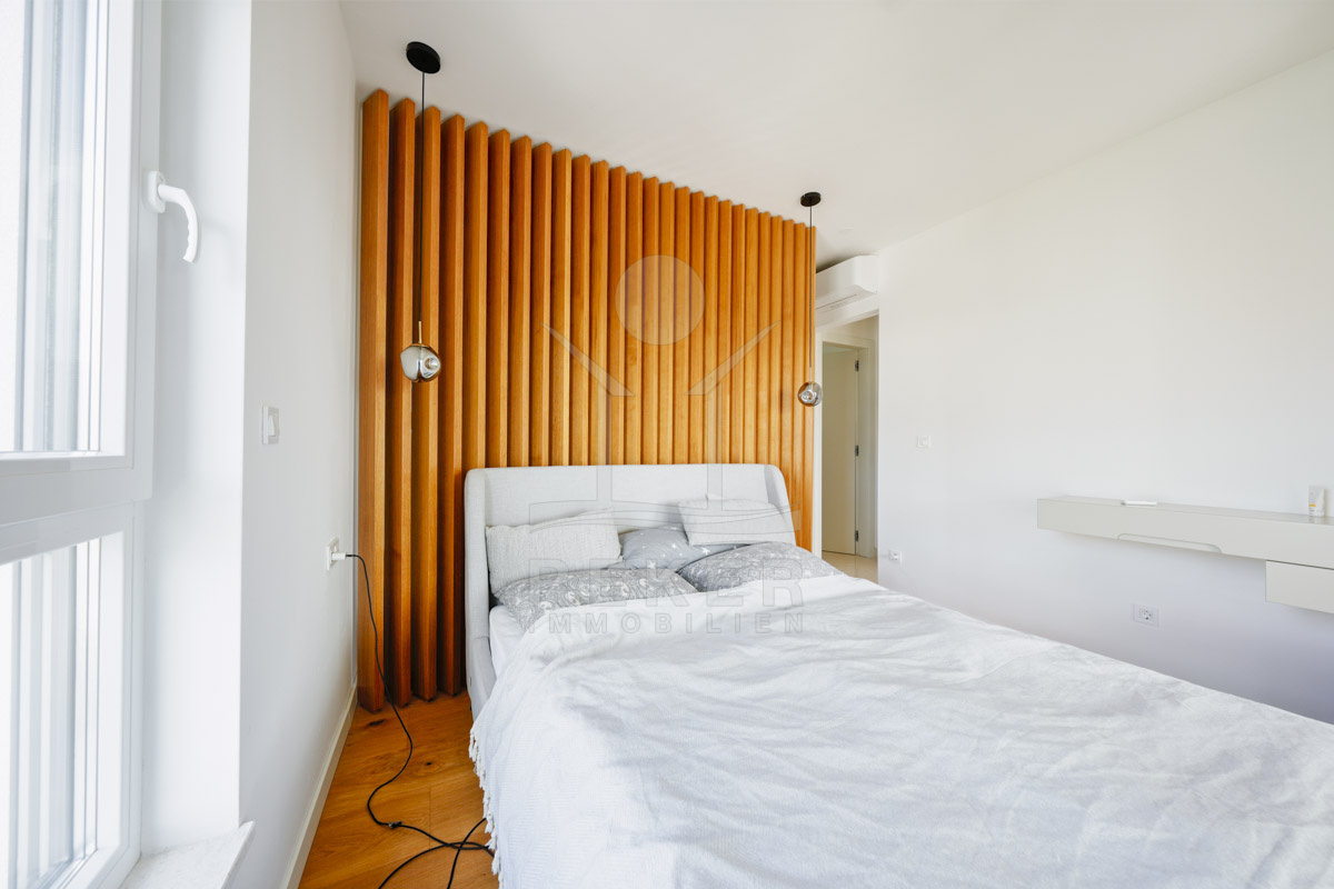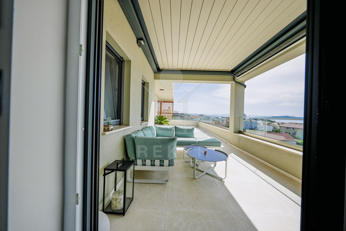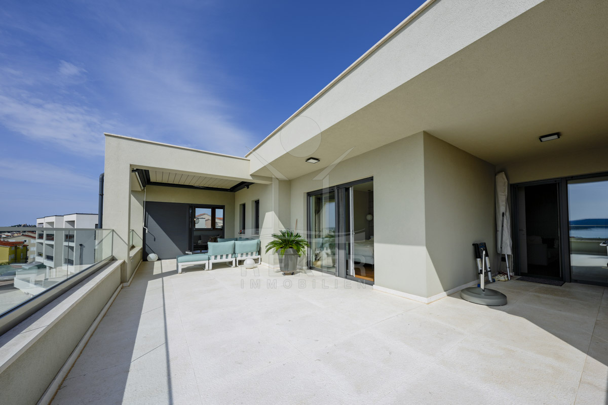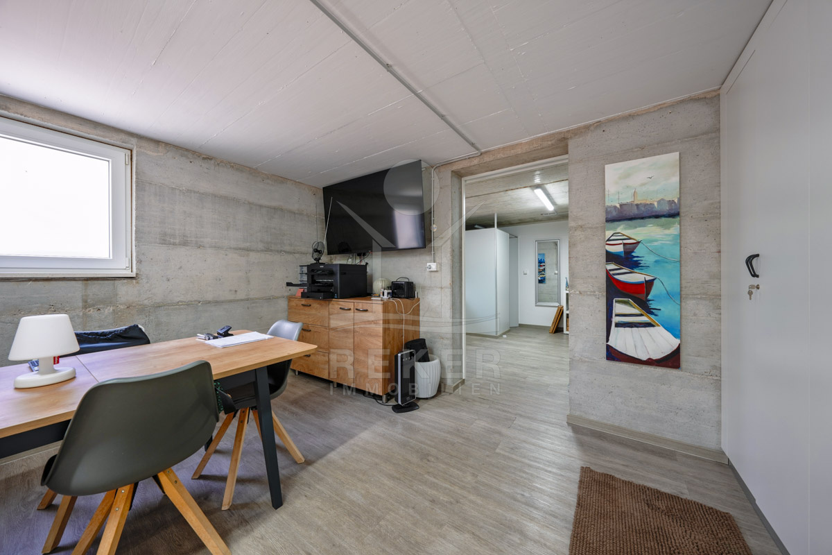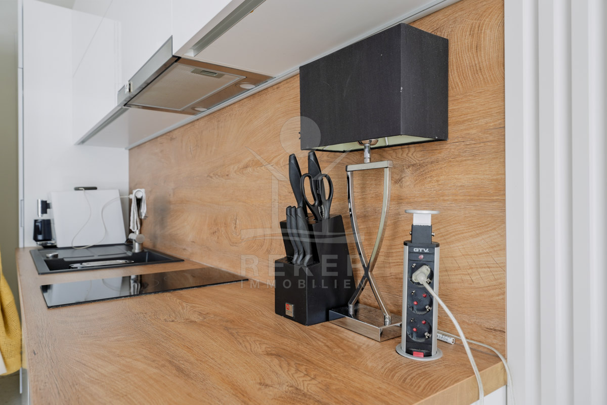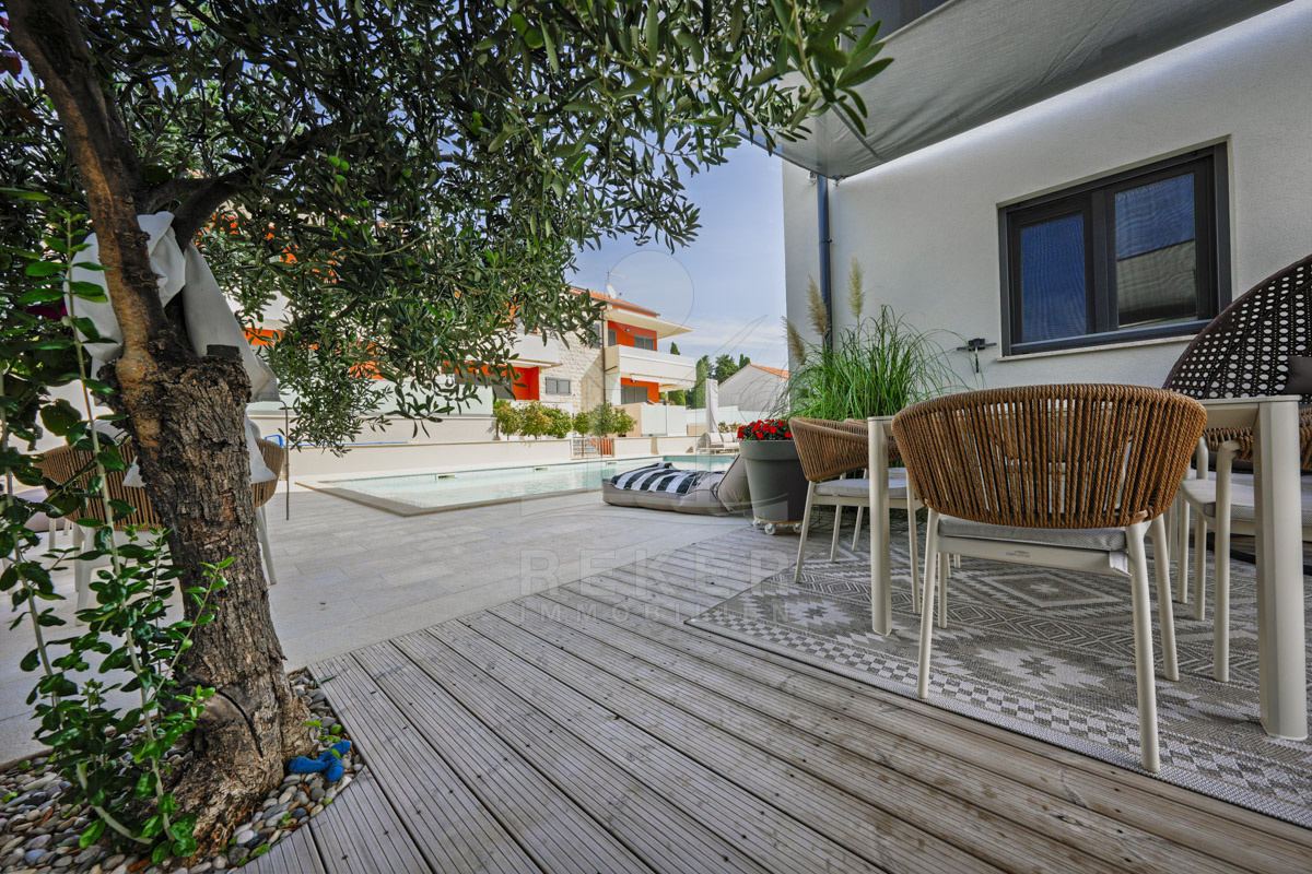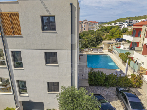Die Neubauvilla aus dem Jahr 2023 befindet sich in einer ruhigen Wohngegend von Vodice, rund 500 Meter vom Meer entfernt. Sie wohnen abgeschirmt und dennoch nah an Strand und Zentrum. Aus den oberen Etagen reicht der Blick bis zum Meer. Sechs Stellplätze stehen zur Verfügung, zwei in der Garage, vier vor dem Haus. Praktisch bei mehreren Nutzern.
