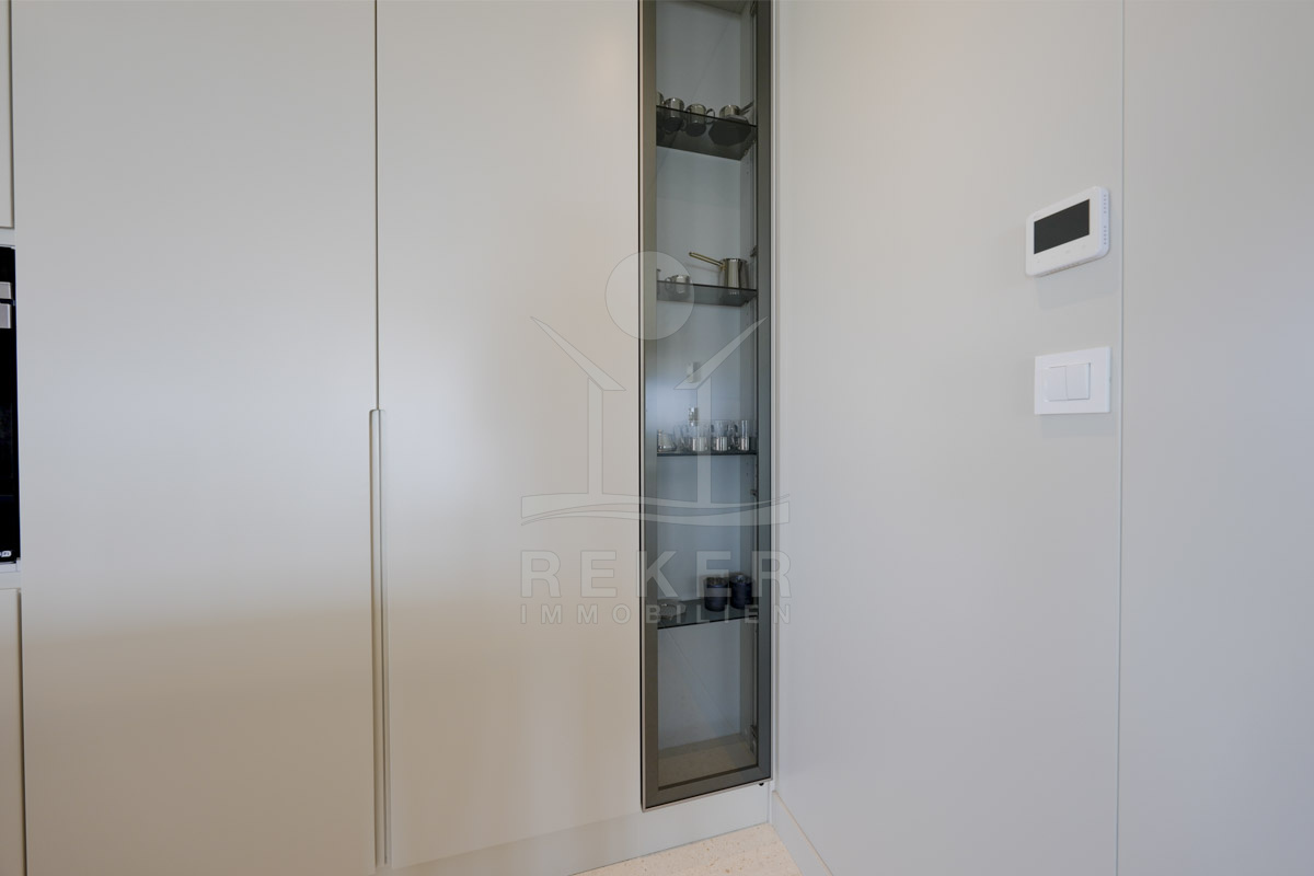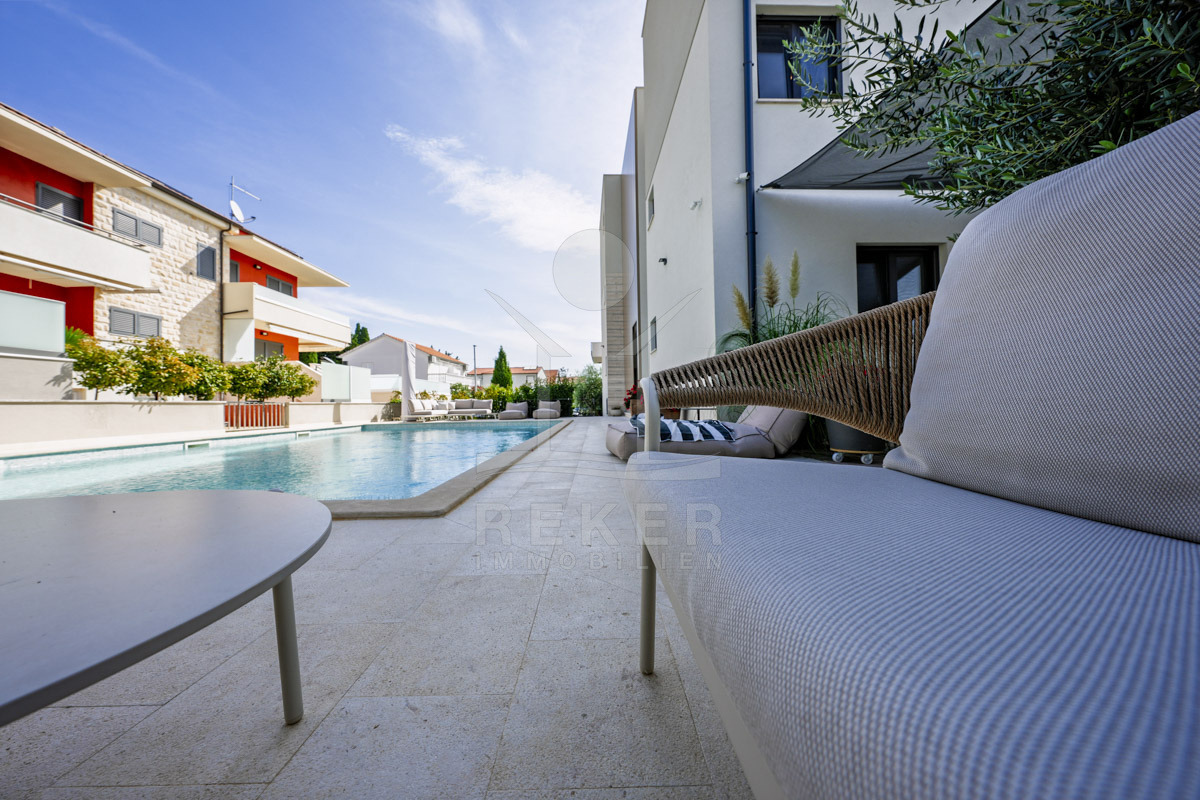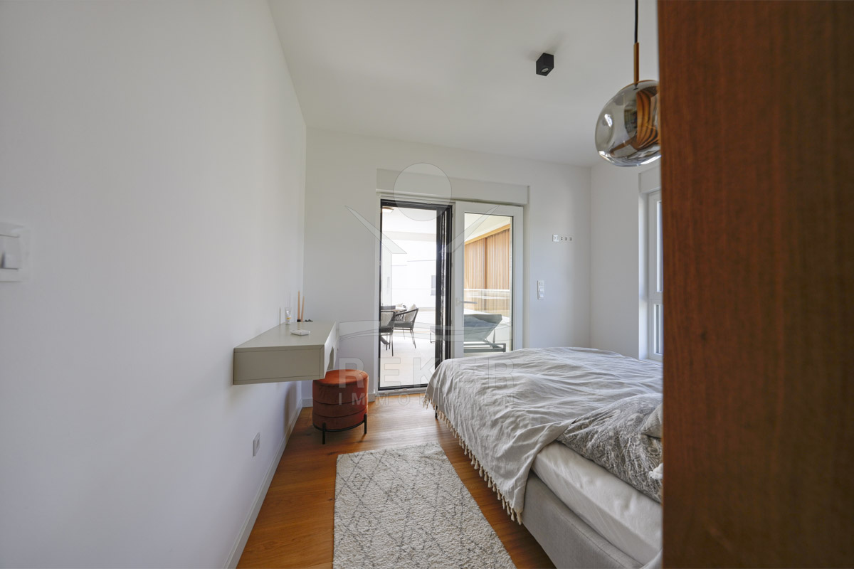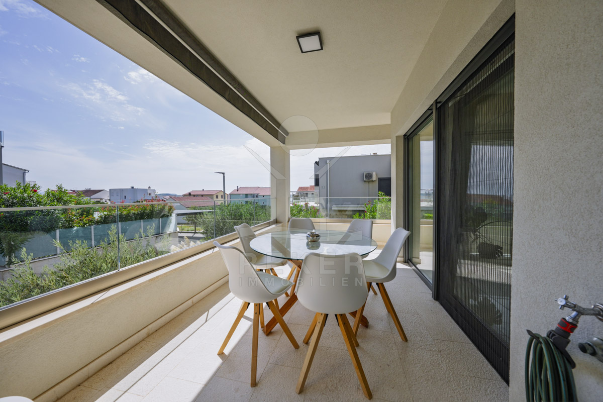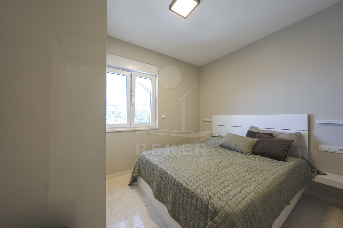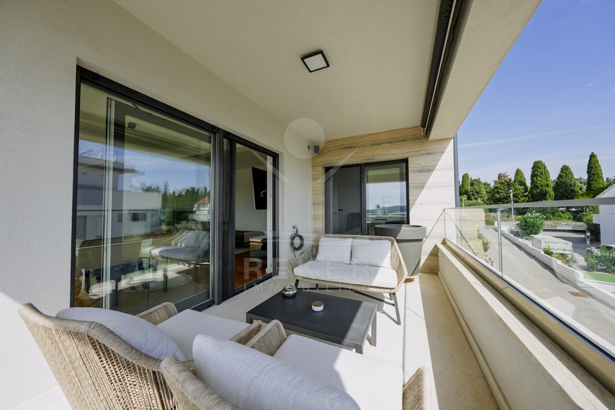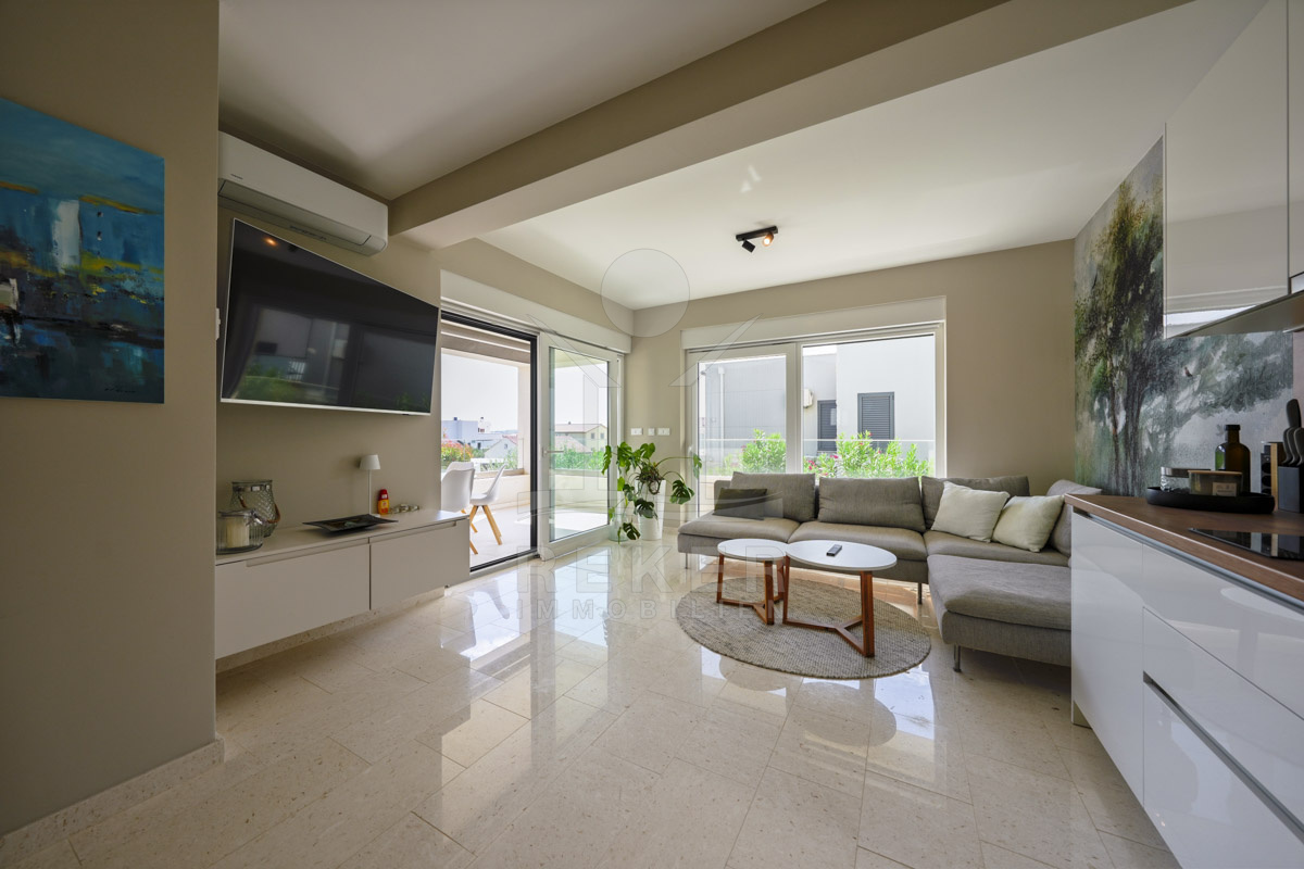 Die Neubauvilla aus dem Jahr 2023 befindet sich in einer ruhigen Wohngegend von Vodice, rund 500 Meter vom Meer entfernt. Sie wohnen abgeschirmt und dennoch nah an Strand und Zentrum. Aus den oberen Etagen reicht der Blick bis zum Meer. Sechs Stellplätze stehen zur Verfügung, zwei in der Garage, vier vor dem Haus. Praktisch bei mehreren Nutzern.