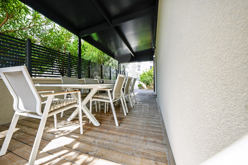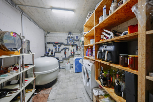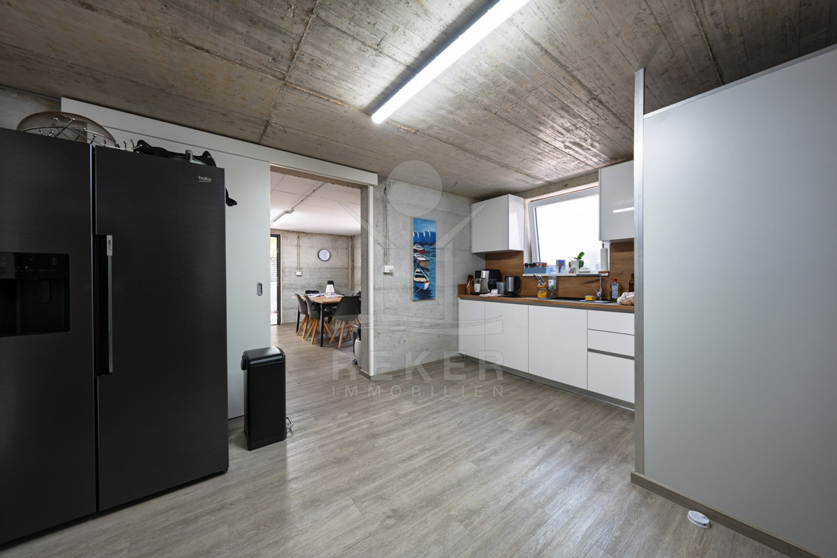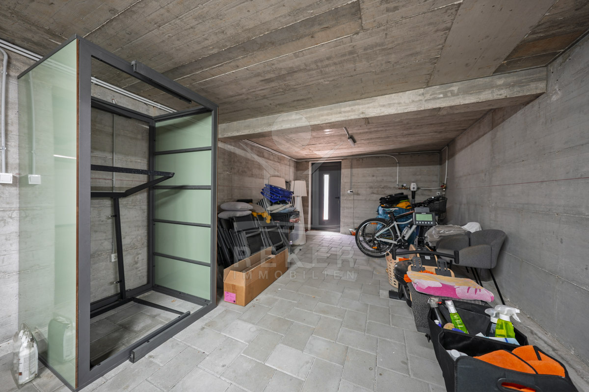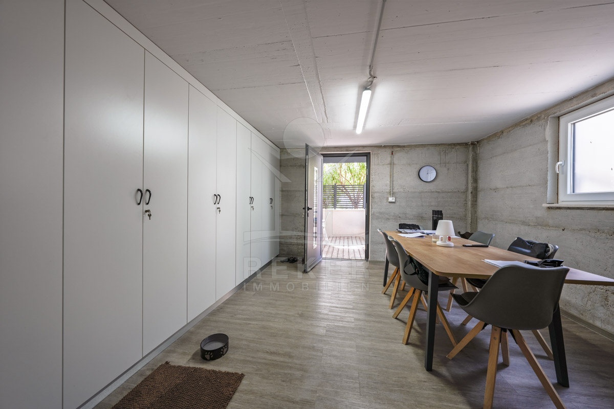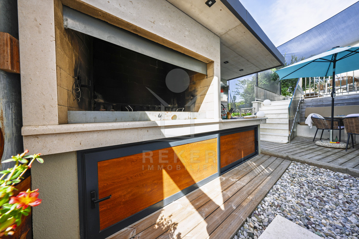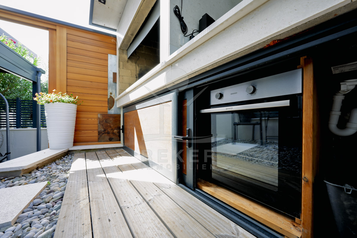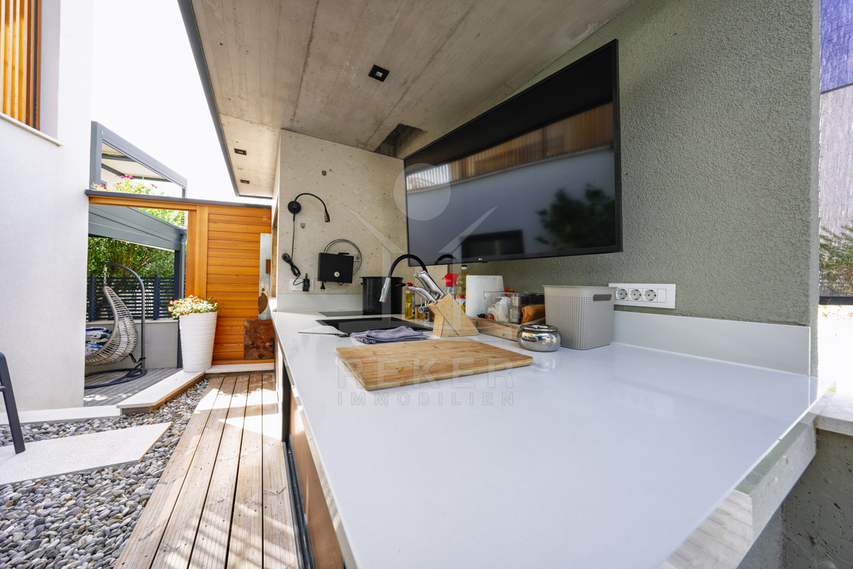 Das 629 m² große Grundstück wirkt gepflegt und offen gestaltet. Mittelpunkt des Außenbereichs ist der 60 m² große Pool (10 × 6 m), vorbereitet für eine Beheizung und damit auch in der Übergangszeit nutzbar. Liegeflächen und eine Außendusche ergänzen diesen Bereich. Der überdachte Grillplatz mit Außenküche und Steingrill schafft Raum für gemeinsame Abende. Direkt daneben ergänzt eine Taverne mit Sommerküche im Untergeschoss den Außenbereich um einen geschützten Aufenthaltsraum.