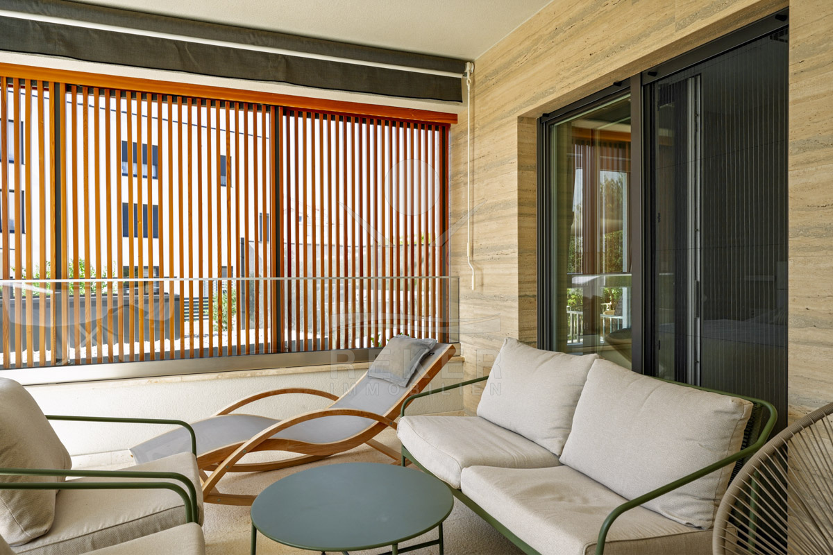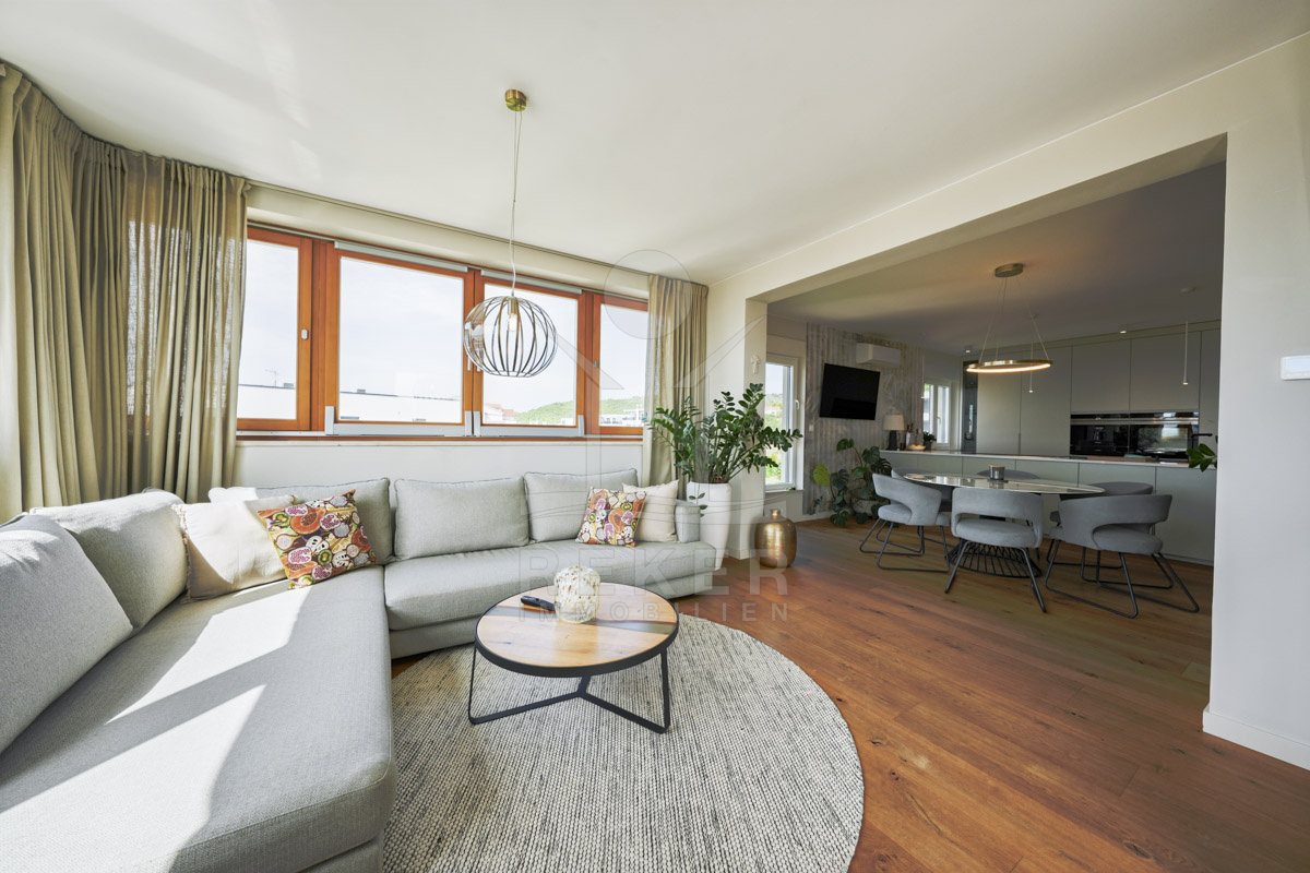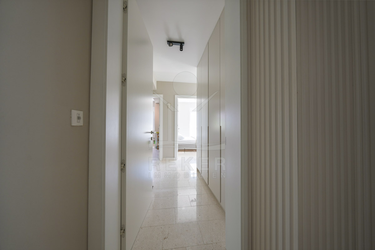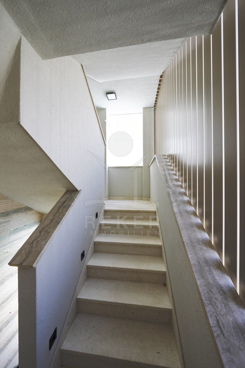 Im Erdgeschoss befinden sich zwei Wohnungen mit jeweils 134 m². Jede Einheit bietet zwei Schlafzimmer, ein Badezimmer sowie einen offenen Wohn-, Ess- und Küchenbereich. Das 1. Obergeschoss umfasst eine Wohnung mit ebenfalls 134 m². Vier Schlafzimmer, zwei Badezimmer, ein Abstellraum und ein rund 50 m² großer Wohnbereich bieten großzügige Flächen. Zwei überdachte Terrassen öffnen den Blick in Richtung Meer. Im 2. Obergeschoss folgt das Penthouse mit 115 m². Zwei Schlafzimmer, zwei Badezimmer und ein Gäste-WC sorgen für Komfort. Wohnbereich und Schlafzimmer führen direkt auf die große Terrasse. Der Panoramablick auf das Meer prägt diesen Bereich. Alle Terrassen sind nach Süden ausgerichtet. Sonne begleitet Sie hier durch den gesamten Tag.