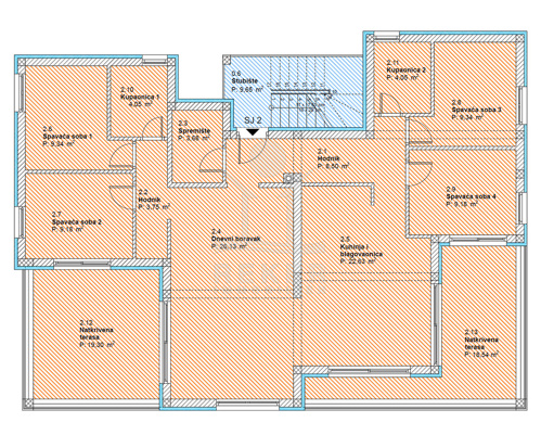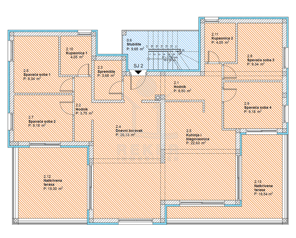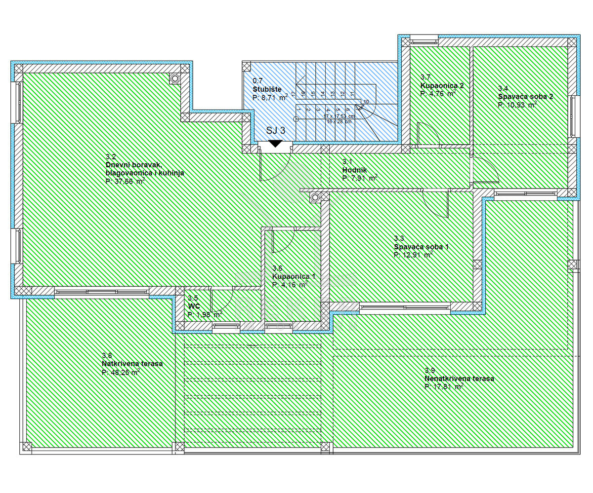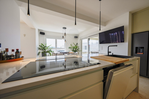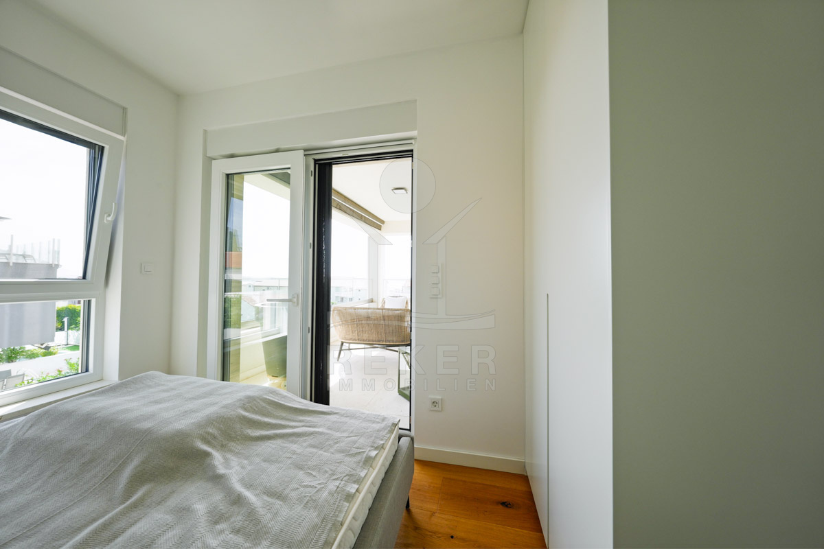 Im Erdgeschoss befinden sich zwei Wohnungen mit jeweils 134 m². Jede Einheit bietet zwei Schlafzimmer, ein Badezimmer sowie einen offenen Wohn-, Ess- und Küchenbereich. Das 1. Obergeschoss umfasst eine Wohnung mit ebenfalls 134 m². Vier Schlafzimmer, zwei Badezimmer, ein Abstellraum und ein rund 50 m² großer Wohnbereich bieten großzügige Flächen. Zwei überdachte Terrassen öffnen den Blick in Richtung Meer. Im 2. Obergeschoss folgt das Penthouse mit 115 m². Zwei Schlafzimmer, zwei Badezimmer und ein Gäste-WC sorgen für Komfort. Wohnbereich und Schlafzimmer führen direkt auf die große Terrasse. Der Panoramablick auf das Meer prägt diesen Bereich. Alle Terrassen sind nach Süden ausgerichtet. Sonne begleitet Sie hier durch den gesamten Tag.