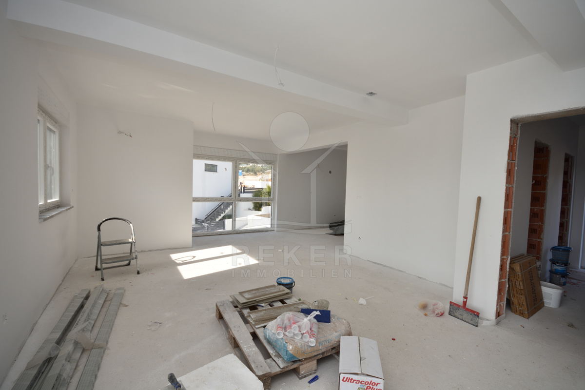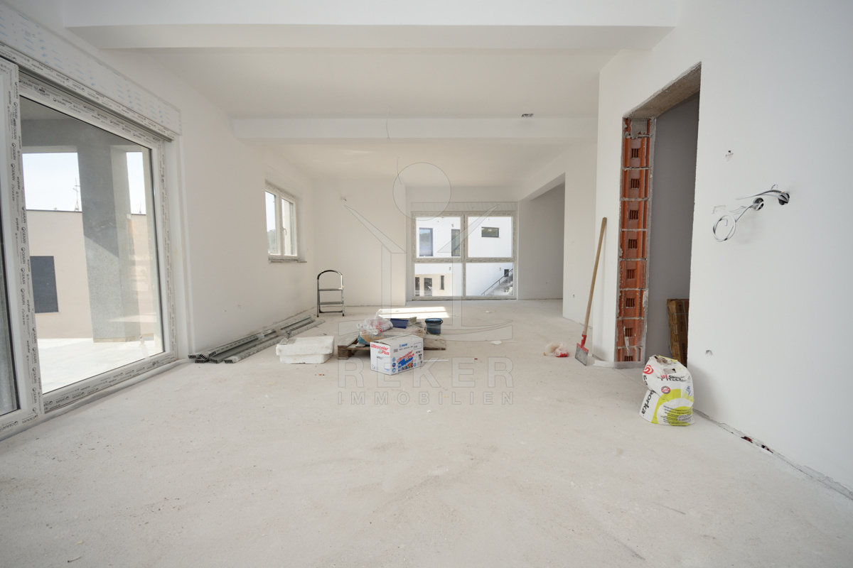 Die Außenterrasse dieser Luxusvilla ist ein Ort des puren Genusses und der Entspannung. Ein Swimmingpool lädt zu erfrischenden Schwimmrunden ein, während die überdachte Terrasse den idealen Raum bietet, um Zeit im Freien in guter Gesellschaft zu verbringen. Ob ein gemütliches Beisammensein am Grill oder ein entspannter Tag am Pool – diese Terrasse bietet vielfältige Möglichkeiten, das Leben in vollen Zügen zu genießen. Diese Neubauvilla ist eine Oase der Eleganz und des Komforts, die höchsten Ansprüchen gerecht wird.