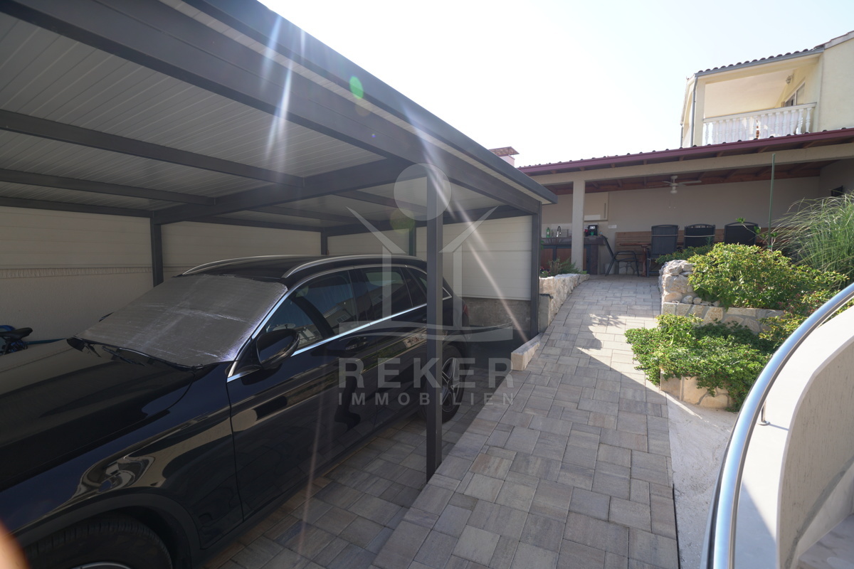 Die Villa bietet großzügige Parkmöglichkeiten, darunter ein Carport für einen Pkw und zusätzliche Parkplätze im Hof oder vor dem Haus.