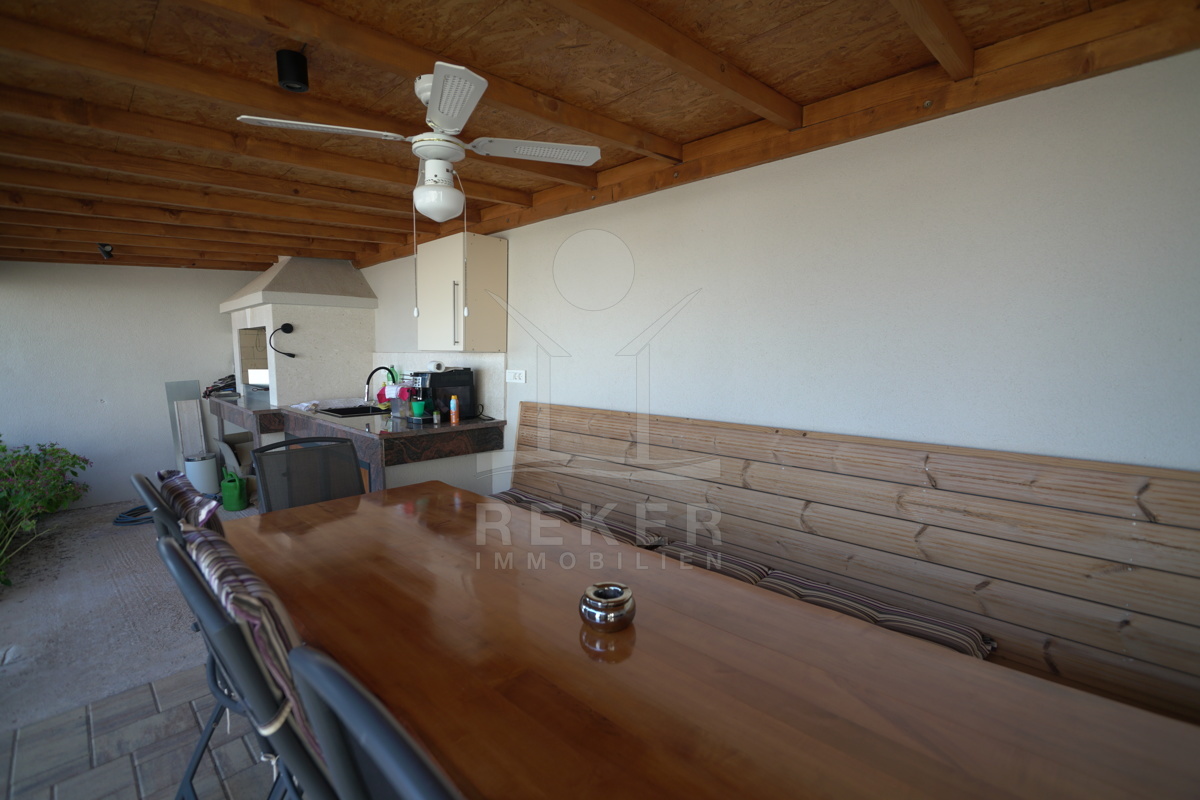 Die Außenanlage ist eine wahre Oase der Entspannung, mit einem erfrischenden Pool von 24 m², der perfekt für ein erfrischendes Bad geeignet ist. Zwei Außenduschen, darunter eine mit solar beheiztem Wasser, bieten zusätzlichen Komfort. Eine überdachte Terrasse vor dem Pool lädt zum Verweilen und Entspannen ein. Zudem ermöglicht eine überdachte Außenküche mit einem Steingrill, Mahlzeiten im Freien zuzubereiten und zu genießen.