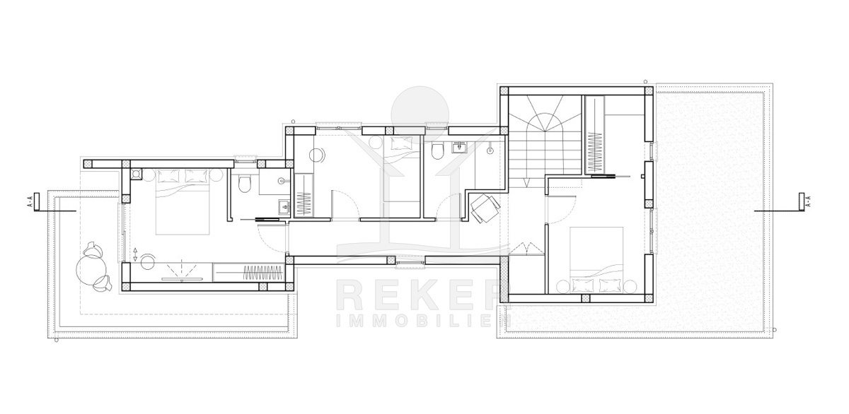 Im Inneren setzt die Villa das moderne Konzept fort. Die DAN-Küche mit Bosch-Geräten und Liebherr-Kühlschrank, der große Essbereich und das Wohnzimmer mit direktem Zugang zur Terrasse bilden den zentralen Wohnbereich. Dazu kommen eine Garderobe, eine Gästetoilette, eine Waschküche und mehrere Abstellräume. Eine Treppe aus Massivholz führt ins Obergeschoss. Dort erwarten Sie drei Schlafzimmer, darunter eine Master Suite mit begehbarem Kleiderschrank. Ein weiteres Zimmer bietet ein eigenes Bad und Zugang zu zwei Terrassen.