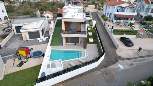 Der etwa 340 m² große Garten bietet viel Privatsphäre und nimmt Ihnen dank automatischer Bewässerung Arbeit ab. Im Mittelpunkt steht der beheizte Swimmingpool (7 × 4 m). Er verfügt über eine Wärmepumpe, automatische pH- und Elektrolyseregelung sowie Massagedüsen. So genießen Sie entspannte Stunden unter der dalmatinischen Sonne. Die überdachte Terrasse im Erdgeschoss eignet sich gut für gemeinsame Mahlzeiten.