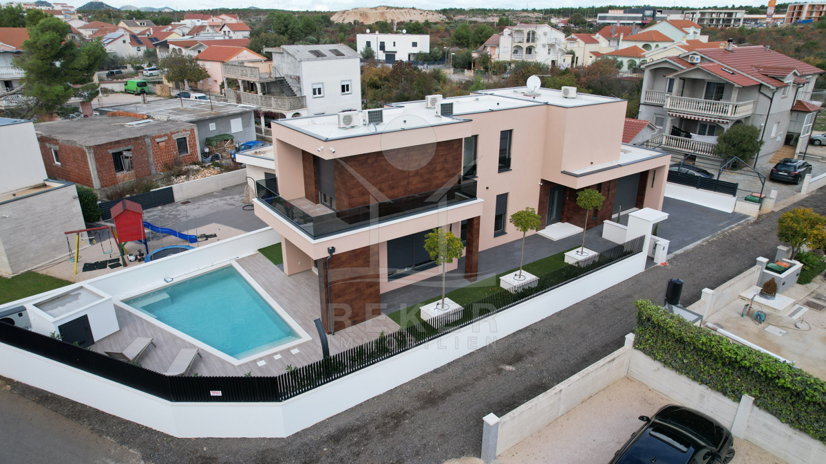 In ruhiger, sonniger Lage von Vodice, rund 1100 Meter vom Strand und 1400 Meter vom Ortszentrum entfernt, erwartet Sie eine moderne Villa mit hohem Wohnkomfort. Sie erreichen das Anwesen bequem über eine asphaltierte Zufahrtsstraße, und die gepflegte Umgebung schafft sofort ein angenehmes Wohngefühl. Auf dem umzäunten Grundstück nutzen Sie eine Garage, zusätzliche Stellplätze und eine Ladestation für Ihr Elektrofahrzeug.