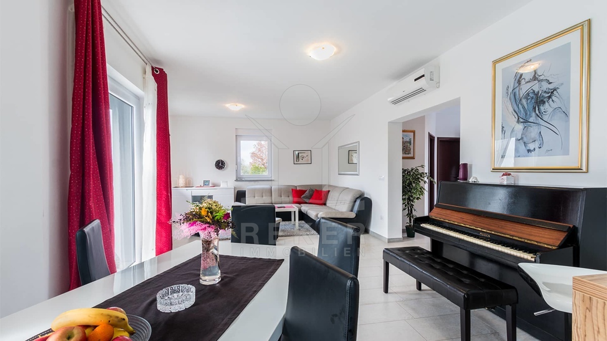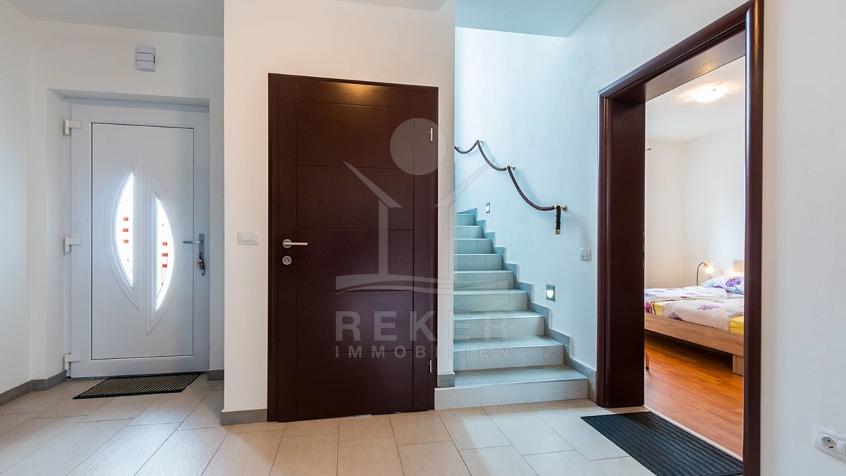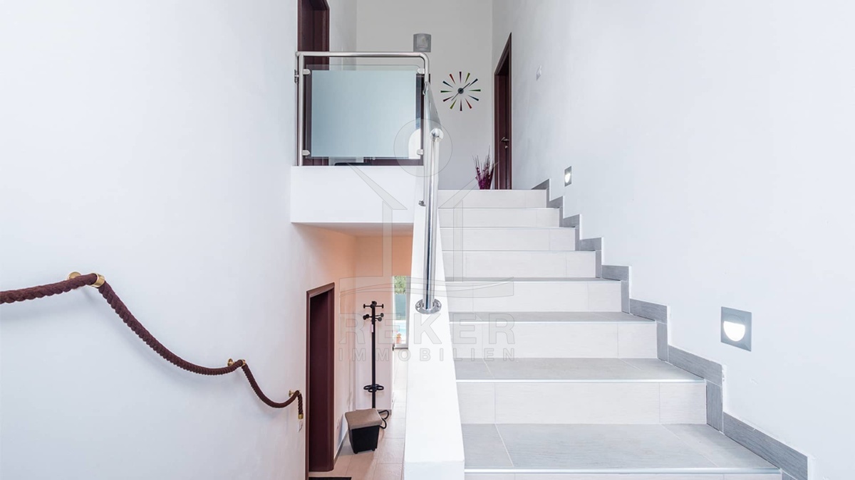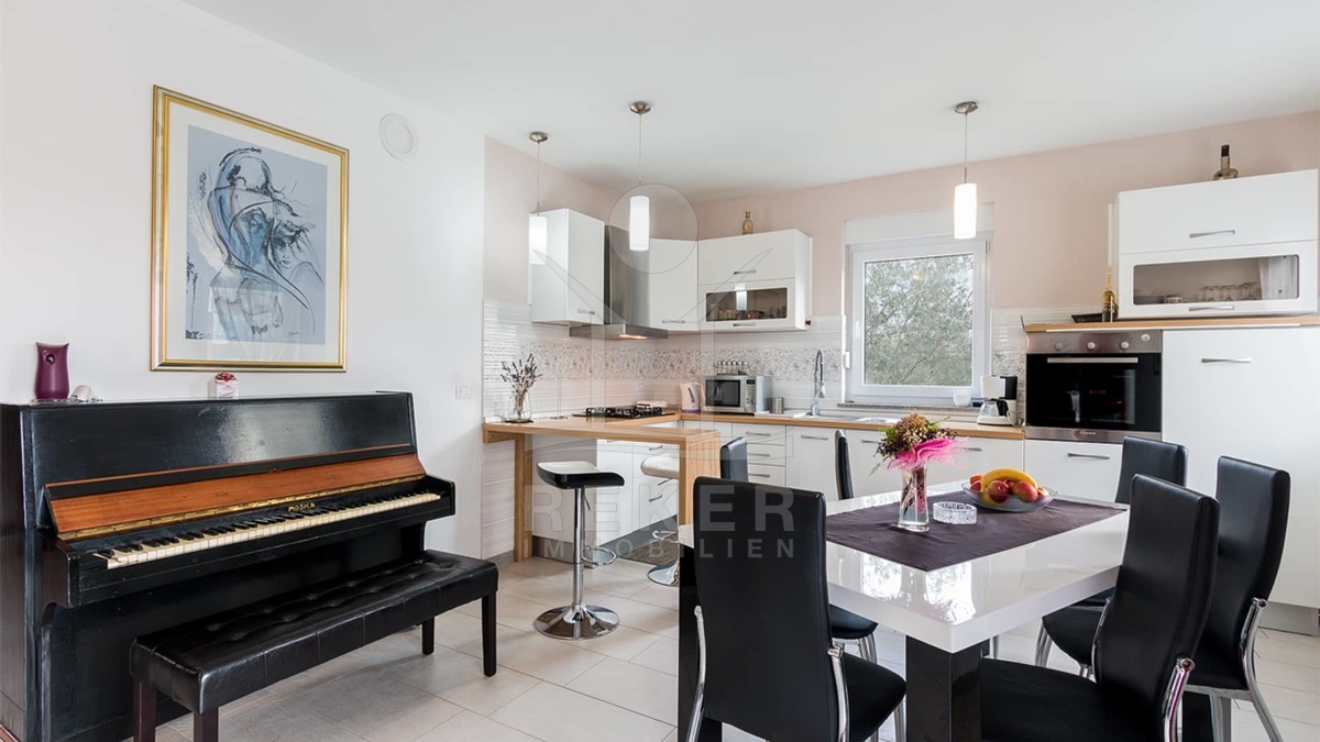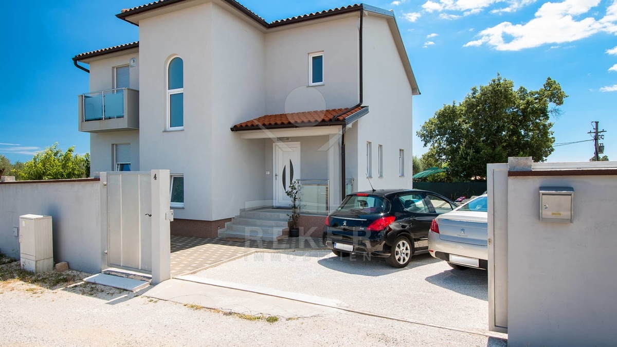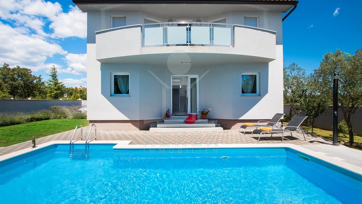 Auf einem etwa 570 m² großen, von einer Mauer umrahmten Grundstück, etwa 4 km außerhalb des Ortszentrums Vodnjans, finden Sie diese 2014 erbaute Luxus-Villa. 3 Autos finden einen Stellplatz im Freien auf dem Hof.