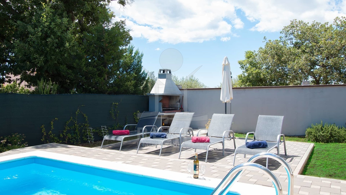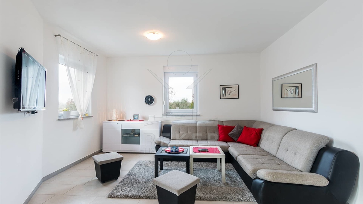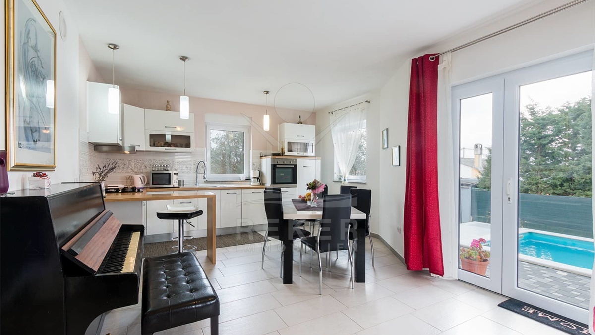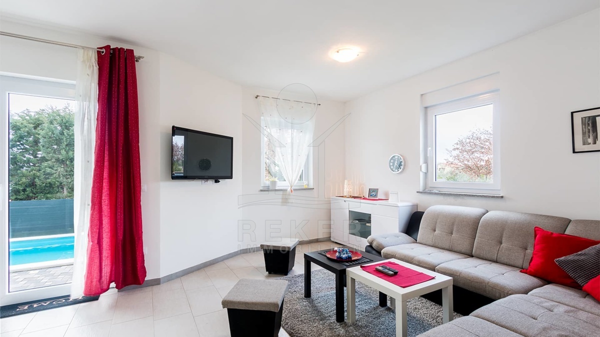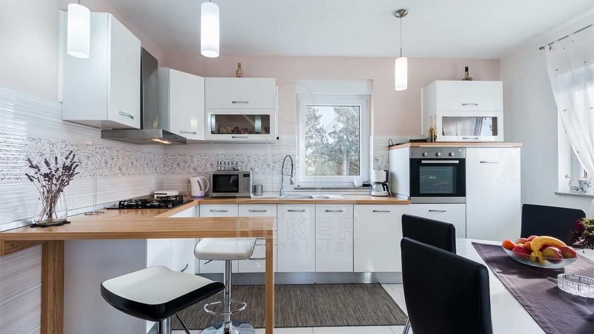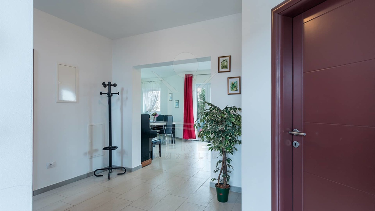 Auf einem etwa 570 m² großen, von einer Mauer umrahmten Grundstück, etwa 4 km außerhalb des Ortszentrums Vodnjans, finden Sie diese 2014 erbaute Luxus-Villa. 3 Autos finden einen Stellplatz im Freien auf dem Hof.