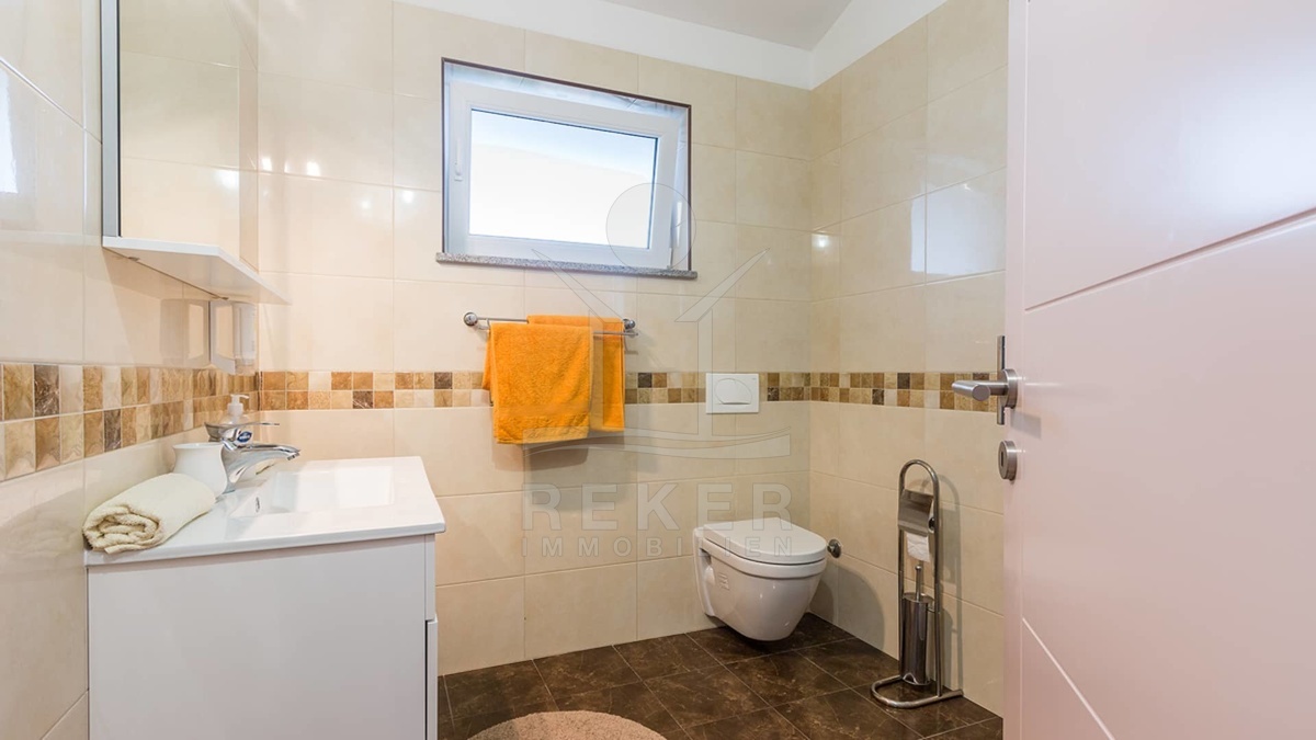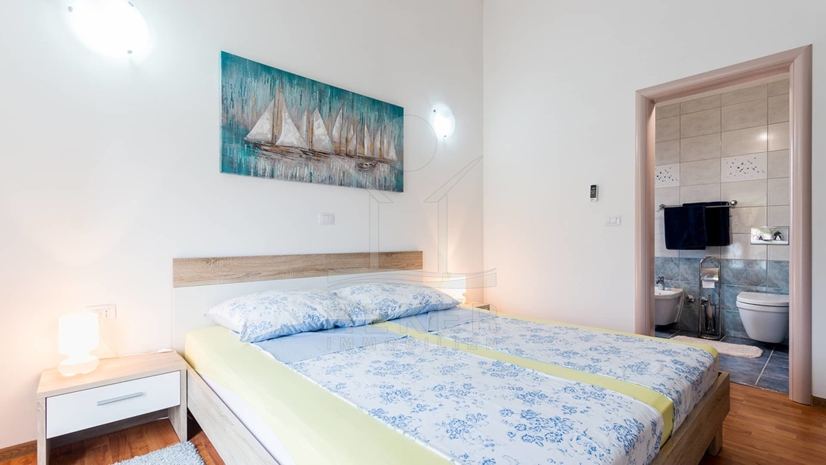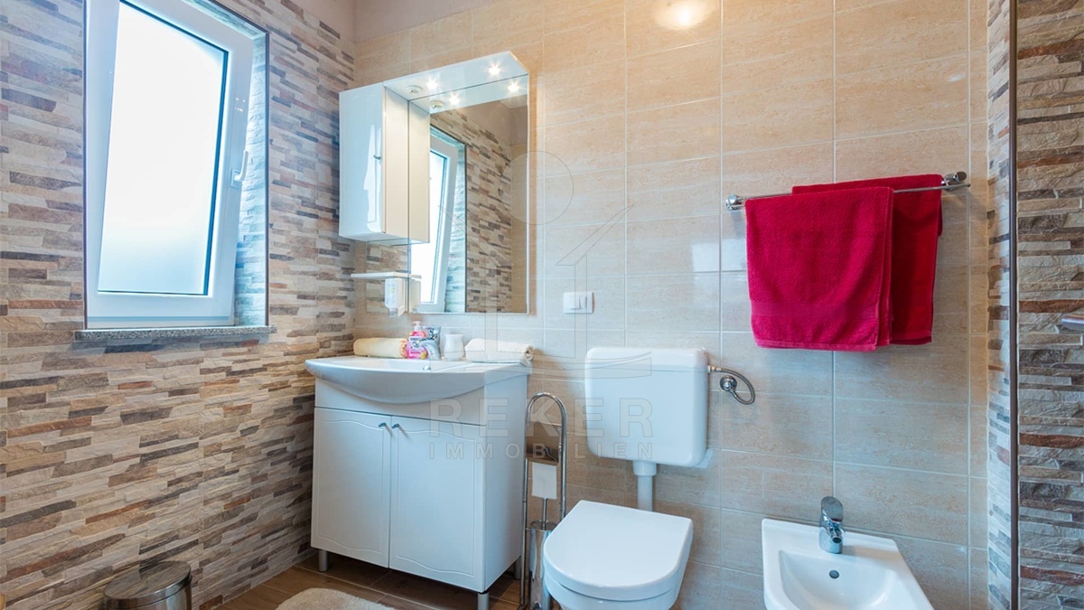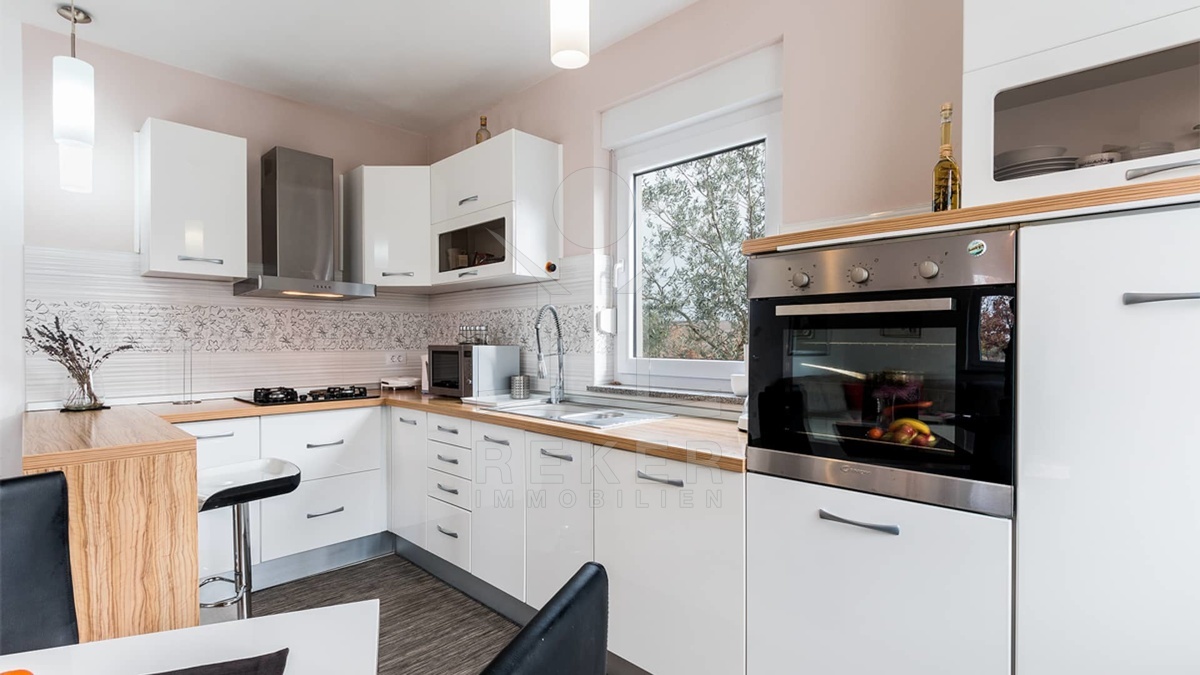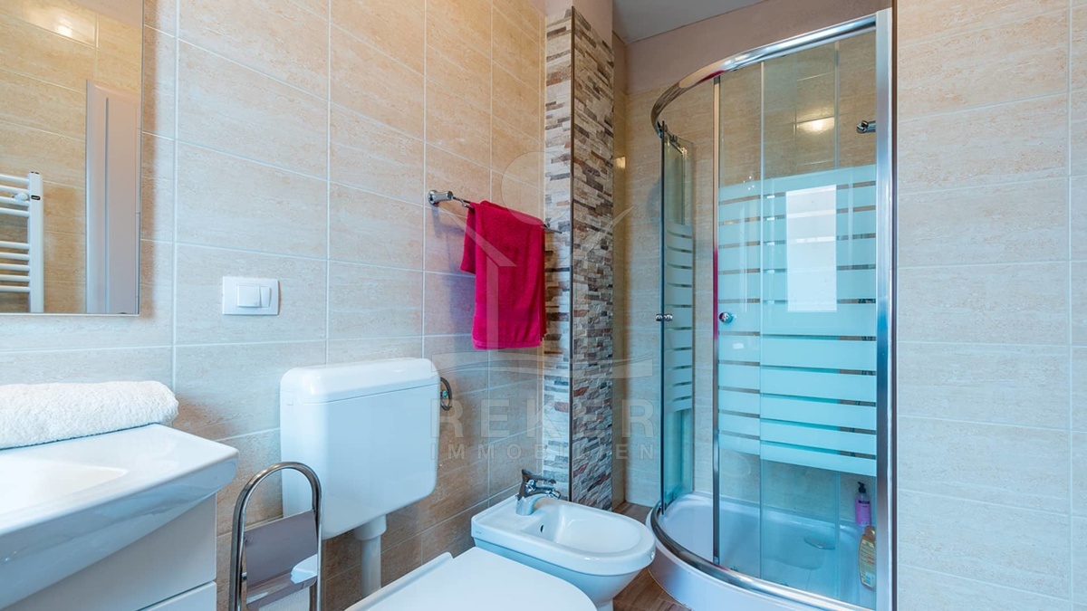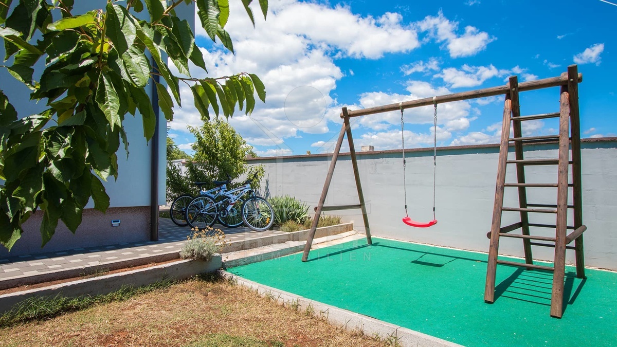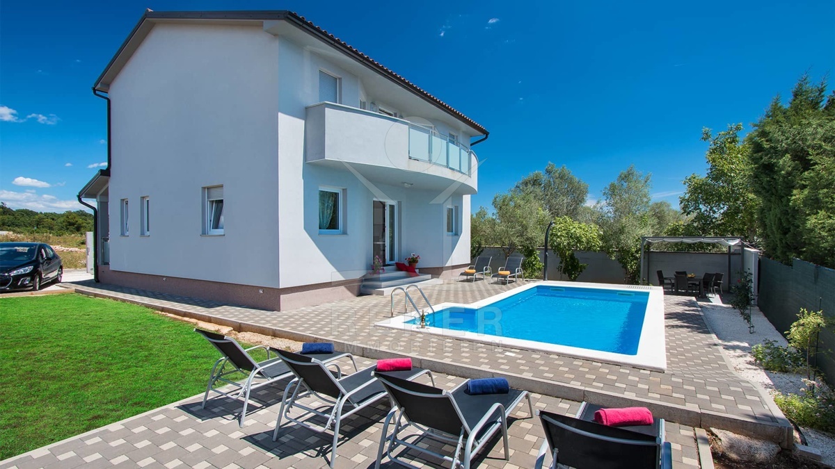 Auf einem etwa 570 m² großen, von einer Mauer umrahmten Grundstück, etwa 4 km außerhalb des Ortszentrums Vodnjans, finden Sie diese 2014 erbaute Luxus-Villa. 3 Autos finden einen Stellplatz im Freien auf dem Hof.