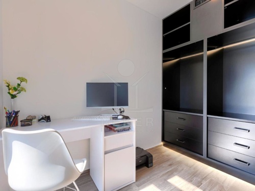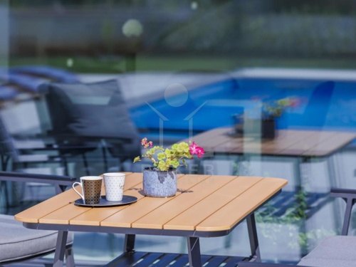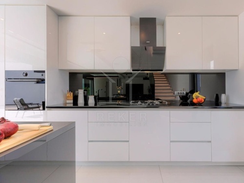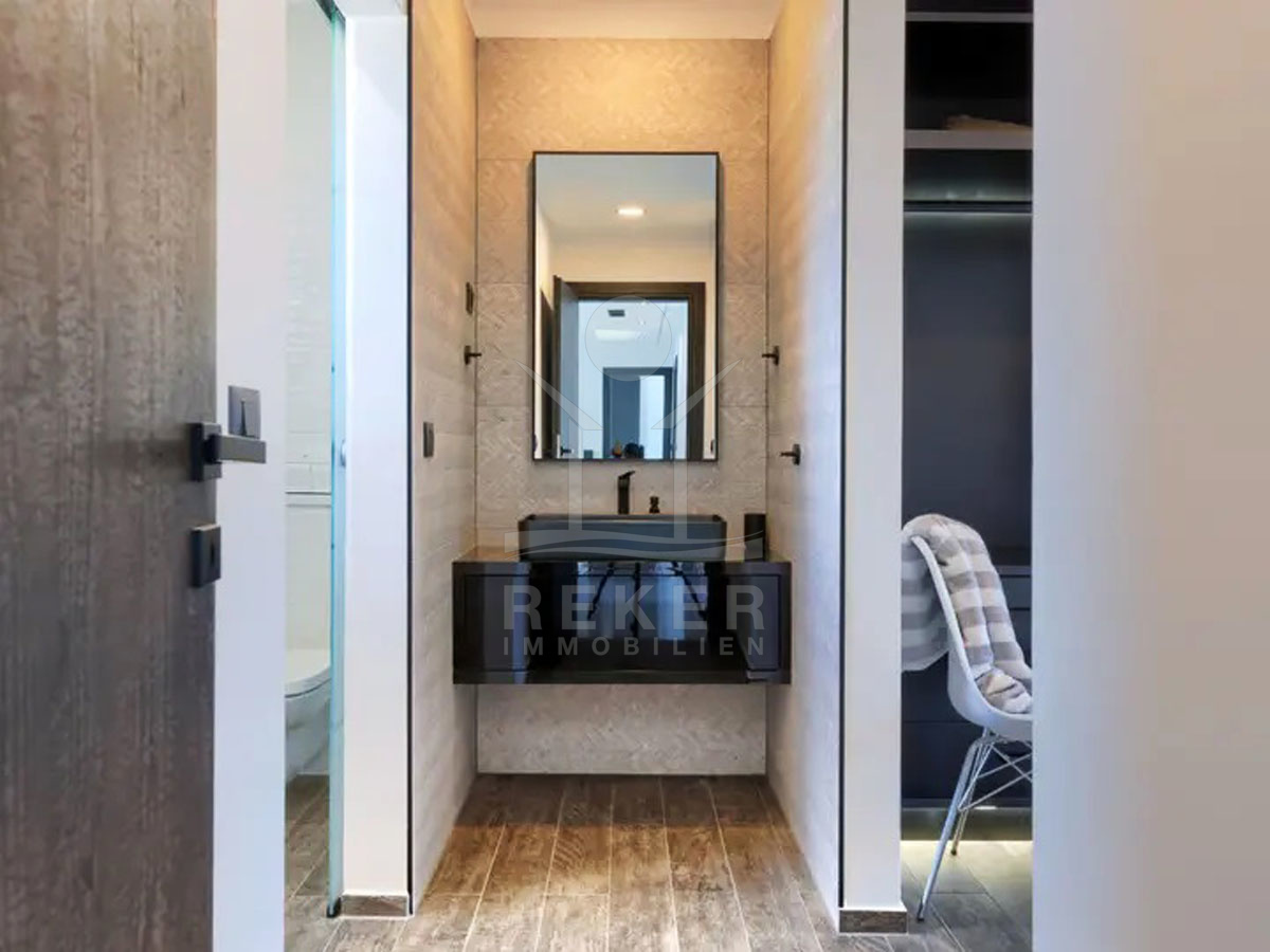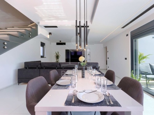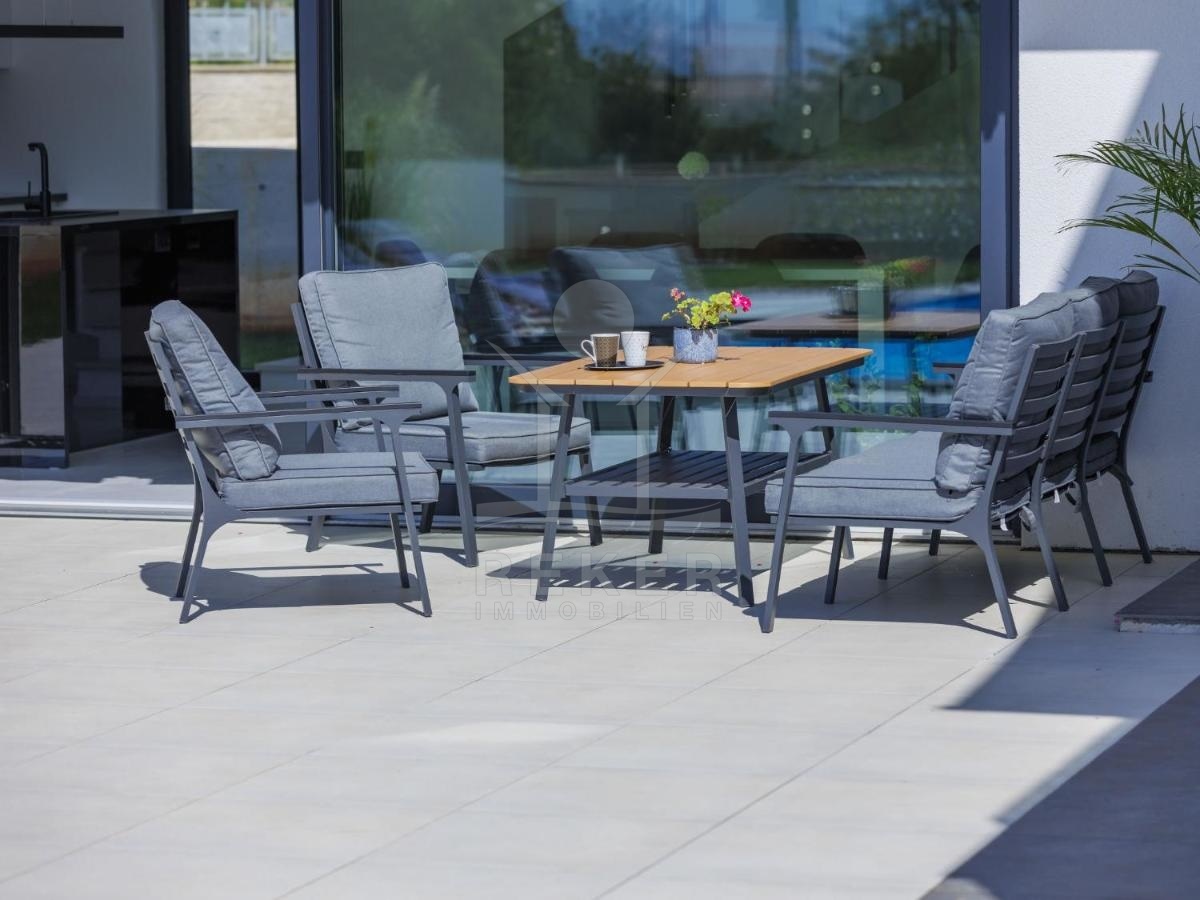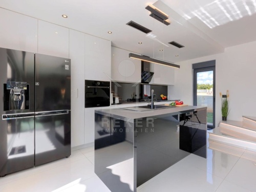 Die Villa wird möbliert verkauft und besticht durch ihre maßgefertigte Einrichtung mit klaren Linien und einem hellen Design, das eine wohlige Atmosphäre schafft. Das Erdgeschoss umfasst eine Eingangshalle, einen Abstellraum, ein Badezimmer sowie eine geräumige Küche mit Esszimmer und ein Wohnzimmer. Vom Wohnzimmer gelangen Sie auf eine nach Südwesten ausgerichtete Terrasse mit Zugang zum Sonnendeck des Swimmingpools.