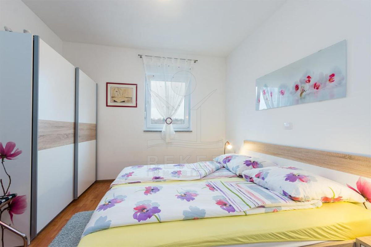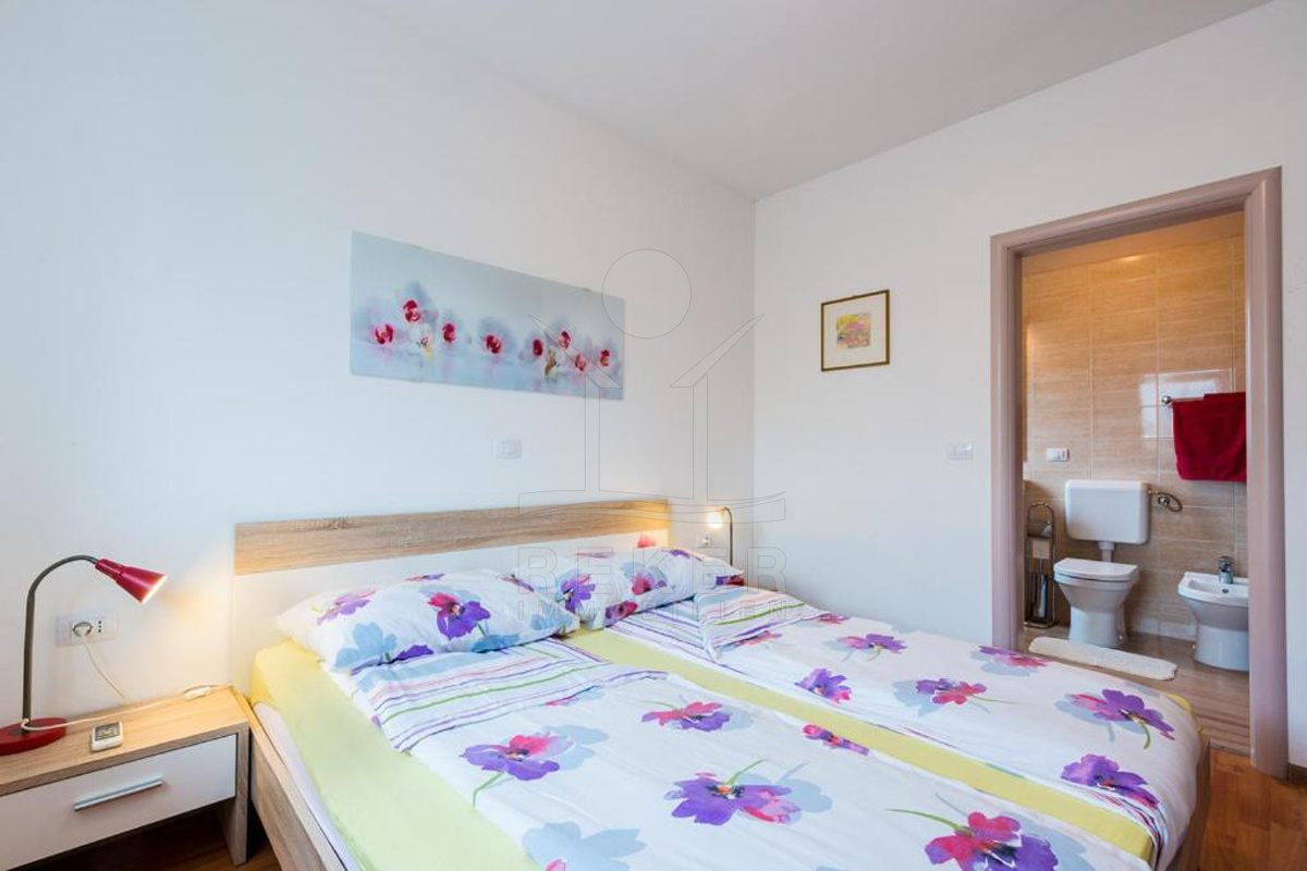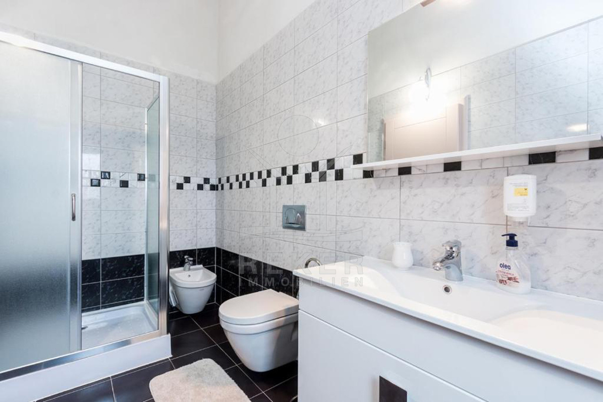 Das Erdgeschoss dieser charmanten Wohnung besticht durch einen geräumigen Flur, der in ein offenes Wohnzimmer mit voll ausgestatteter Kochzeile übergeht. Der Wohnbereich bietet direkten Zugang zur Terrasse und dem Poolbereich – ideal für entspannte Stunden im Freien. Ein gemütliches Schlafzimmer mit eigenem Badezimmer sowie ein separates WC runden die Ebene ab.