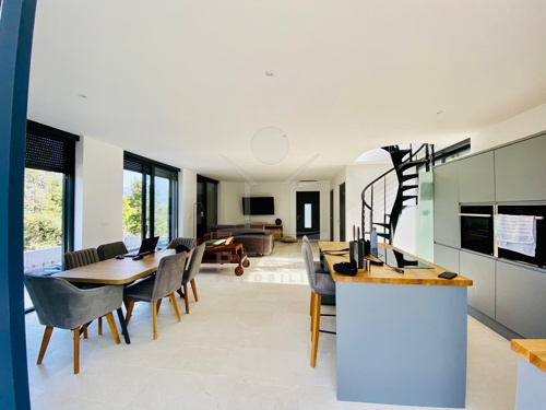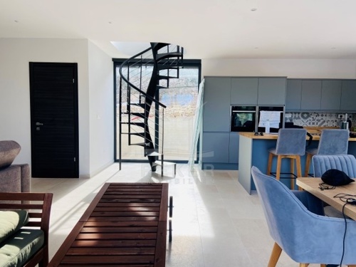 Im Untergeschoss befinden sich eine Küche, ein Wohnzimmer und zwei Zimmer, während Sie im Erdgeschoss ein weiteres Wohnzimmer mit Küche und Esszimmer, ein Badezimmer und einen Hauswirtschaftsraum finden. Komplettiert wird die Villa durch das Obergeschoss, welches über eine interne Wendeltreppe erreichbar ist. Hier sind zwei Schlafzimmer mit eigenen Badezimmern und ein großer Balkon. Dazwischen ist ein Raum, der sich perfekt zum entspannten Lesen oder Genießen der Aussicht eignet.