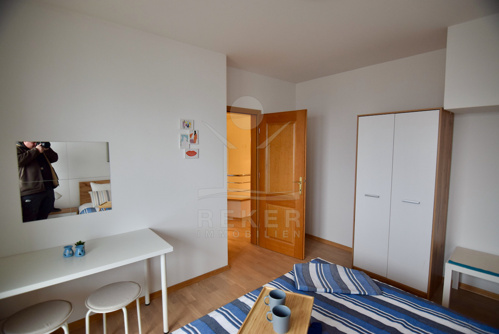 Im ersten Obergeschoss liegen die privaten Räume: vier Schlafzimmer, alle mit Balkonzugang. Zwei große Badezimmer ergänzen die Etage, darunter eins mit Badewanne und Doppelwaschbecken. Fliesen in kräftigem Blau, moderne Armaturen, helle Waschtische. Perfekt für Familien – morgens gibt’s hier keinen Stau. Die Zimmer selbst sind neutral gehalten, gut geschnitten und flexibel nutzbar – Kinderzimmer, Homeoffice oder Gästezimmer, alles möglich.