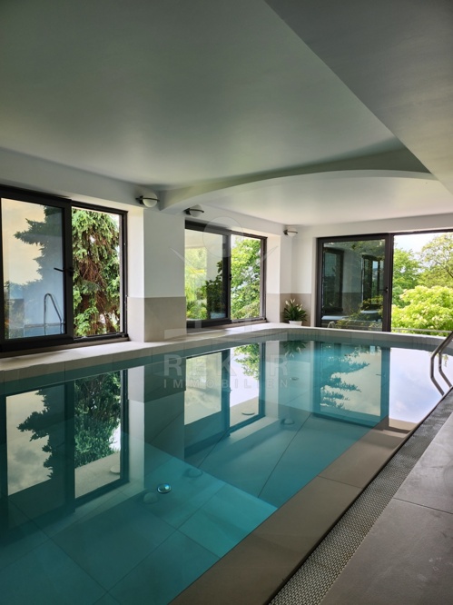 Und dann kommt das Untergeschoss: Der beheizte Pool ist perfekt in Szene gesetzt. Große Glasflächen lassen viel Licht herein und öffnen den Blick ins Grüne. Der Raum wirkt hochwertig, ruhig, durchdacht. Neben dem Poolbereich gibt es noch ein Bad mit Dusche, eine Waschküche und einen weiteren Raum – ideal als Gästezimmer oder auch als privates Office mit Spa-Anschluss.