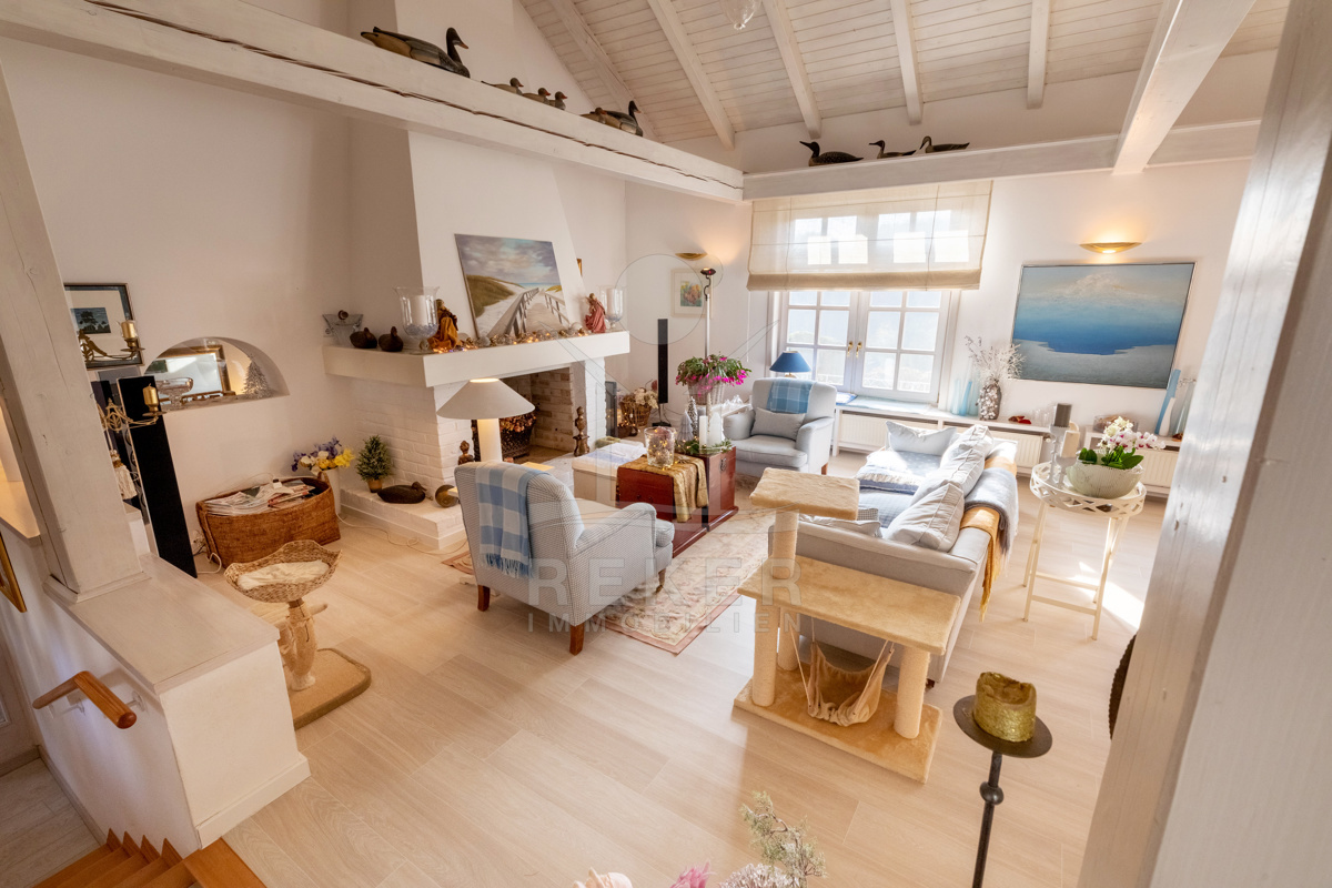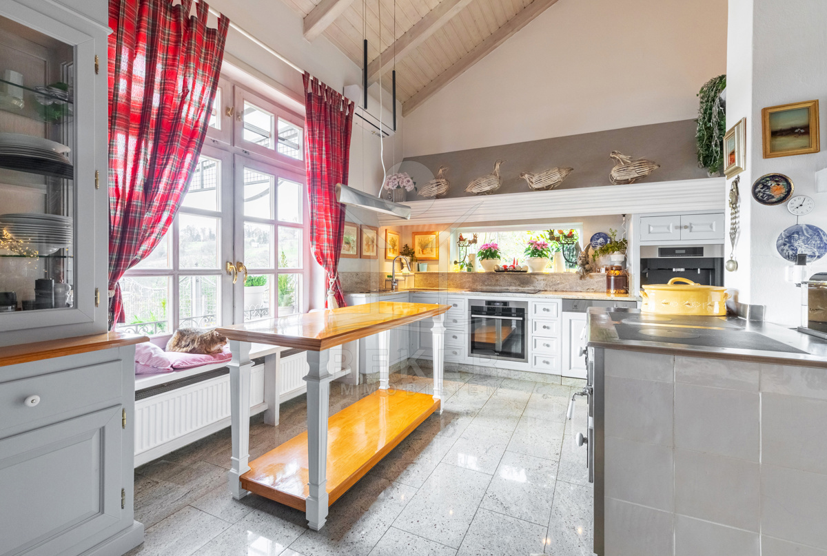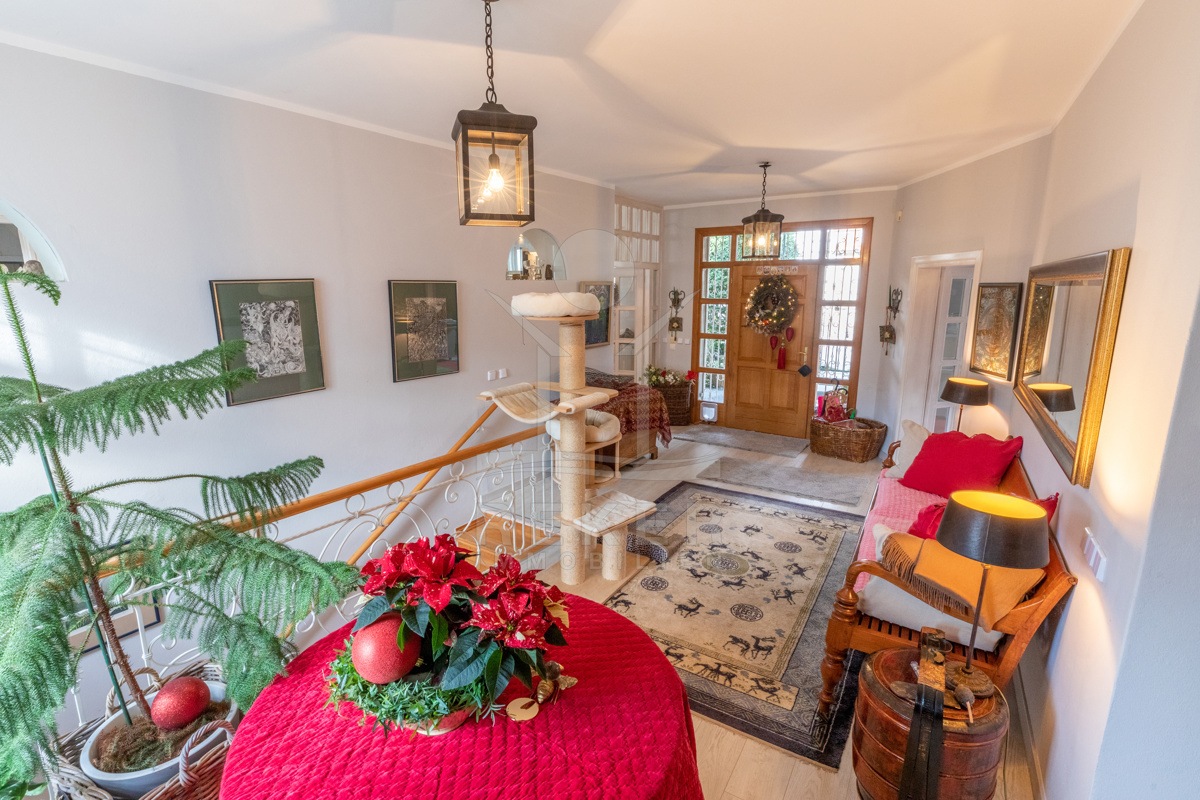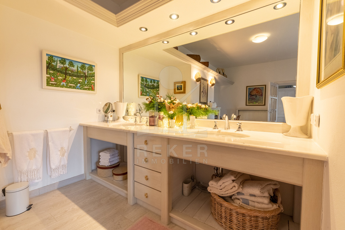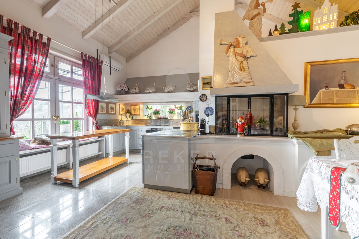 Die beeindruckende Villa erstreckt sich über 3 Etagen auf einem großzügigen Grundstück von 1.676 m². Mit einer Wohnfläche von 616 m², die im Jahr 2001 im eleganten Landhausstil errichtet wurde, vermittelt sie ein Gefühl von Wärme und Eleganz. Die hohen Decken mit Balken, der einladende Kamin und das schöne Ambiente sorgen für ein behagliches Wohngefühl.
