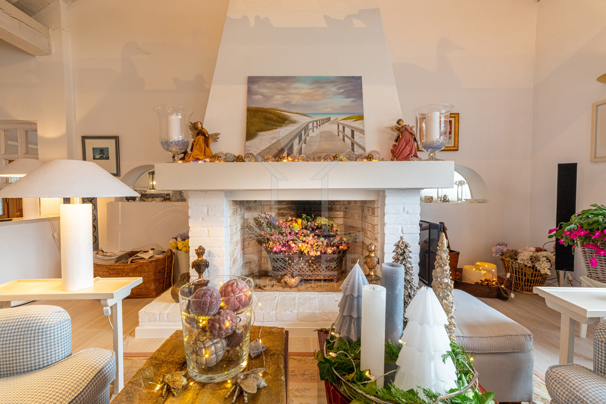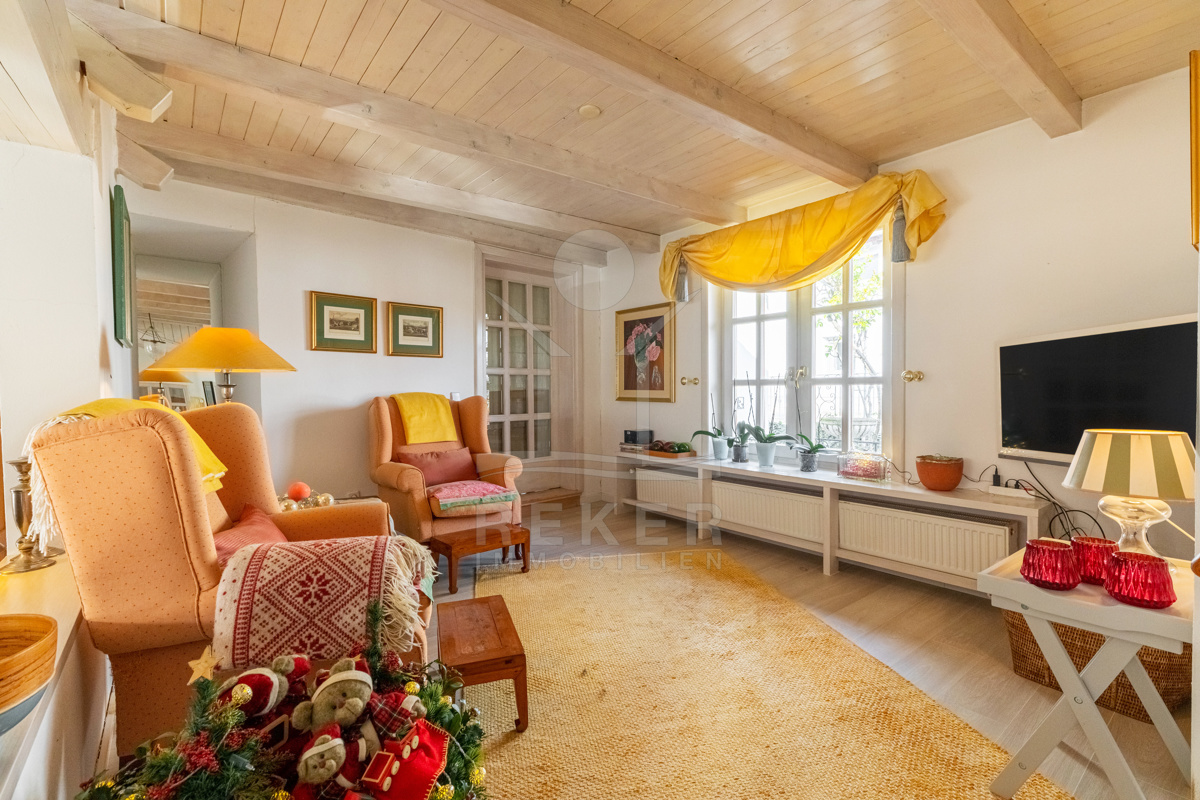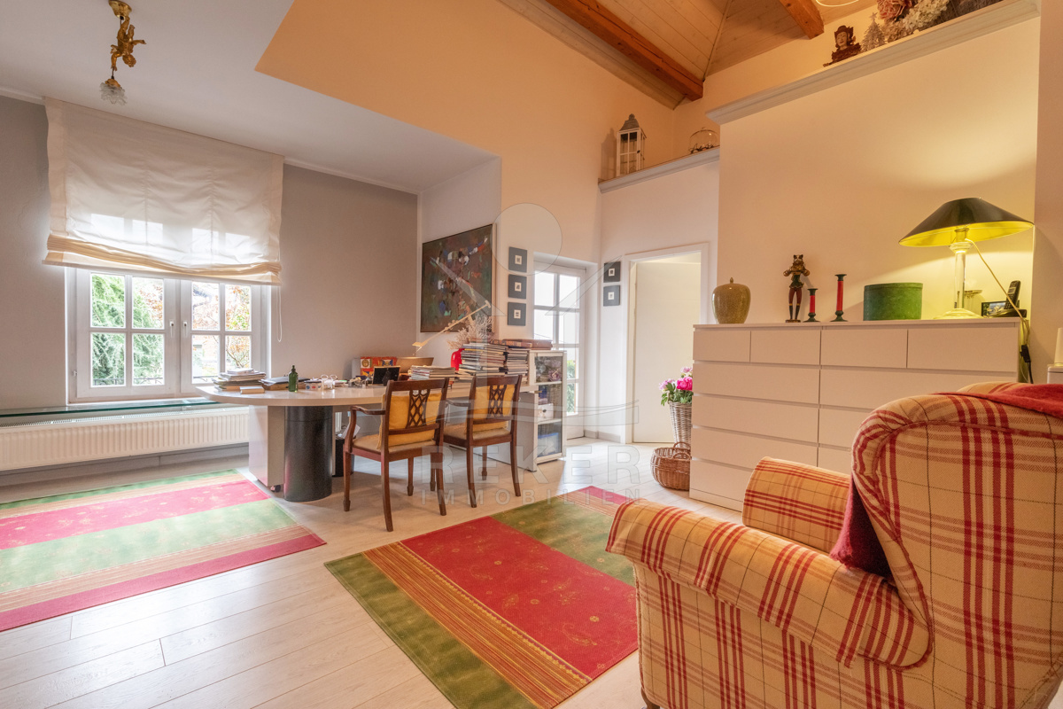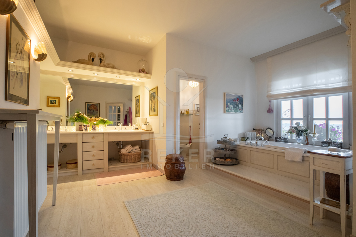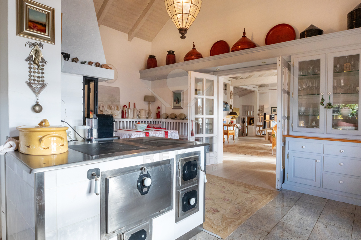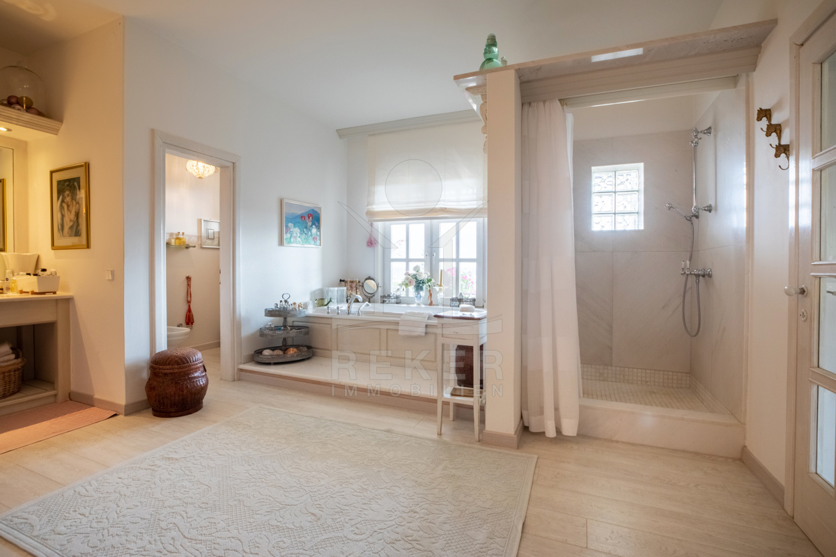 Die beeindruckende Villa erstreckt sich über 3 Etagen auf einem großzügigen Grundstück von 1.676 m². Mit einer Wohnfläche von 616 m², die im Jahr 2001 im eleganten Landhausstil errichtet wurde, vermittelt sie ein Gefühl von Wärme und Eleganz. Die hohen Decken mit Balken, der einladende Kamin und das schöne Ambiente sorgen für ein behagliches Wohngefühl.
