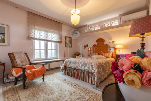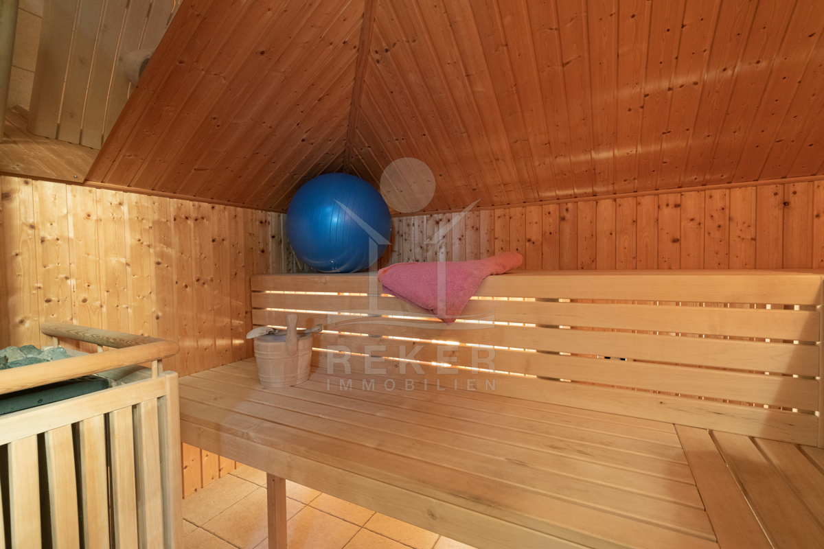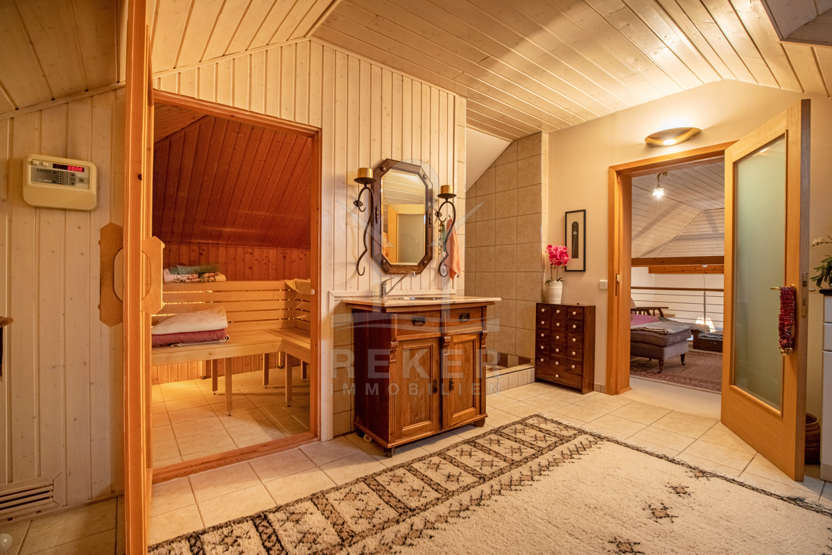 Im Obergeschoss finden Sie ein weiteres Schlafzimmer, eine gemütliche Bibliothek und eine Sauna für ultimative Entspannung und Wellness.