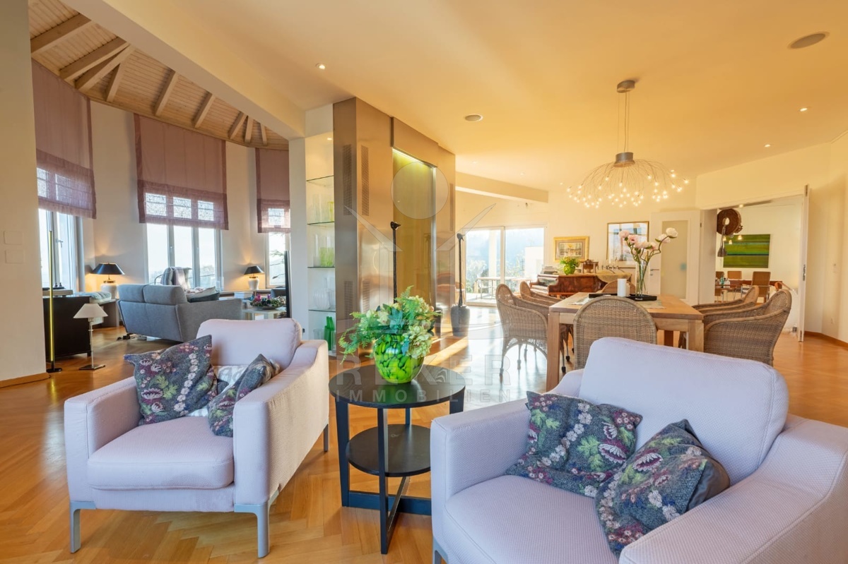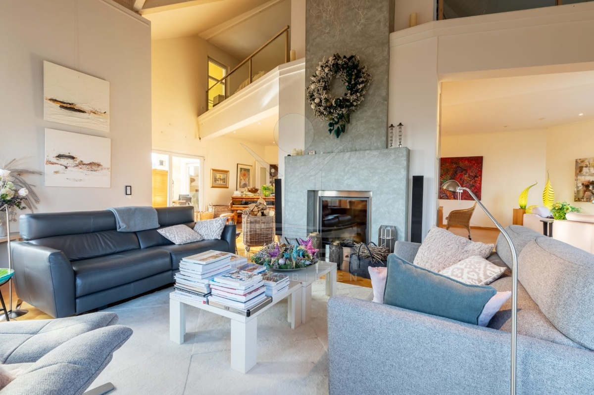 Das erste Obergeschoss beeindruckt mit einem geräumigen Foyer, Schlafzimmer, Badezimmer, einer modernen Küche, einem Wohnzimmer mit Essbereich und einer Terrasse mit Blick auf die Natur. Die hohen Decken im Erdgeschoss schaffen ein Gefühl von Großzügigkeit und Lichtdurchflutung.