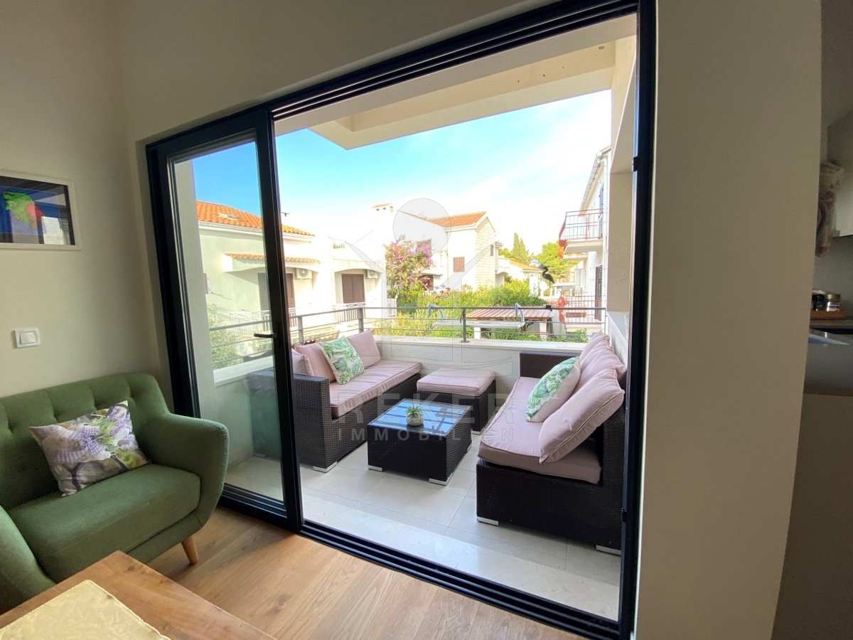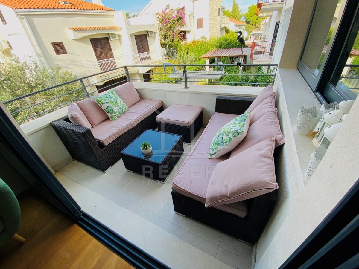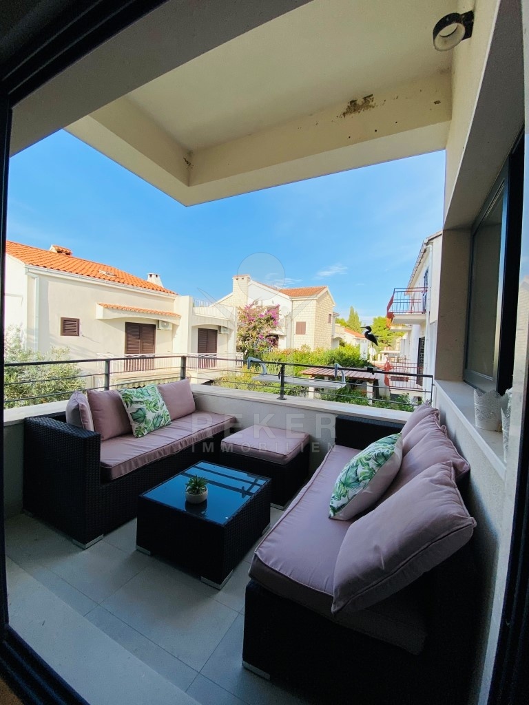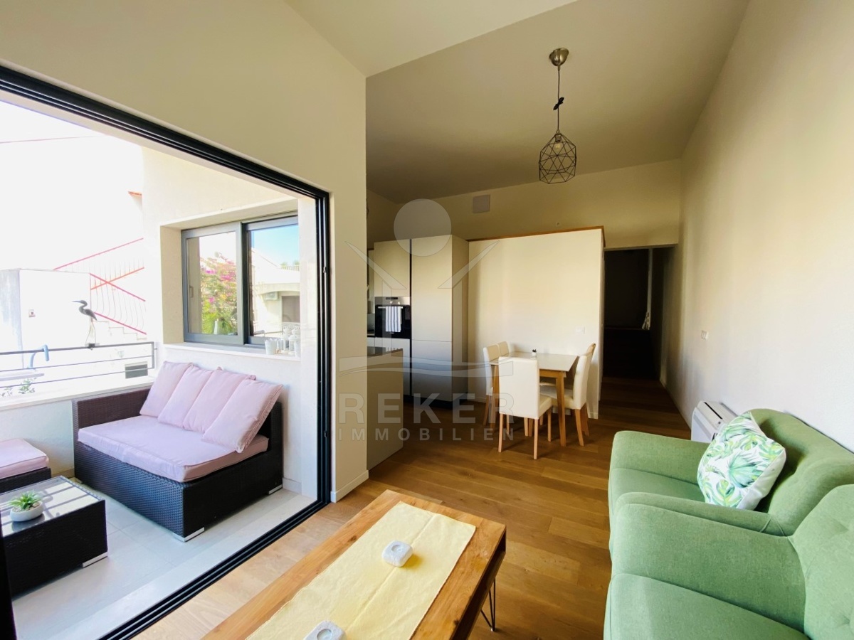 Die Wohnung mit 53 m² wird vollständig inklusive Möbeln verkauft, sodass Sie sofort einziehen können. Die moderne und funktionale Raumaufteilung umfasst zwei gemütliche Schlafzimmer, ein stilvolles Bad, eine einladende Küche, ein Esszimmer und ein offenes Wohnzimmer, das oft als Herzstück des Zuhauses dient. Die Wohnung verfügt außerdem über eine Loggia, die ideal zum Entspannen im Freien und zum Genießen des mediterranen Ambientes ist. Für zusätzlichen Stauraum sorgt die Speisekammer im Keller, während der Außenparkplatz bequemes Parken ermöglicht und direkten Zugang zur Wohnung bietet.