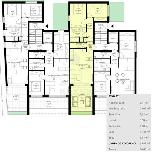 Drinnen erwarten Sie 59,82 m² Wohnfläche: ein heller Wohn- und Essbereich mit Küche, zwei Schlafzimmer, ein Bad, ein Abstellraum sowie Flur und Eingangsbereich. Praktisch geschnitten, gut nutzbar. Für angenehmes Raumklima sorgen Klimaanlagen in allen Zimmern. Im Bad wärmt eine Fußbodenheizung.