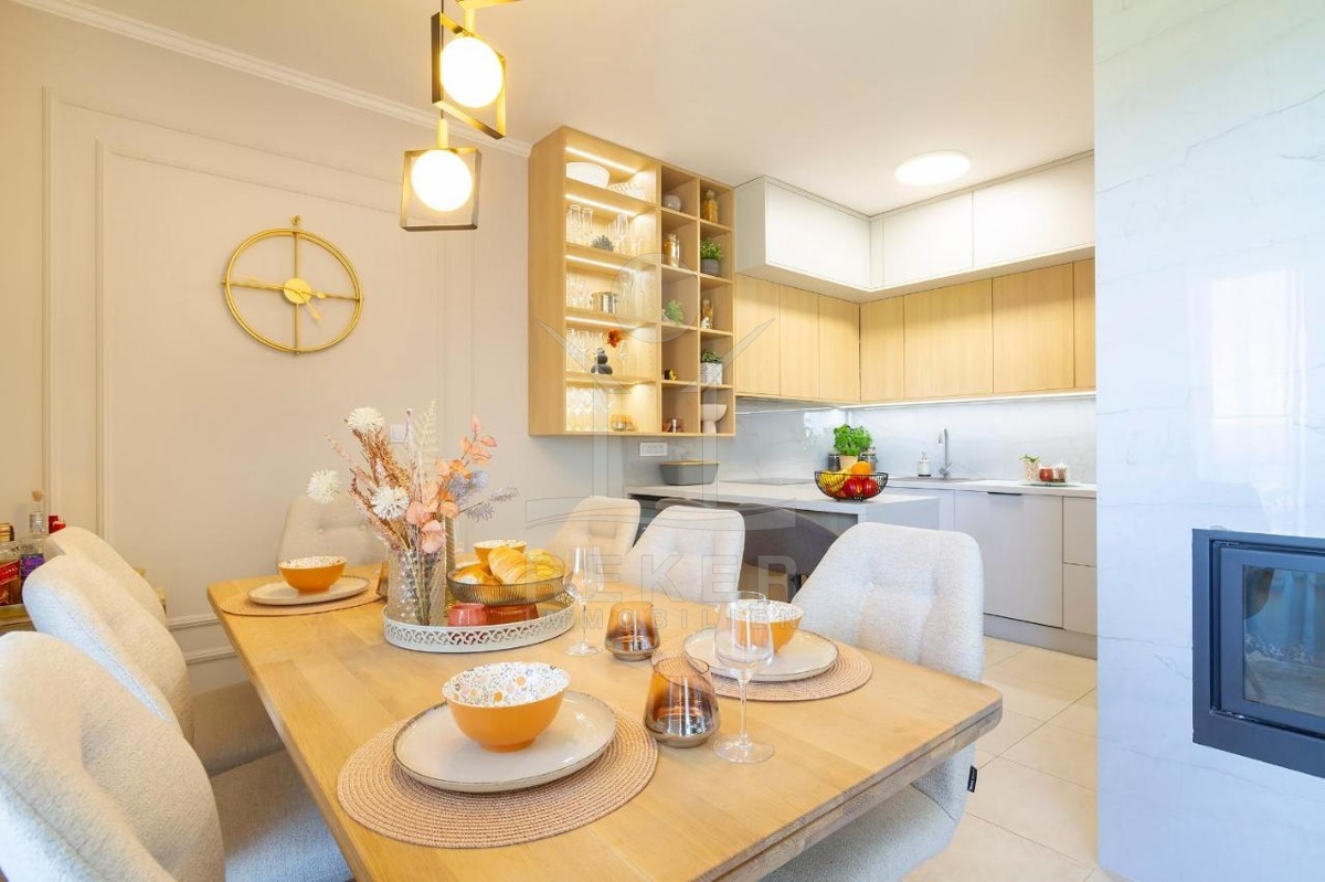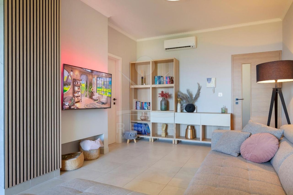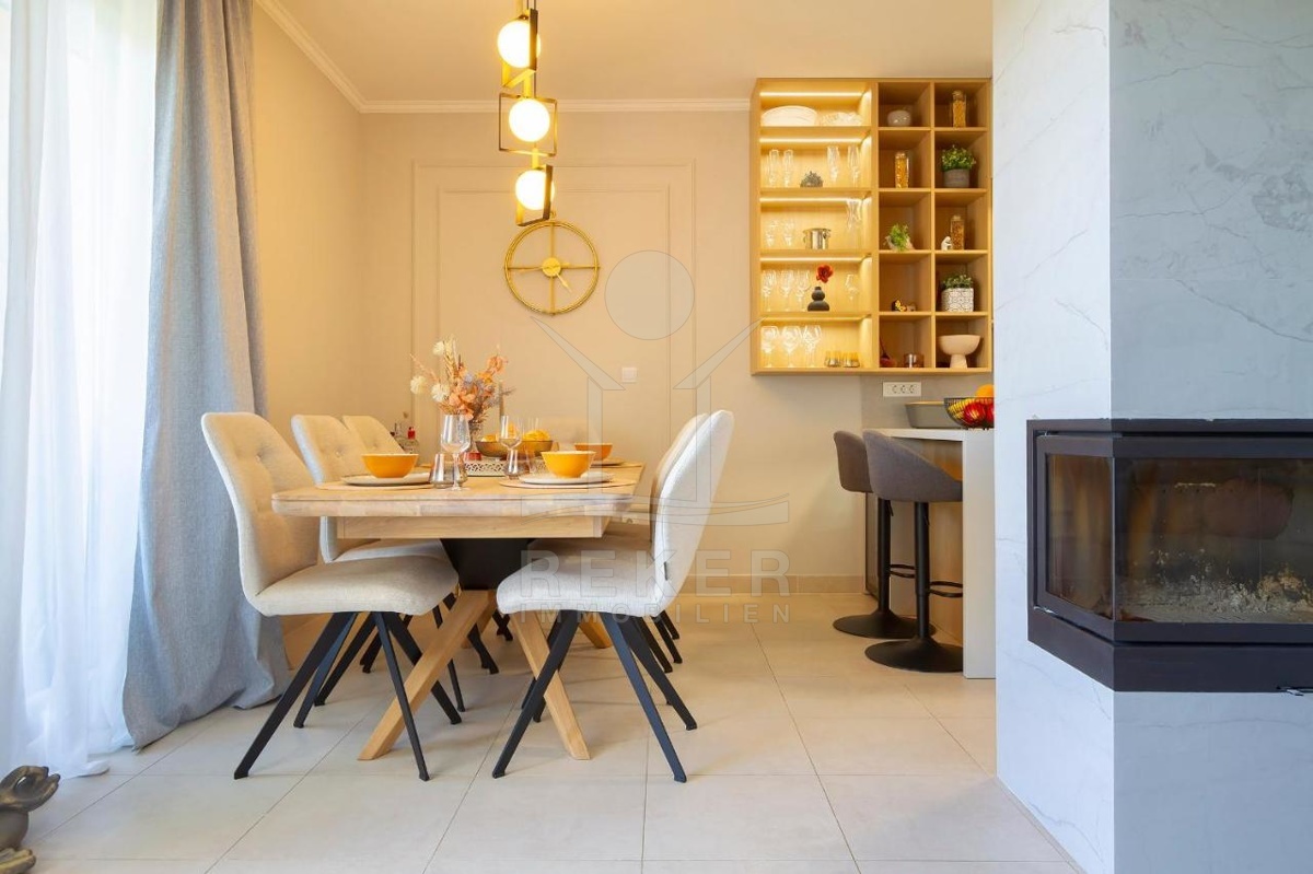 Im ersten Teil des Apartments befindet sich ein Wohnbereich, der dank seiner Südwestausrichtung überaus hell ist. Dieser umfasst ein Wohnzimmer, ein Esszimmer und eine voll ausgestattete Küche. Das Highlight des Wohnzimmers ist ein schöner Holzkamin, der im Winter für eine gemütliche Atmosphäre sorgt und als zusätzliche Heizmöglichkeit dient. Das Esszimmer ist der ideale Ort für Familientreffen, während die Küche mit ihrer hochwertigen Ausstattung selbst anspruchsvolle Mahlzeiten zubereiten kann. Vom Wohnzimmer aus gelangt man auf eine großzügige Terrasse mit Panoramablick auf das Meer, die sich ideal für Entspannung und das Genießen der wunderschönen Sonnenuntergänge eignet.