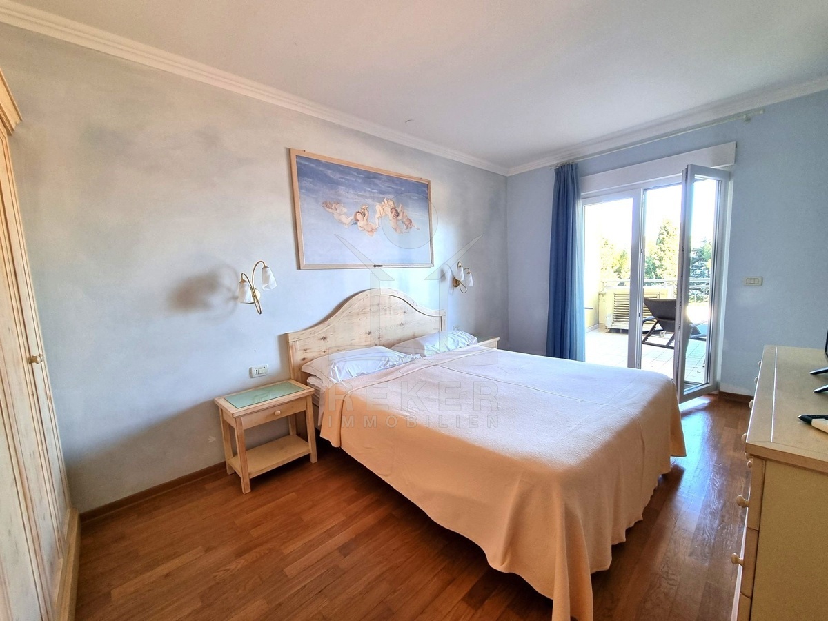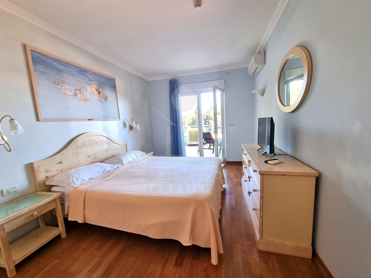 In Crveni Vrh bei Umag, nur 130 Meter vom Meer entfernt, wartet dieses gepflegte Apartment auf neue Bewohner. Das Stadtzentrum von Umag ist 3,5 Kilometer entfernt und schnell erreichbar. Optional können Sie einen Stellplatz oder eine Garage erwerben, was den Alltag erleichtert. Als Bewohner nutzen Sie zudem einen gepflegten Gemeinschaftshof. Exklusive Annehmlichkeiten runden das Gesamtbild ab: Außenpool, Fitnessbereich sowie vergünstigter Zugang zu Hallenbad und Golfangeboten. Das Apartment besticht durch seine besondere Nähe zum Meer, die großzügigen Terrassenflächen und die Möglichkeit, sofort einzuziehen oder es als Ferienimmobilie zu nutzen.