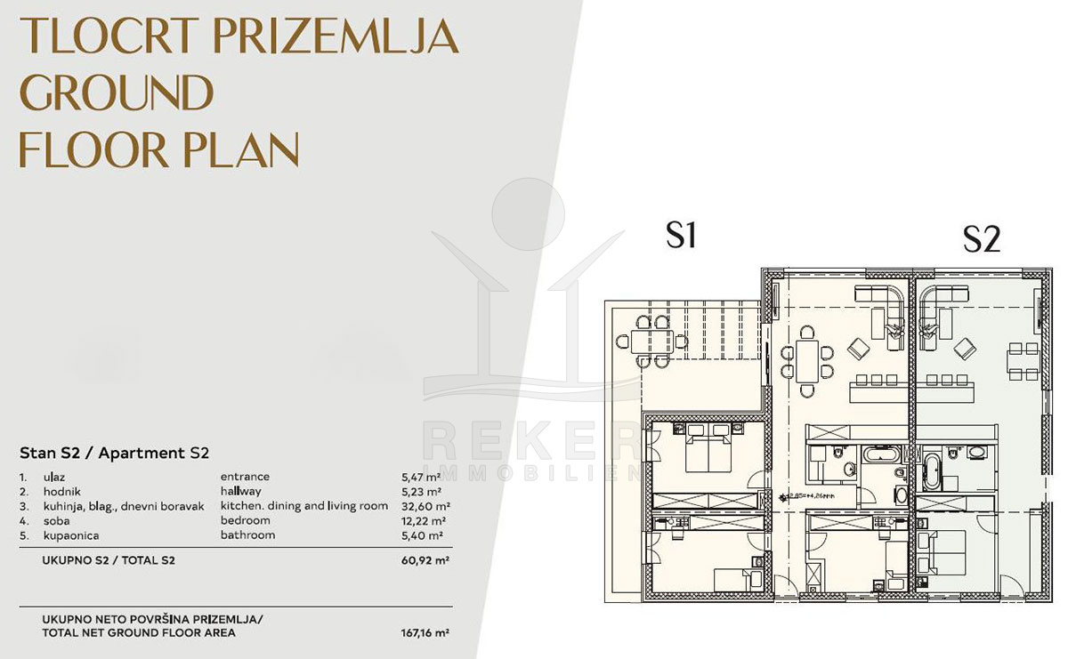 Die Wohnung S2 im ersten Stock bietet auf 60,92 m² ein angenehmes Raumgefühl mit zwei Zimmern und einem Badezimmer. Große Fenster mit dreischichtigem Glas öffnen den Blick auf die Adria und lassen viel Tageslicht in die Räume. Hochwertige Materialien und moderne Baustandards schaffen Komfort und hohe Energieeffizienz. Sicherheitstüren, Klimaanlage und Internetanschluss gehören zur Ausstattung. Die Wohnung wird unmöbliert übergeben, sodass Sie Ihre eigene Einrichtungsidee verwirklichen können.