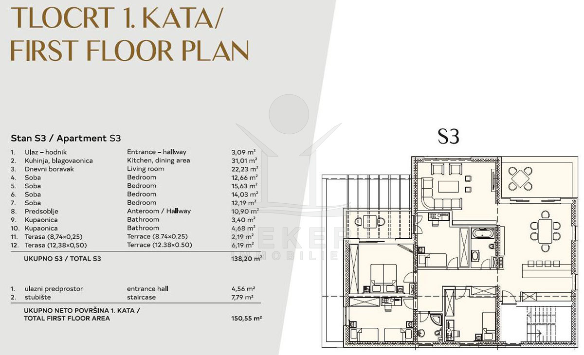 Die Wohnung S3 nimmt die gesamte zweite Etage ein und bietet auf 129,82 m² viel Platz. Zwei großzügige Terrassen mit zusammen über 21 m² eröffnen einen freien Blick auf das Meer. Ein Platz, um Sonne und Meeresrauschen ganz für sich zu genießen.