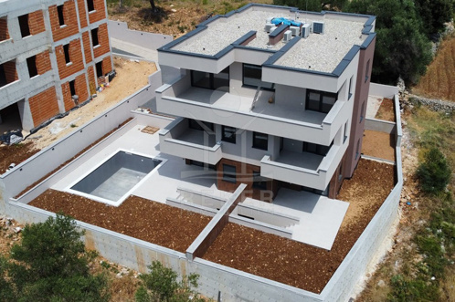 Das Haus ist frisch fertiggestellt und umfasst nur fünf Wohnungen auf drei Etagen. Die Architektur setzt auf klare Linien und moderne Formen: warme Naturtöne, Flachdach, großzügige Terrassen. Vor dem Eingang gibt es markierte Parkplätze. Auf der Rückseite wurde das Grundstück terrassiert und gestaltet mit jungen Bäumen, mediterranen Sträuchern und hellen Steinen. Dank der Hanglage genießen Sie schöne Ausblicke und viel Tageslicht. Der Zugang erfolgt bequem über das zentrale Treppenhaus. Alles ist neu, unbewohnt und bereit für den Erstbezug 2025.