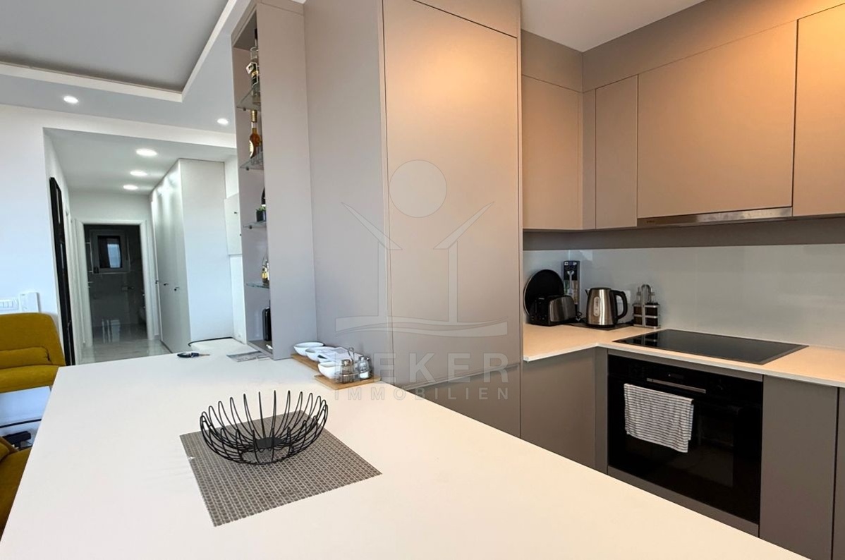 Die Wohnung bietet auf knapp 80 m² zwei Schlafzimmer, ein helles Wohnzimmer mit offener Küche und Essbereich, ein Bad sowie einen Flur. Alles wirkt luftig und gut durchdacht. Das Highlight? Eine große, überdachte Terrasse mit 17,5 m². Ihr Frühstück mit Blick aufs Meer? Auch die Ausstattung passt: Klimaanlage, moderne PVC-Fenster, Sicherheitstür, maßgefertigte Möbel, hier wurde an alles gedacht, damit Sie sich um möglichst wenig kümmern müssen.