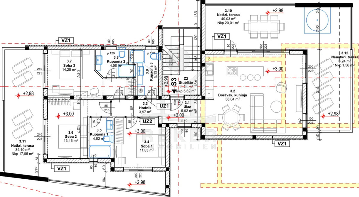 Dies großräumige Neubauwohnung bietet beeindruckende 180 m² Wohnfläche und besticht durch einen einladenden Eingangsbereich. Der offene Wohnbereich kombiniert Wohnzimmer, Küche und Esszimmer harmonisch miteinander und schafft so eine einladende Atmosphäre für gesellige Abende. Die Wohnung verfügt über 3 komfortable Schlafzimmer, und 3 Badezimmer, die Ihnen ausreichend Platz für Ruhe und Entspannung bieten. Zwei dieser Schlafzimmer haben den besonderen Vorteil, dass sie direkten Zugang zu einer überdachten Terrasse von 34 m² haben, die sich ideal für entspannte Stunden im Freien eignet. Das Wohnzimmer bietet zusätzlich eine große Terrasse von 40 m², die von beiden Seiten zugänglich ist und perfekten Raum für gesellige Zusammenkünfte im Freien oder einfach nur zum Relaxen an sonnigen Tagen bietet.