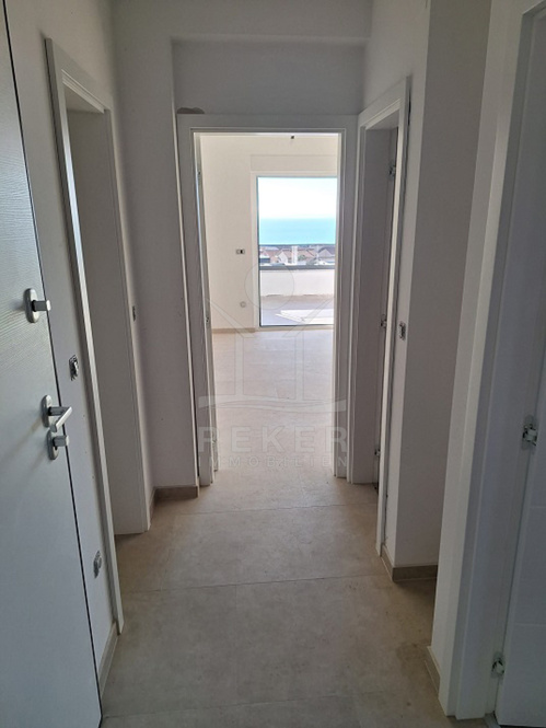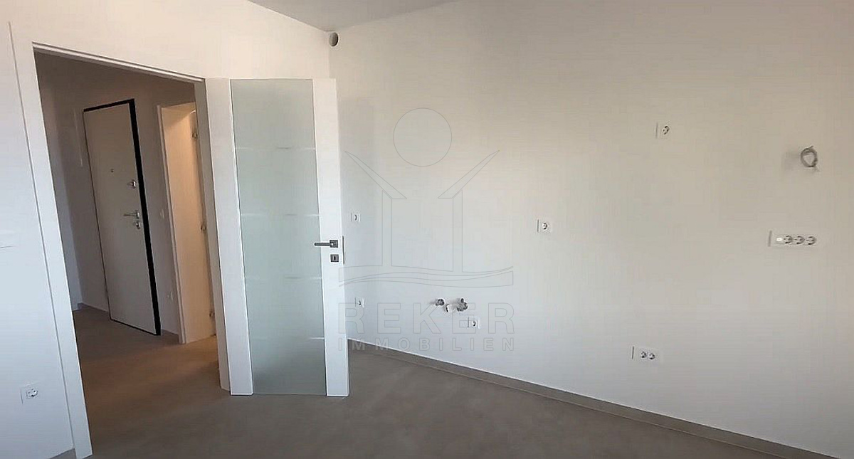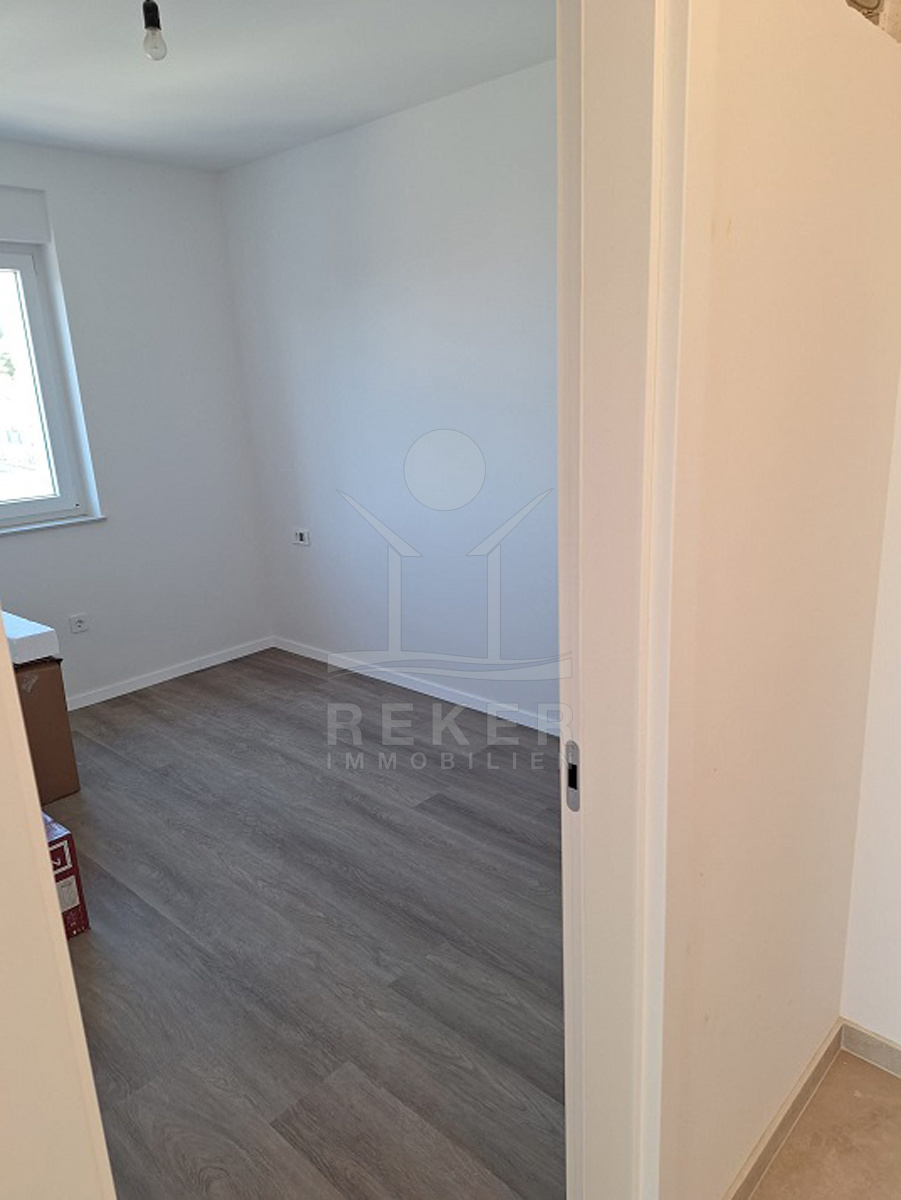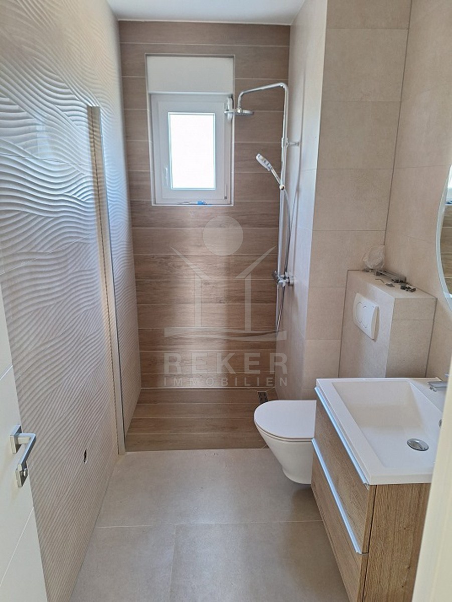 Diese Wohnung liegt ganz oben – im 2. OG – und bietet einen fantastischen Blick aufs Meer. Der offene Wohnbereich ist lichtdurchflutet und führt direkt auf den großzügigen Balkon. Von hier sehen Sie über Dächer, grüne Gärten und hinaus aufs Wasser. Innen gibt’s zwei ruhige Schlafzimmer, ein großes Bad mit begehbarer Dusche, ein separates WC und einen kleinen Abstellraum. Die Ausstattung wirkt modern und hochwertig: helle Fliesen, bodentiefe Fenster, stilvolle Badmöbel. TV- und Telefonanschlüsse sind in allen Räumen vorhanden. Hier oben wohnt man ruhig, hell – und mit richtig guter Aussicht.