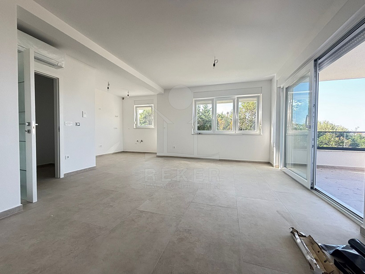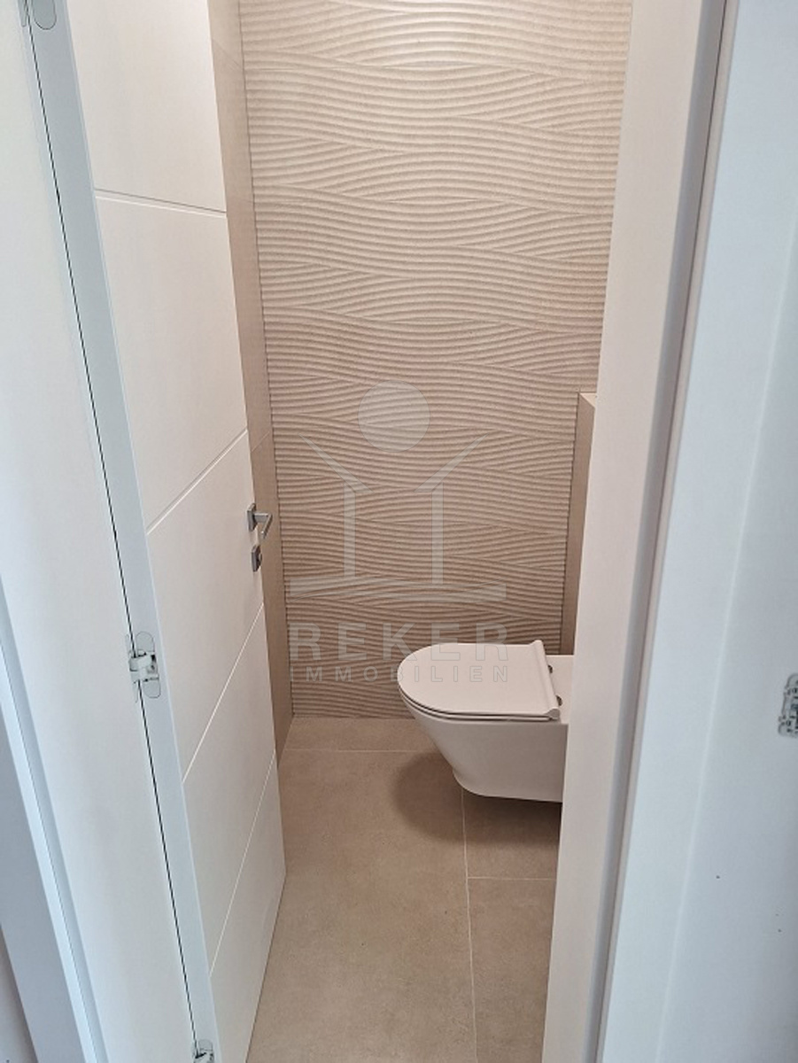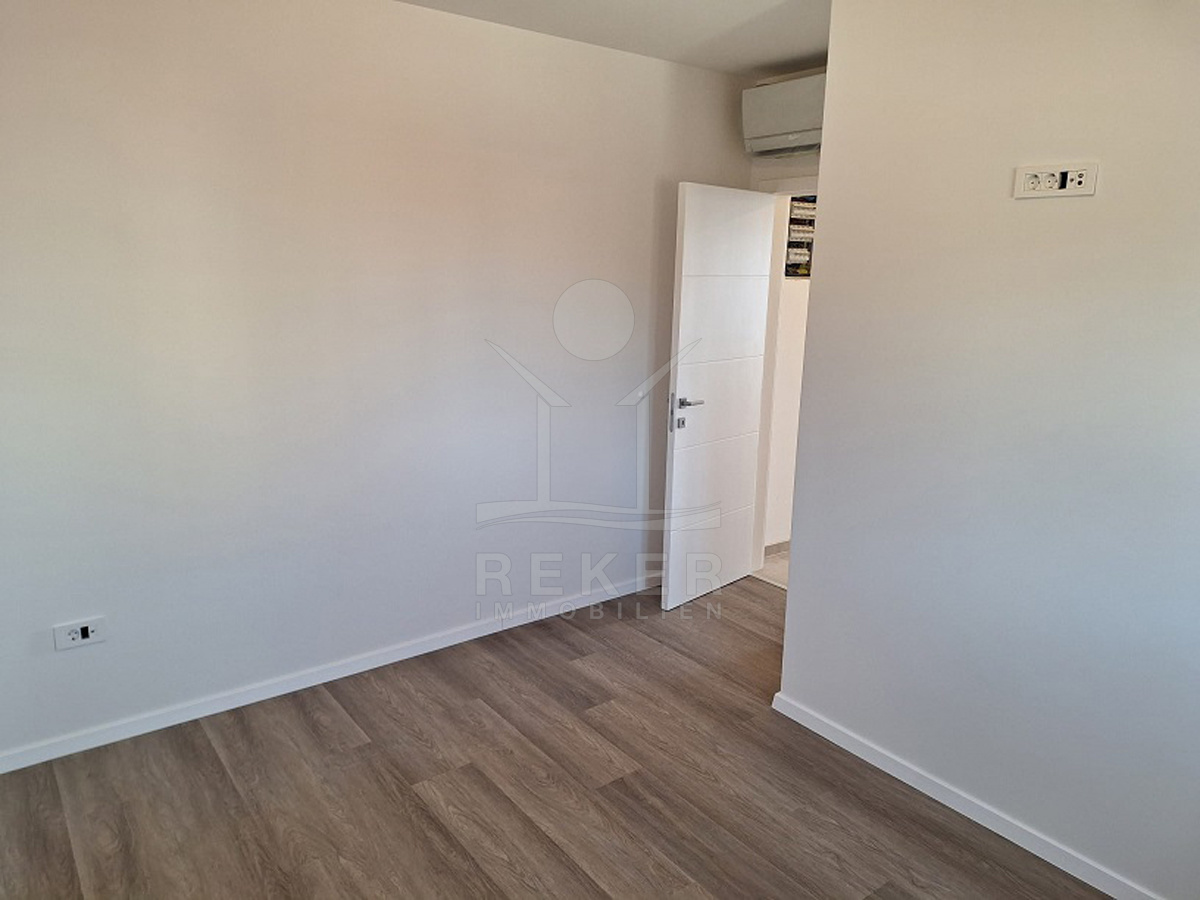 Die Wohnung befindet sich im obersten Stockwerk des Gebäudes, hell, ruhig und mit viel Privatsphäre. Das Zentrum der Wohnung ist der großzügige Wohnraum mit offener Küche und Essbereich. Drei Fenster lassen hier viel Licht hinein, dazu kommt der Zugang zum Balkon: westlich ausgerichtet und mit weitem Blick bis zum Meer.Der Balkon ist überdacht und gut geschnitten, ideal für den Alltag draußen. Abendsonne inklusive. Innen gibt es ein separates Schlafzimmer, ein modernes Badezimmer mit bodengleicher Dusche und hochwertigen Badmöbeln sowie ein zusätzliches Gäste-WC. Ein praktischer Abstellraum ergänzt die Wohnfläche. Alle Räume sind klimatisiert. TV- und Internetanschlüsse sind in allen Zimmern bereits installiert.