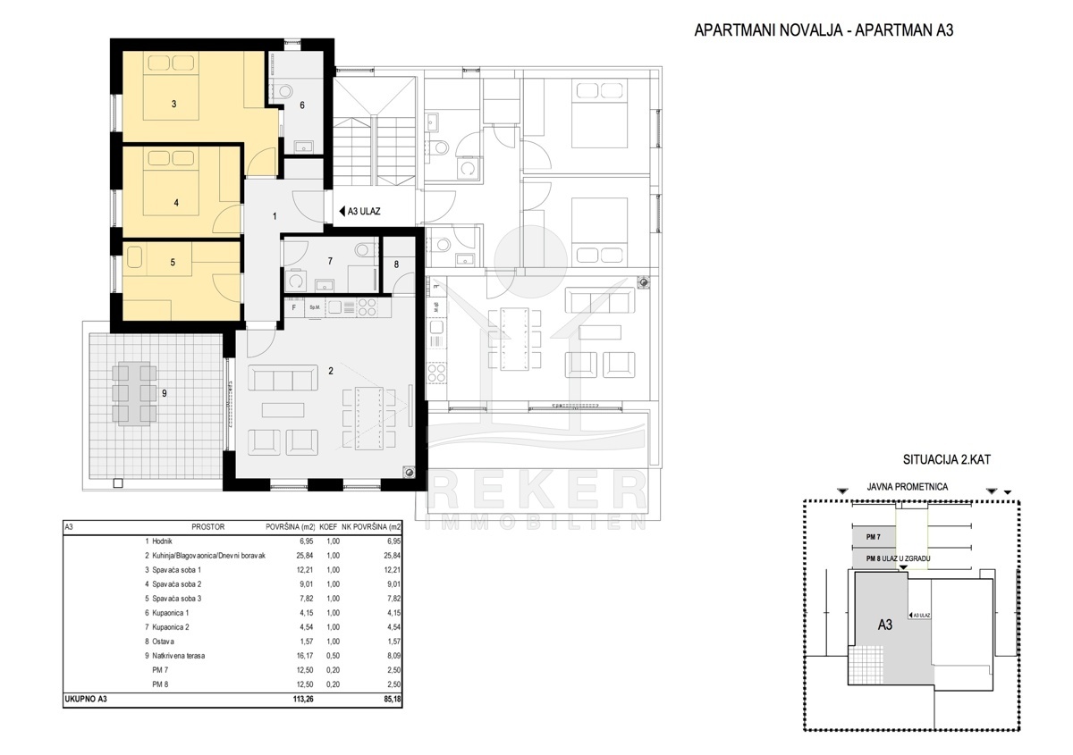 Das 85 m² große Apartment besticht durch seine gut durchdachte Raumaufteilung. Es umfasst eine geräumige Küche, ein gemütliches Esszimmer und ein einladendes Wohnzimmer. Zudem bietet es zwei Badezimmer, drei Schlafzimmer für erholsame Nächte, einen praktischen Abstellraum sowie einen Balkon mit einer wunderschönen Aussicht. Dieses Apartment ist der ideale Ort für Komfort und Entspannung.