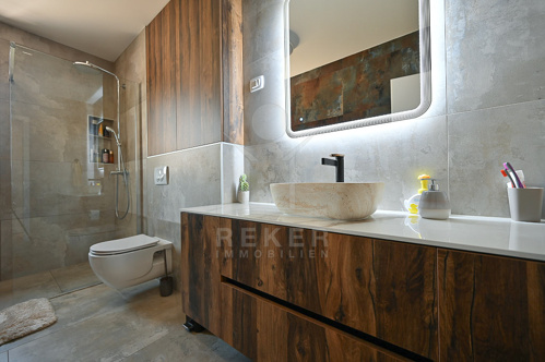 Im Inneren sorgt moderne Haustechnik für Komfort zu jeder Jahreszeit. Fußbodenheizung im Bad, Klimaanlagen in den übrigen Räumen und große PVC-Fenster mit viel Tageslicht schaffen eine angenehme Atmosphäre. Die Energieklasse A steht für Effizienz und niedrige Nebenkosten.