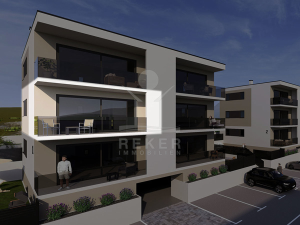 In einem der schönsten Viertel von Novi Vinodolski entsteht der Wohnkomplex. Ruhig gelegen, etwas erhöht über dem Ort, mit viel Grün drumherum. Der Blick auf das Meer und die umliegenden Inseln – großartig. Gleichzeitig sind Supermärkte, Cafés, Restaurants und Erholungsflächen ganz nah. Das historische Stadtzentrum ist in wenigen Minuten erreicht. Die fünf Gebäude fügen sich gut in die Umgebung ein. Jeweils vier Stockwerke: unten der Keller mit Lagerräumen, darüber drei Etagen mit je zwei Wohnungen. Alles hochwertig gebaut, mit solider Betonkonstruktion, wärmegedämmt, erdbebensicher. Rund ums Haus: gepflegte Wege, markierte Parkplätze, Grünflächen mit Zäunen, stimmungsvolle Beleuchtung.
