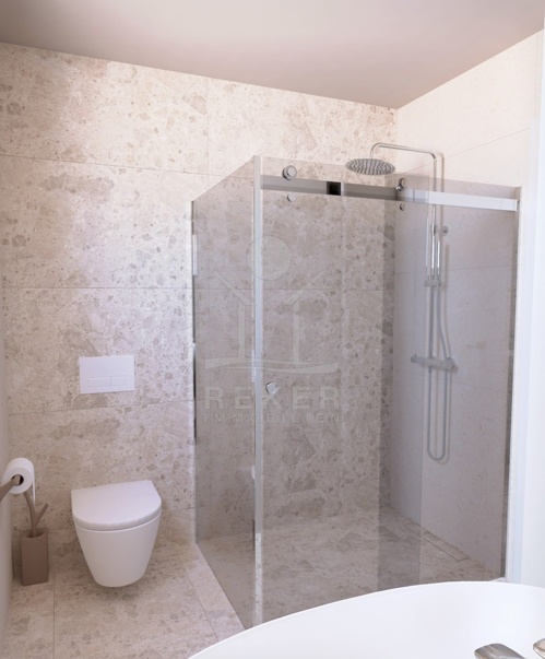 Diese Wohnung im ersten Obergeschoss bietet auf gut 58 m² alles, was man braucht – ohne Platz zu verschwenden. Der offene Wohnbereich mit Küche ist hell und freundlich. Durch die Glasfront geht’s direkt raus auf den Balkon – sonnig, ruhig, mit schönem Ausblick. Zwei Schlafzimmer, ein Bad mit Dusche, dazu viel Tageslicht und moderne Ausstattung. Fußbodenheizung, Klimaanlage, elektrische Rollläden, Moskitonetze, sichere Eingangstür, Videoüberwachung – alles da. Technik, die im Alltag wirklich hilft. Zur Wohnung gehört außerdem ein eigener Kellerabstellraum (Pflichtkauf: 2.000 €/m²) und ein Außenstellplatz direkt vor dem Haus (Pflichtkauf: 1.000 €/m²).