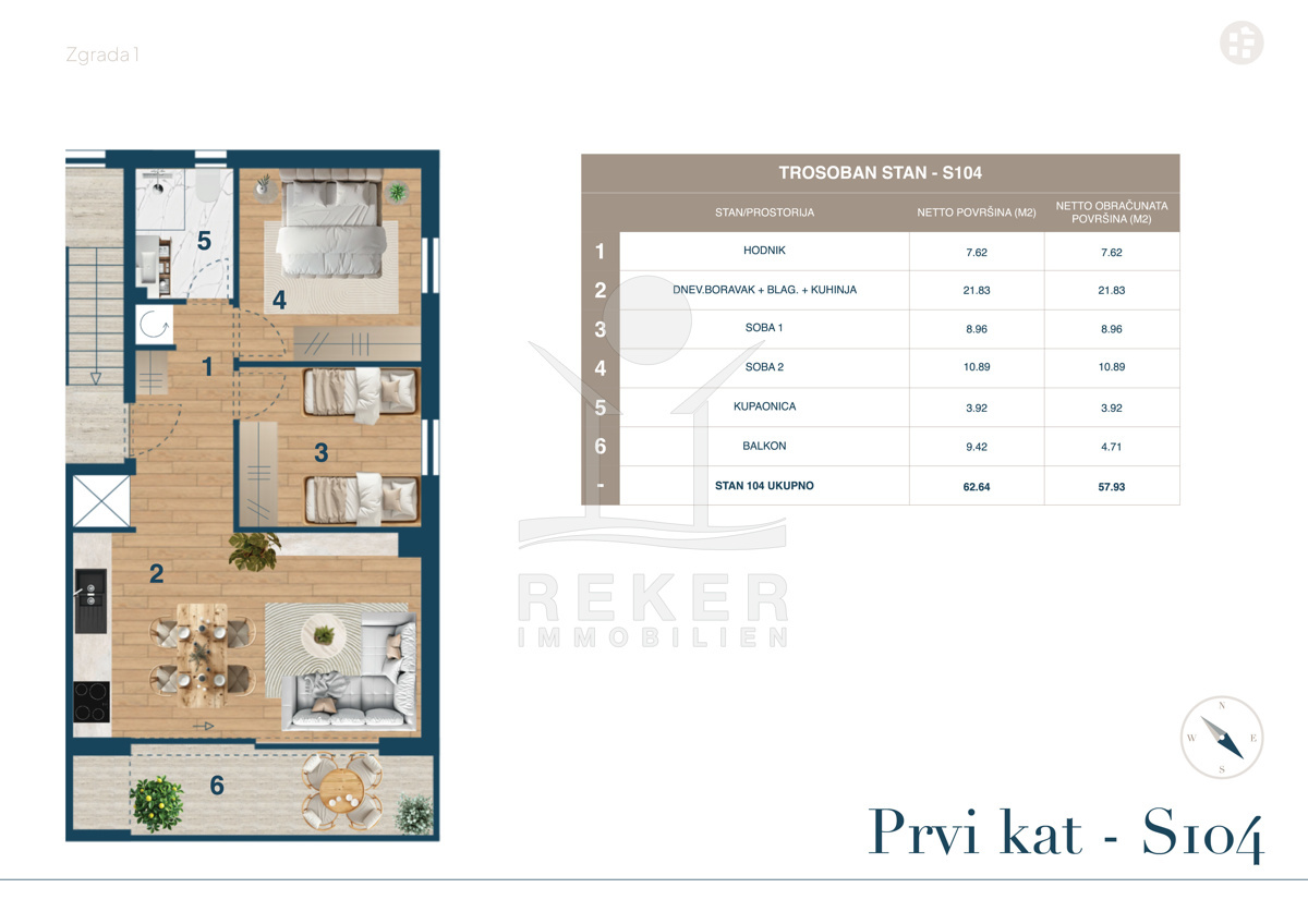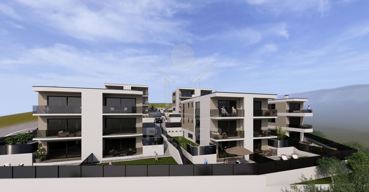 In einem der schönsten Viertel von Novi Vinodolski entsteht der Wohnkomplex. Ruhig gelegen, etwas erhöht über dem Ort, mit viel Grün drumherum. Der Blick auf das Meer und die umliegenden Inseln – großartig. Gleichzeitig sind Supermärkte, Cafés, Restaurants und Erholungsflächen ganz nah. Das historische Stadtzentrum ist in wenigen Minuten erreicht. Die fünf Gebäude fügen sich gut in die Umgebung ein. Jeweils vier Stockwerke: unten der Keller mit Lagerräumen, darüber drei Etagen mit je zwei Wohnungen. Alles hochwertig gebaut, mit solider Betonkonstruktion, wärmegedämmt, erdbebensicher. Rund ums Haus: gepflegte Wege, markierte Parkplätze, Grünflächen mit Zäunen, stimmungsvolle Beleuchtung.
