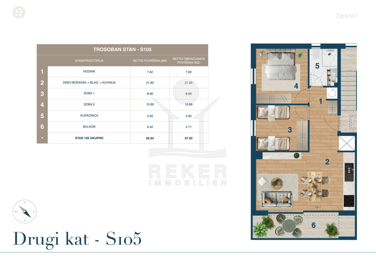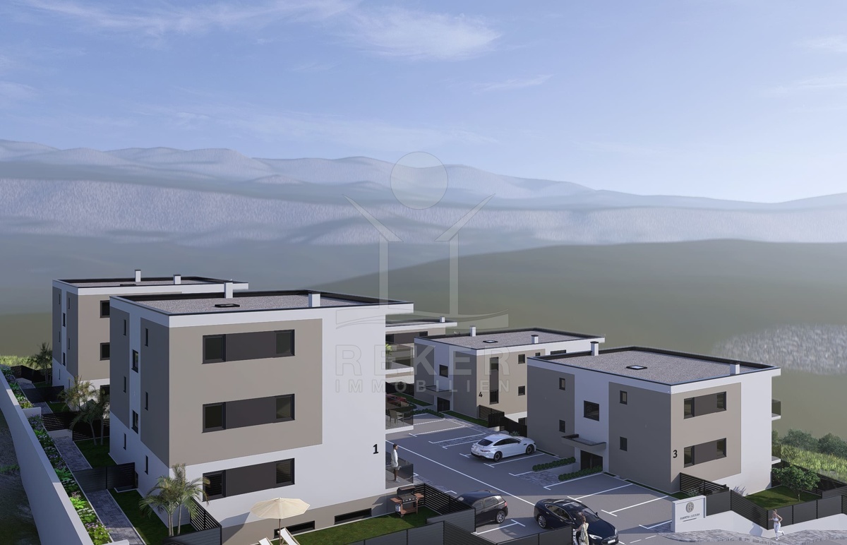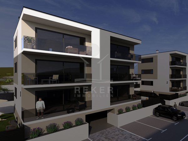In einem der schönsten Viertel von Novi Vinodolski entsteht der Wohnkomplex. Ruhig gelegen, etwas erhöht über dem Ort, mit viel Grün drumherum. Der Blick auf das Meer und die umliegenden Inseln – großartig. Gleichzeitig sind Supermärkte, Cafés, Restaurants und Erholungsflächen ganz nah. Das historische Stadtzentrum ist in wenigen Minuten erreicht. Die fünf Gebäude fügen sich gut in die Umgebung ein. Jeweils vier Stockwerke: unten der Keller mit Lagerräumen, darüber drei Etagen mit je zwei Wohnungen. Alles hochwertig gebaut, mit solider Betonkonstruktion, wärmegedämmt, erdbebensicher. Rund ums Haus: gepflegte Wege, markierte Parkplätze, Grünflächen mit Zäunen, stimmungsvolle Beleuchtung.